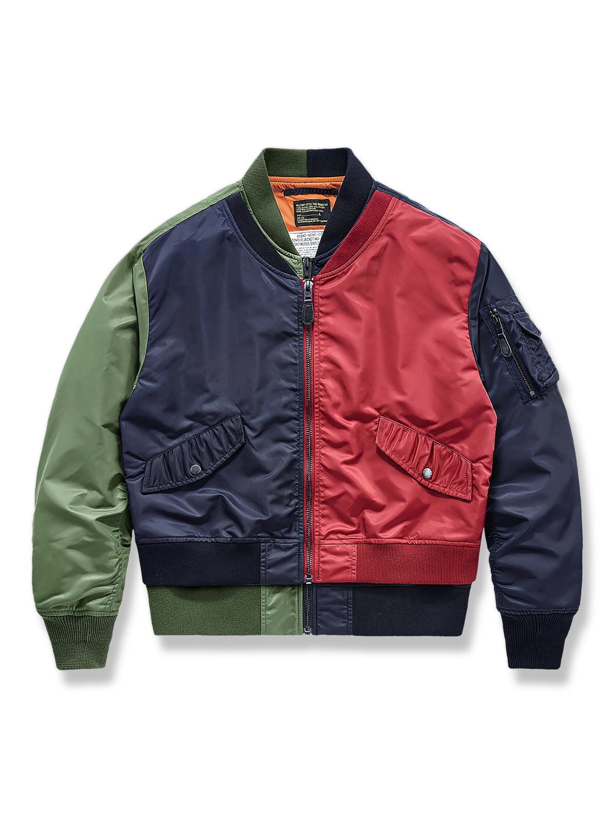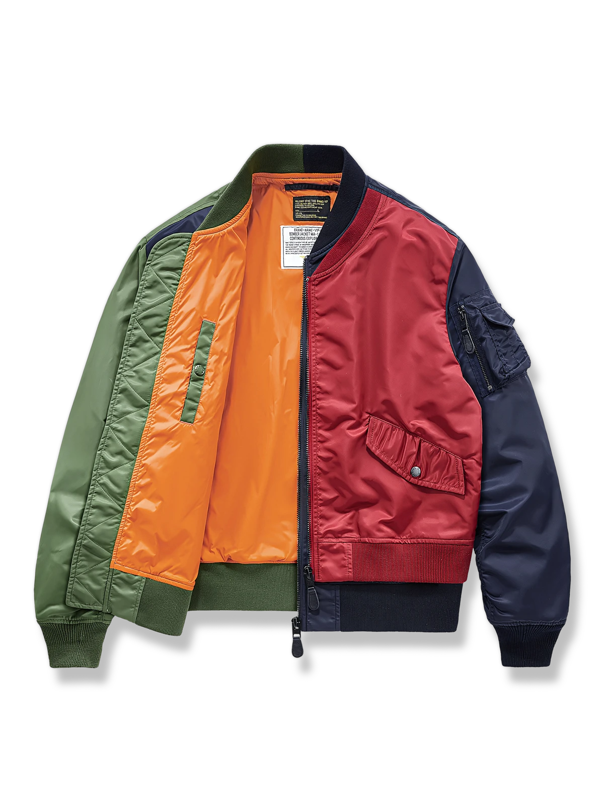 このフェイクレイヤード フライトジャケットは、鮮やかな色の組み合わせで、モダンなファッションとレトロスタイルの融合を表現しています。パイロットジャケットは軍事用途から始まり、飛行士に必要な保温性と携帯性を提供しました。時が経つにつれて、このスタイルは一般のファッション分野に入り、トレンドカルチャーの象徴的な要素になりました。