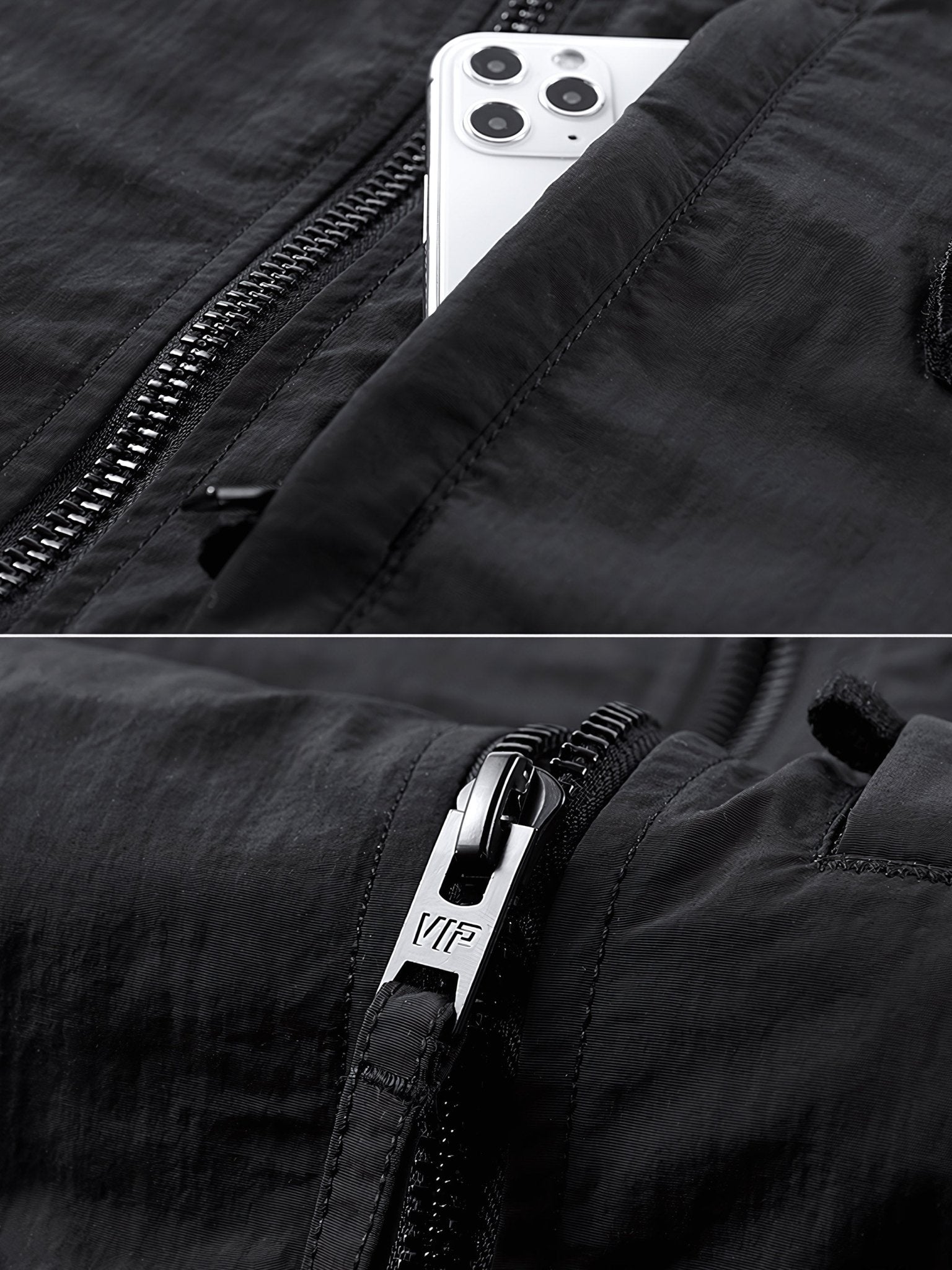 防水加工ナイロン生地は摩耗に強く風を防ぐ性能を持っており、優れた保温性を提供します。この生地はジャケットの快適さと耐久性を確保し、さまざまな場面で着用するのに適しています。