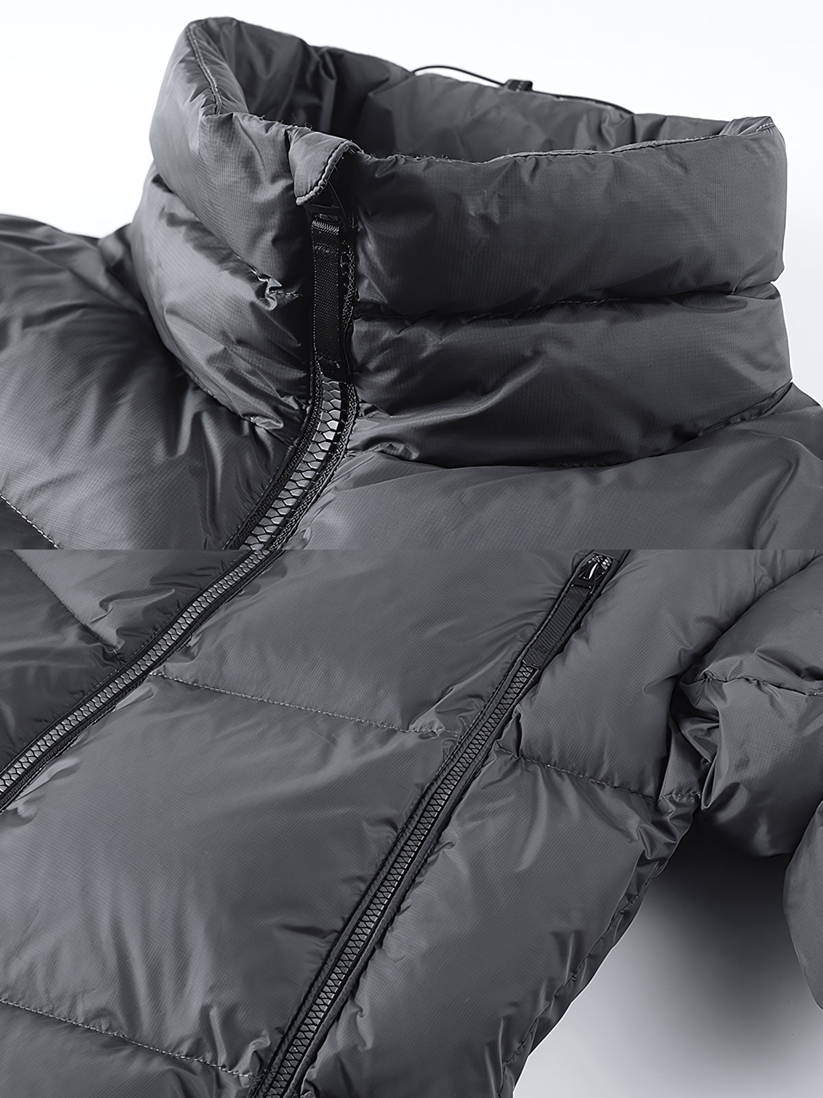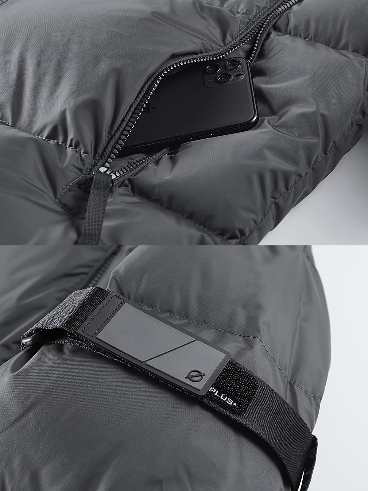ジャケットは85%のダウン含有率の白ダウンを使用します。外層の素材は特殊加工が施されており、ある程度の防風・防水機能を備え、変わりやすい都市の気候に適応します。