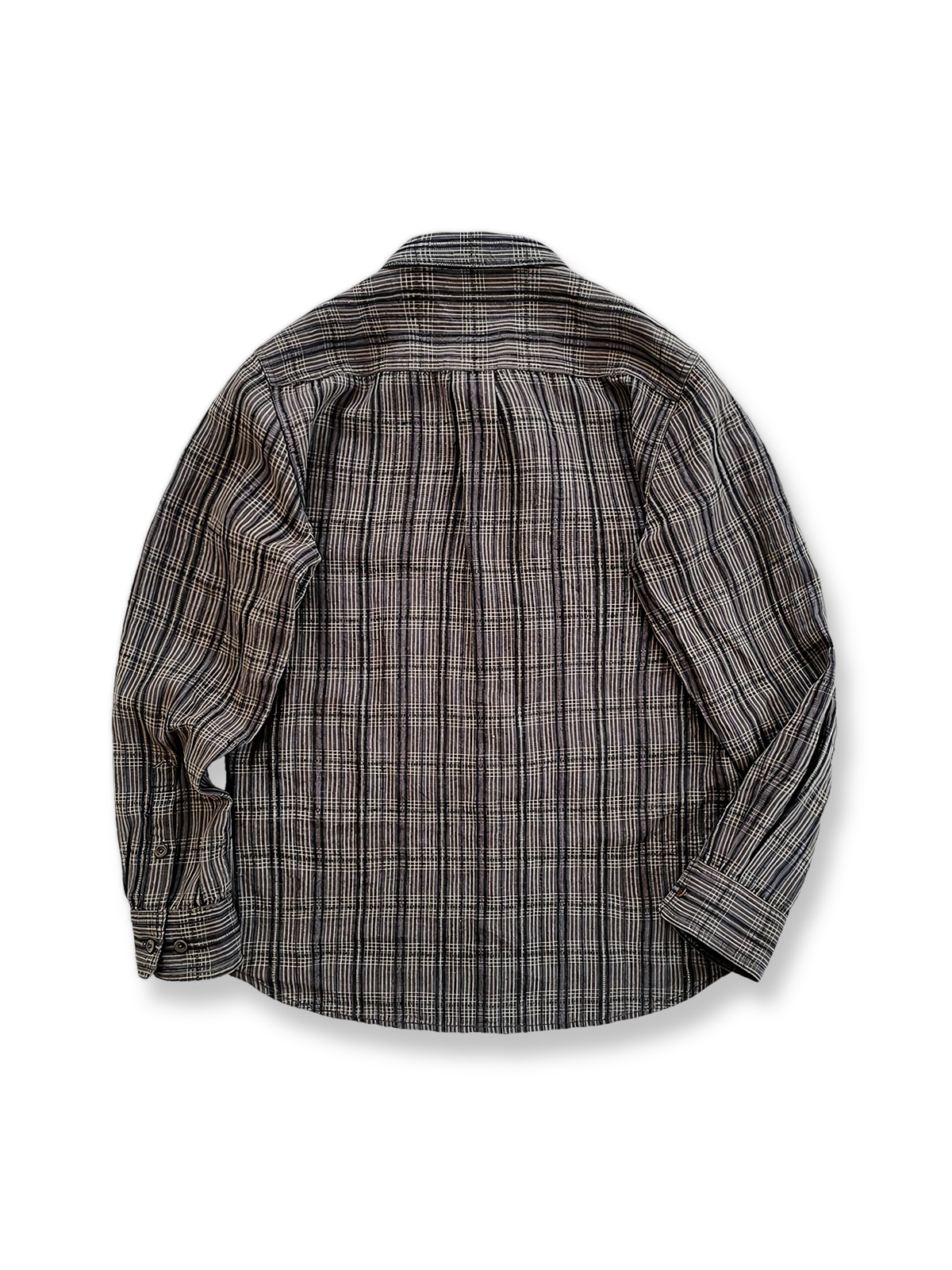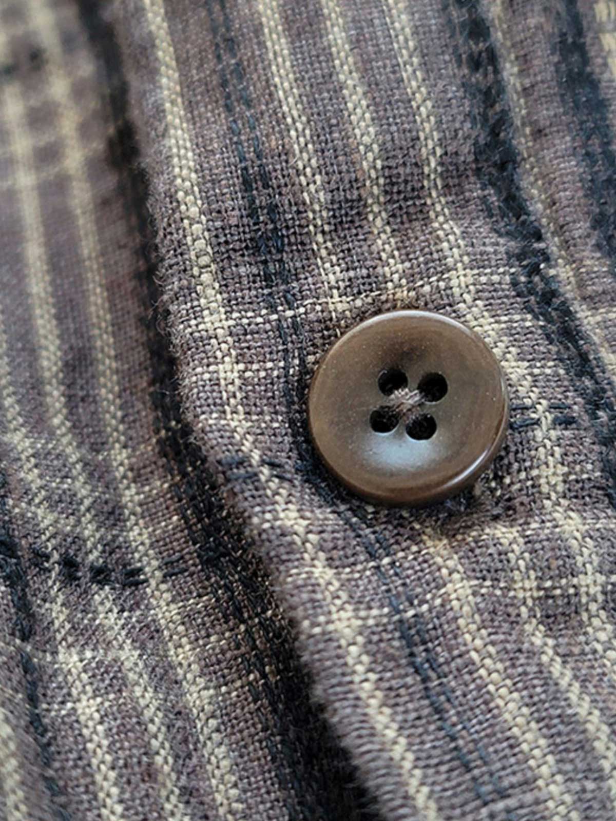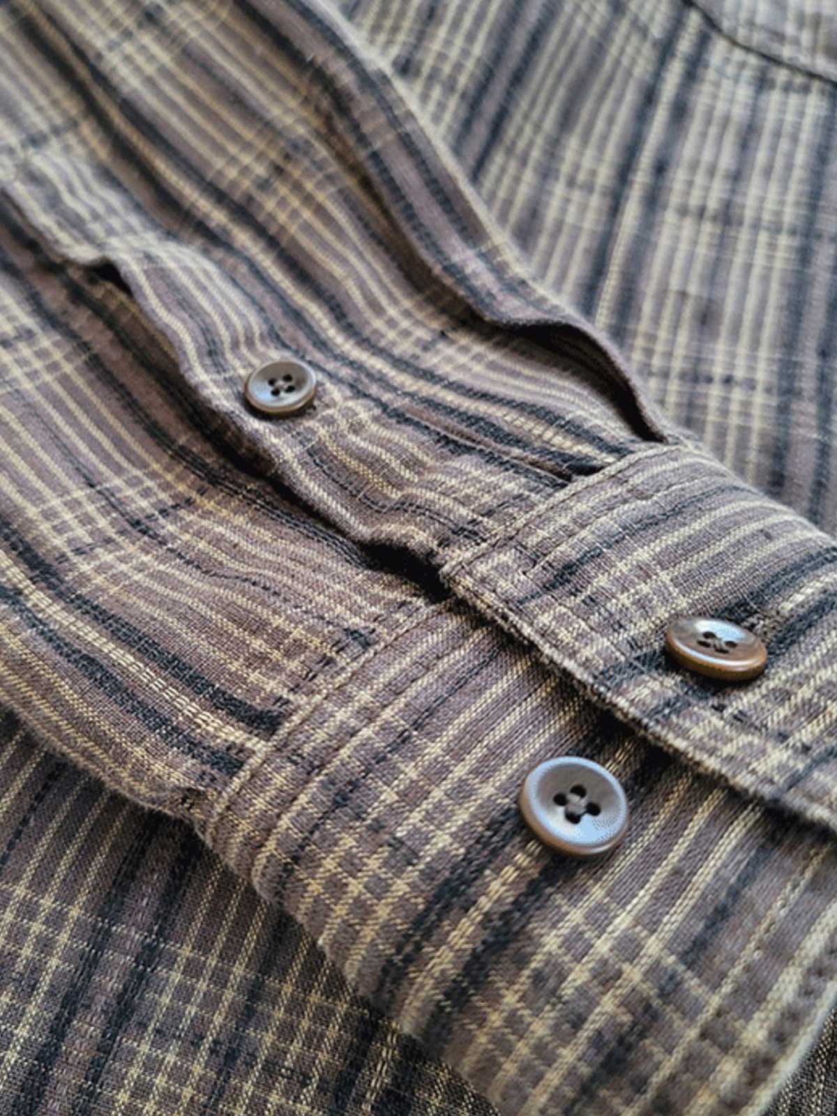 リネン素材とチェックストライプデザインで、ゆったりとした快適な着心地を提供するヴィンテージシャツ。