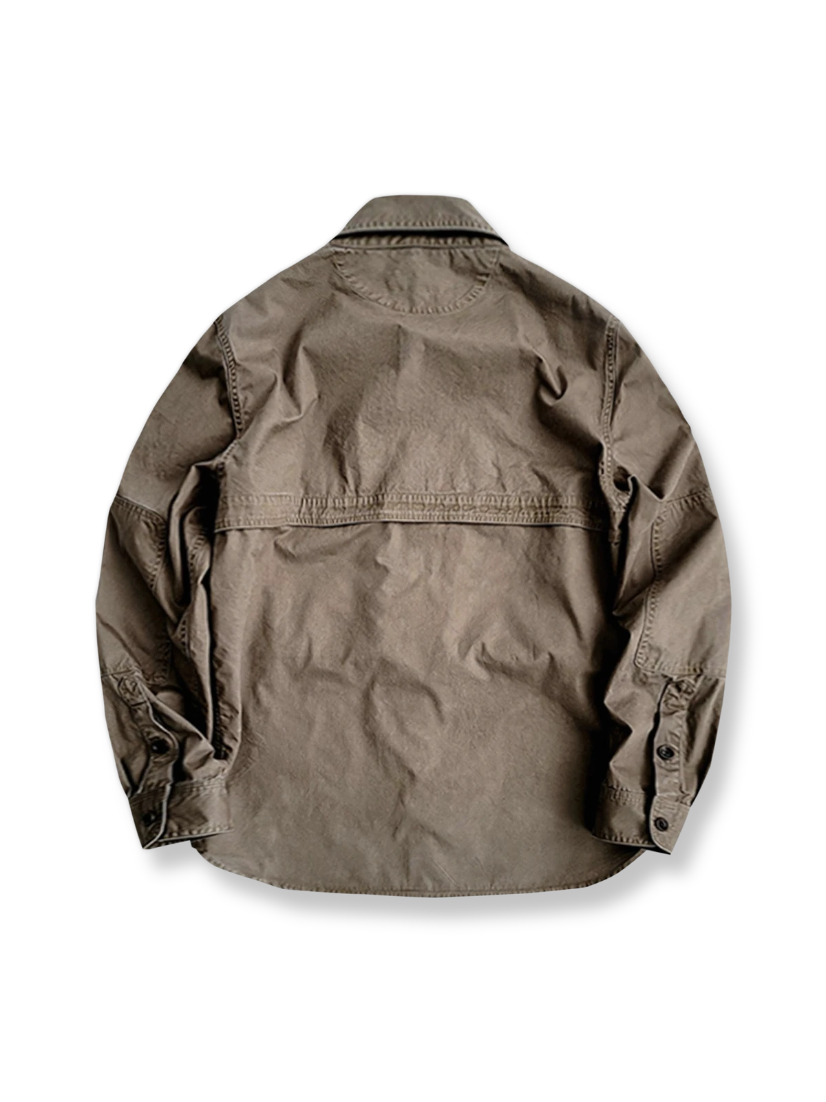 実用性とスタイルを兼ね備えた大口ポケット付き長袖ワークシャツ。日常やアウトドアに最適な一着。