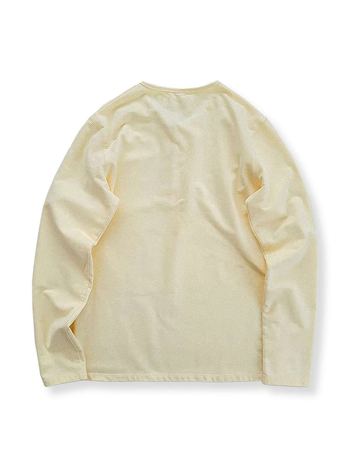 シンプルで上品な米色のヘンリーネック長袖Tシャツ、肌に優しいコットン素材で快適な着心地。