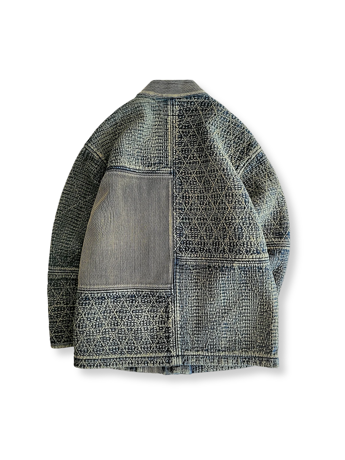 このはんてんは、伝統的な藍染刺し子パッチワーク技法を使用し、異なるテクスチャーの生地を組み合わせています。水洗いバツ染めと経年加工を施すことで、深みのある歴史感と独自の質感が際立っています。ゆったりとしたシルエットとクラシックなはんてんのデザインが特徴で、日常のコーディネートに最適であり、豊かな文化的背景を感じさせます。インナーとしてもアウターとしても使用でき、このはんてんはヴィンテージスタイルを好む男性にぴったりです。