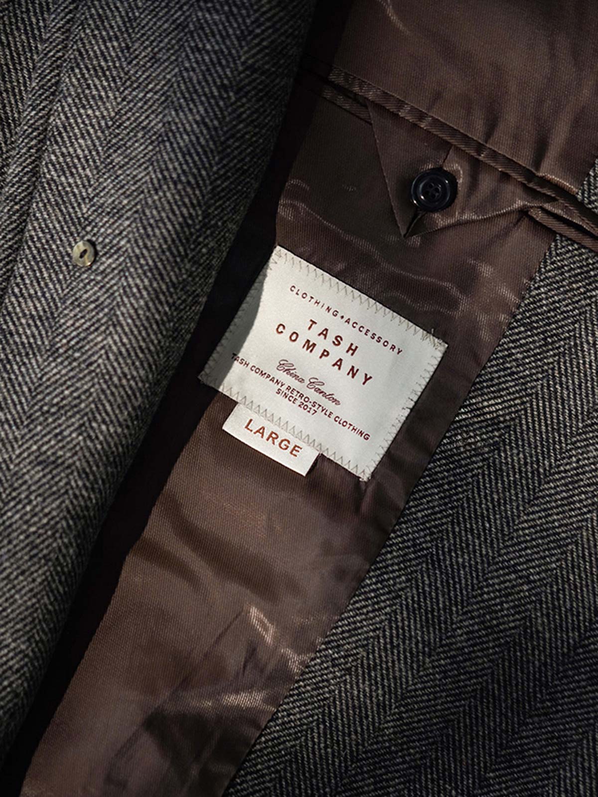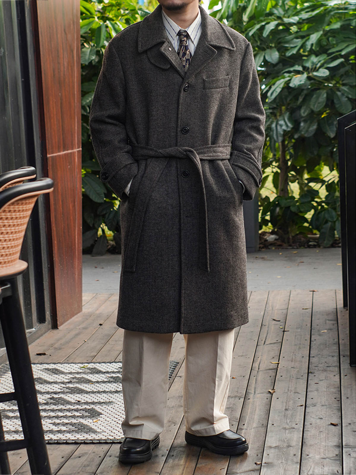 クラシックなヴィンテージヘリンボーンパターンを採用したバルマカーンコート。760gのウール生地で秋冬の暖かさを提供。