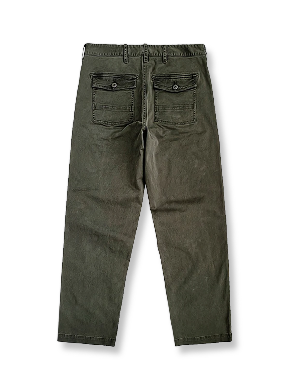 このワークパンツは、暗めのミリタリーグリーンを基調に、ヴィンテージ感のあるウォッシュ加工を施し、自然な風合いを持たせています。多ポケットデザインにより、実用性と立体感のあるデザインが特徴です。コットンとポリウレタンの混紡素材を使用しており、軽いストレッチ性があり、快適な着用感を提供します。動きやすさも兼ね備えており、日常使いからアウトドア活動まで幅広く活躍するアイテムです。