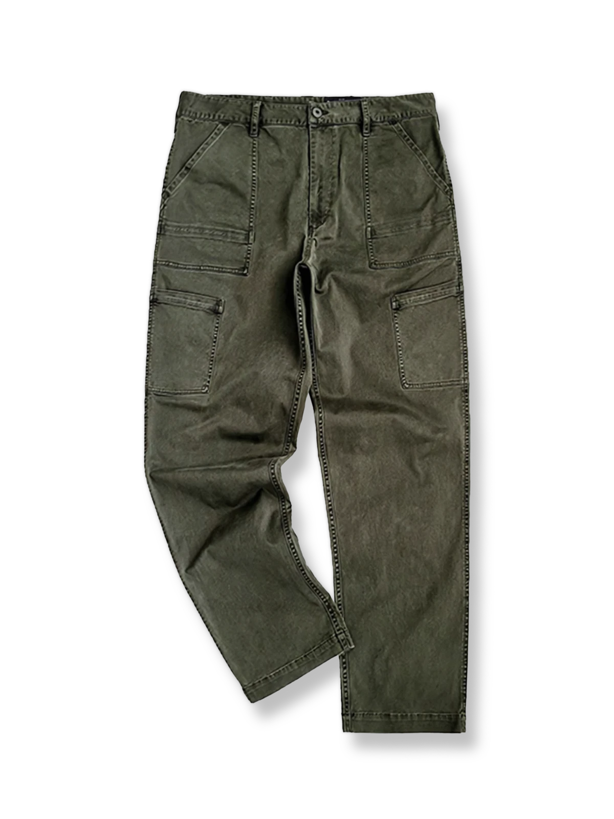 クラシックなウォッシュ加工と多ポケットデザインが融合し、ミリタリーグリーンのレトロなカジュアルスタイルを演出する一着。