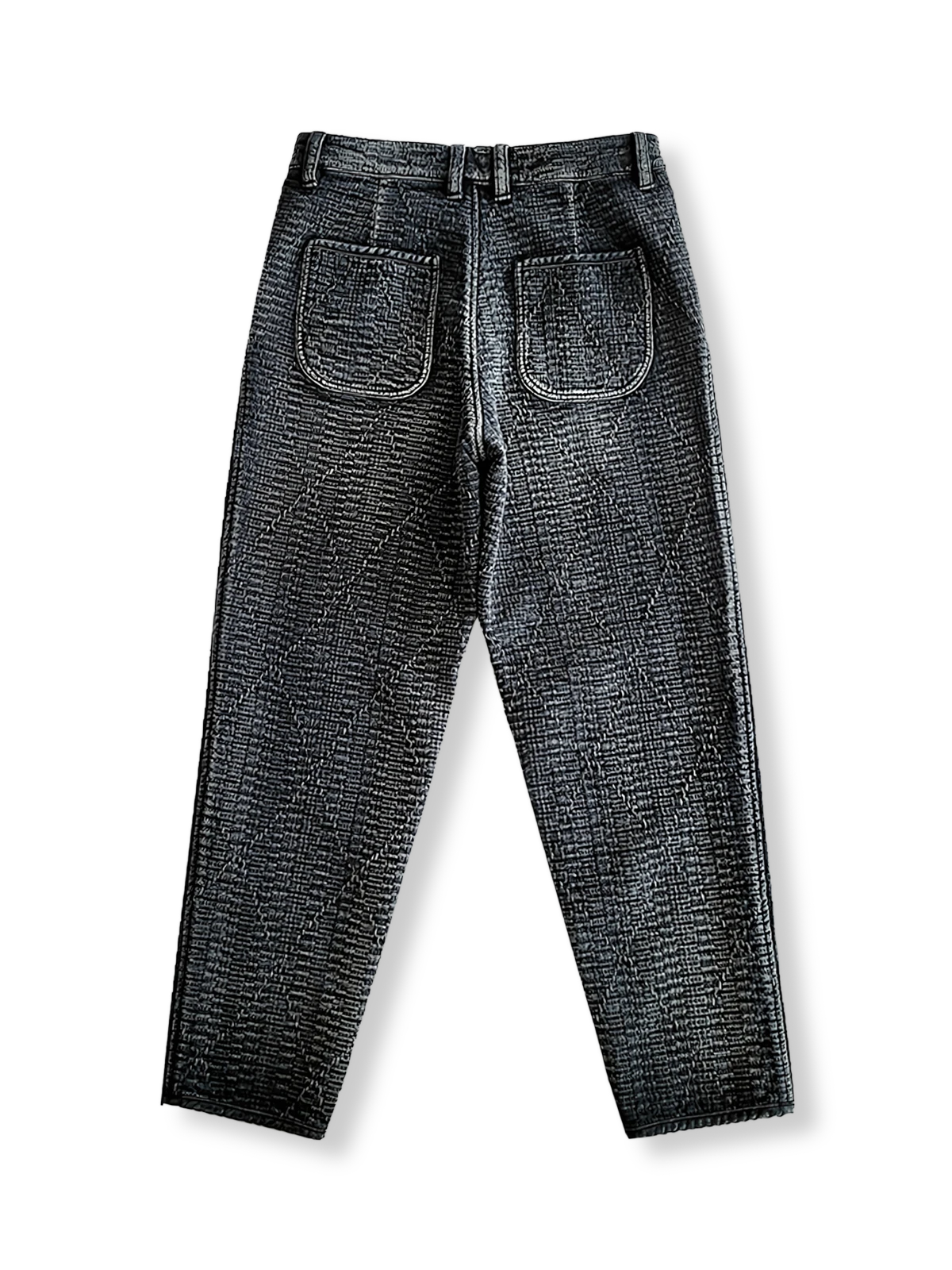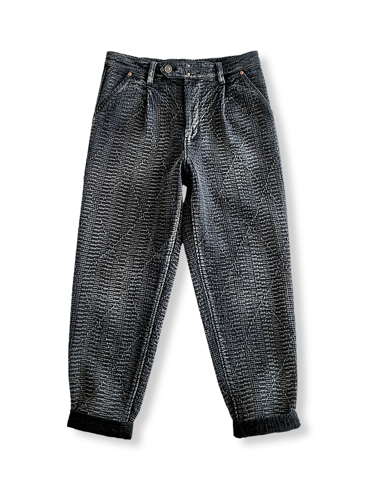刺し子織りの生地とビンテージな抜染技術が融合したスリムフィットパンツで、独特な質感と洗練されたヴィンテージ感を演出する一着。