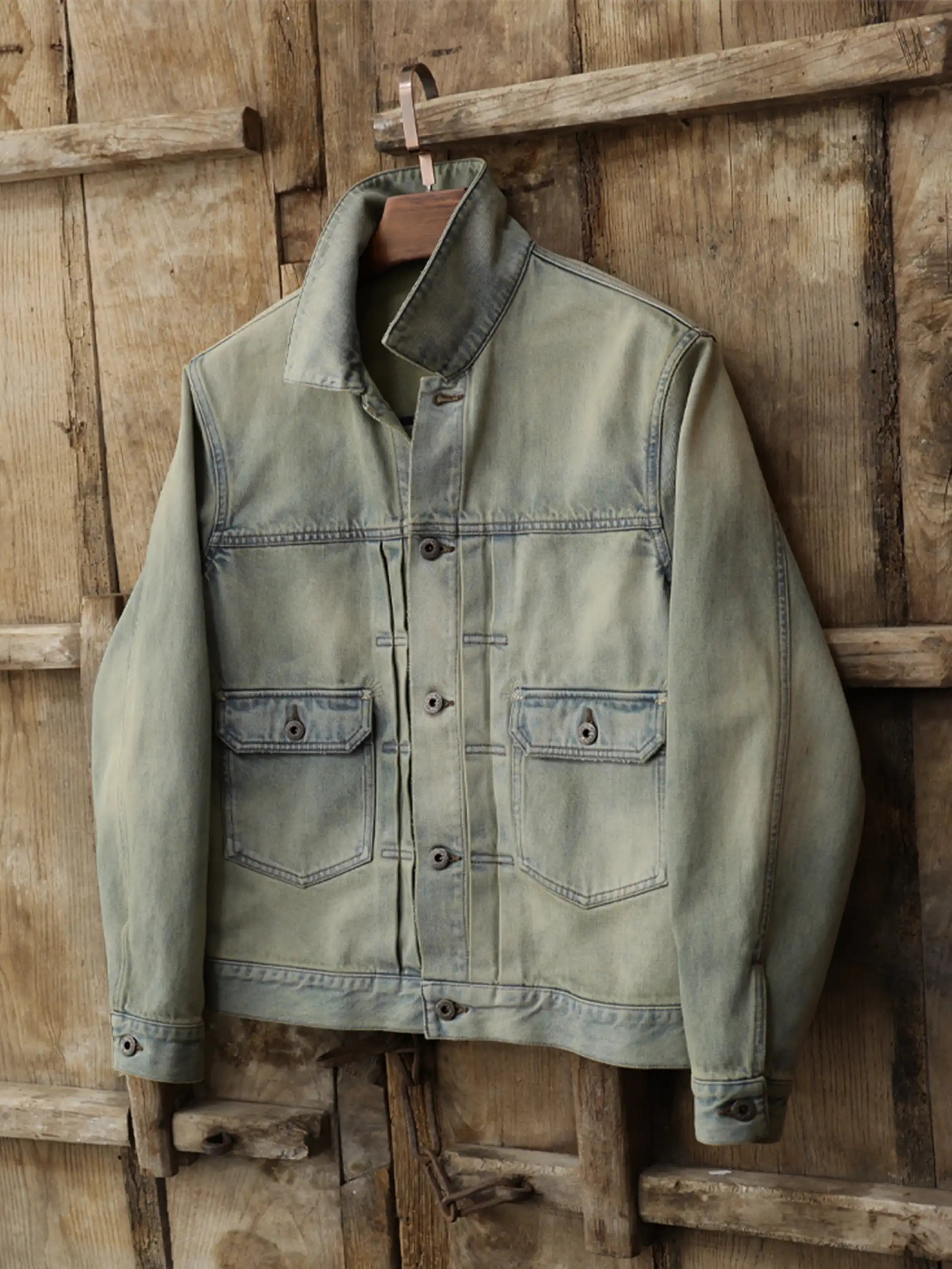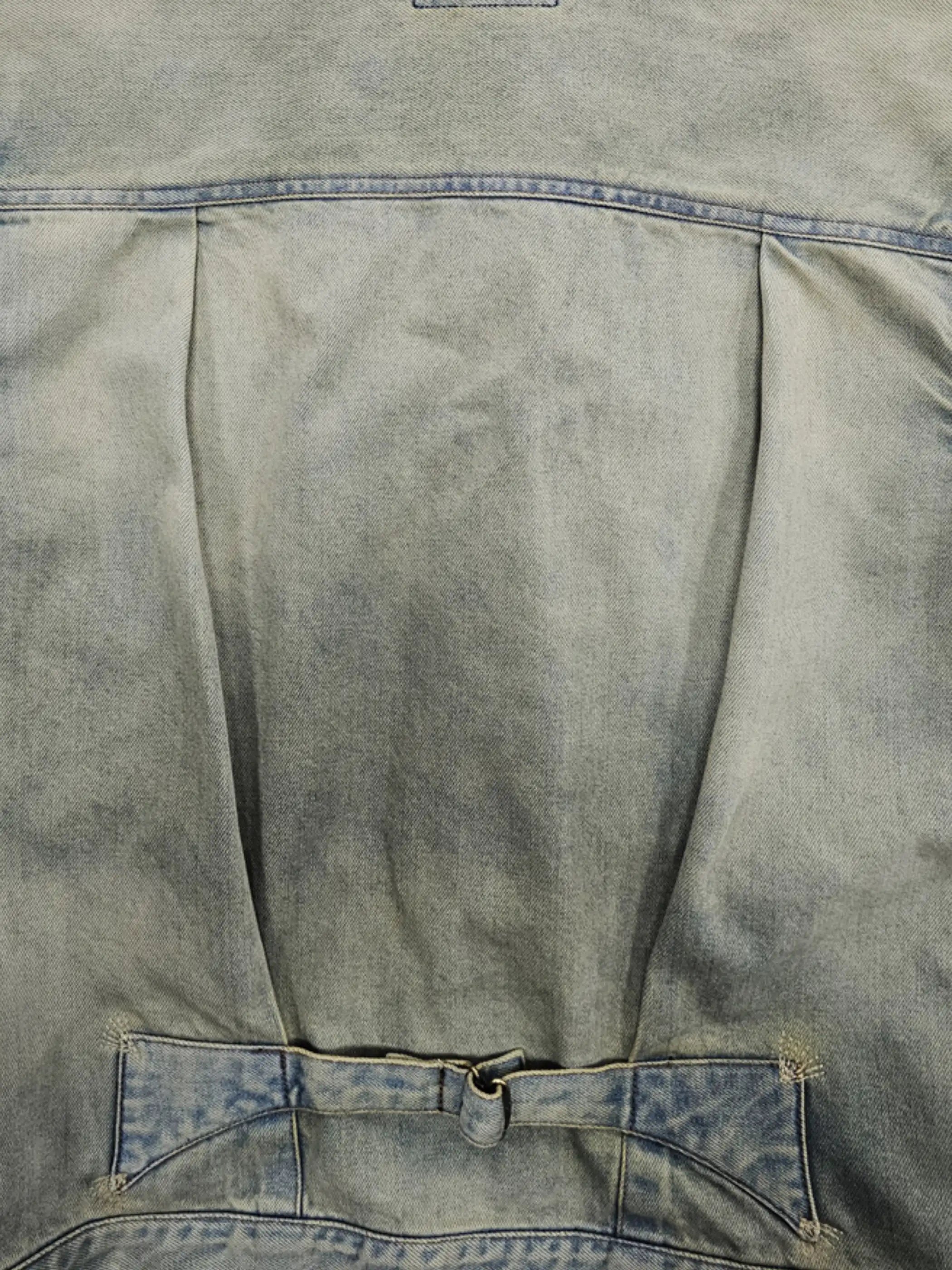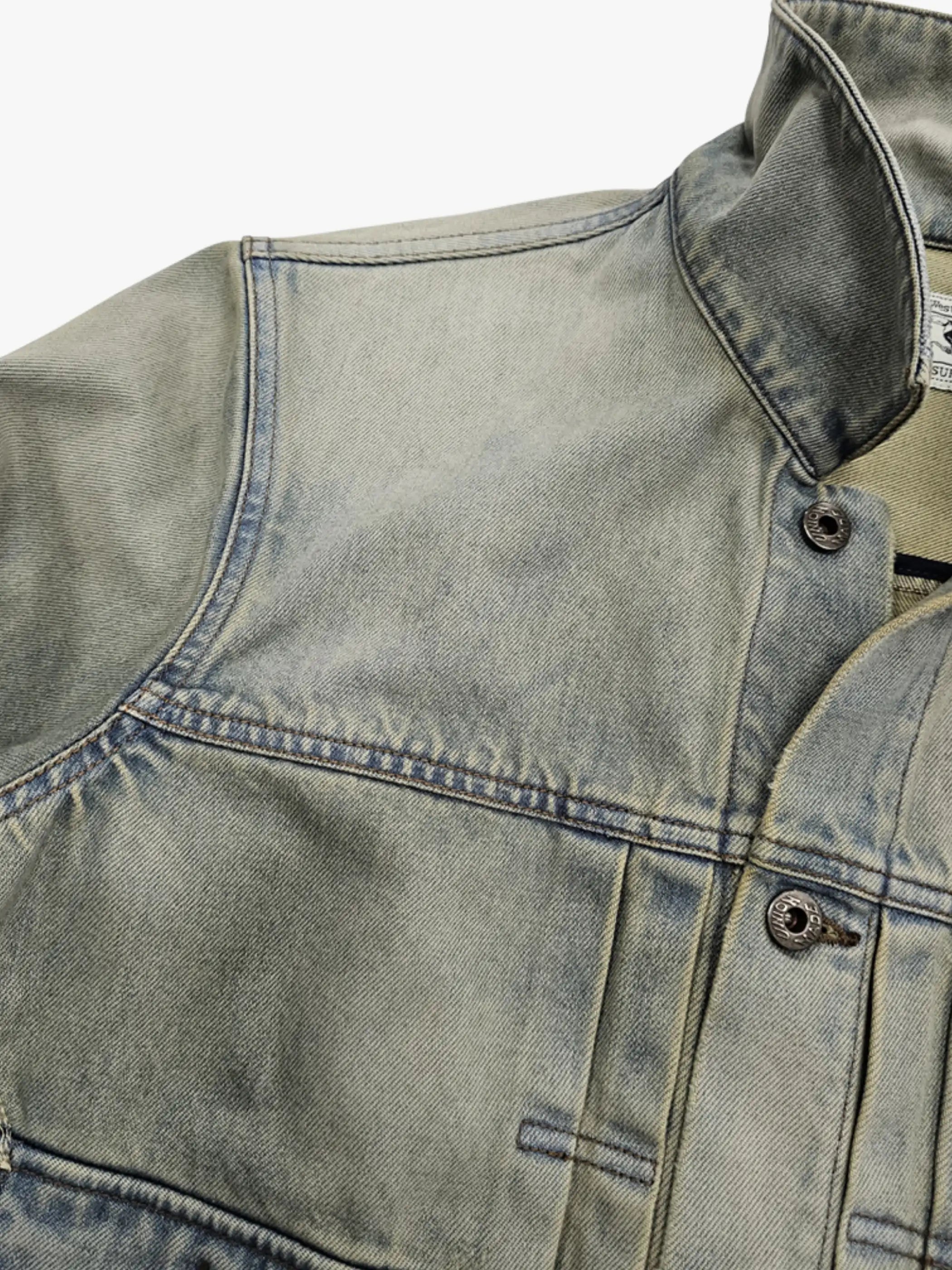14.5オンスの上質デニムを使用し、特殊なウォッシュ加工と手作業による絶妙なエイジング処理で、リアルなヴィンテージ感を再現。50年代のLevi's 507XXタイプⅡジャケットをベースに、両胸にクラシカルなフラップ付きポケット、腰回りには調節可能なベルトを配置。日本製UNION MADEのダブルピン工字ボタンがディテールに質感を加え、こだわりの強いヴィンテージ愛好者を満足させる逸品。