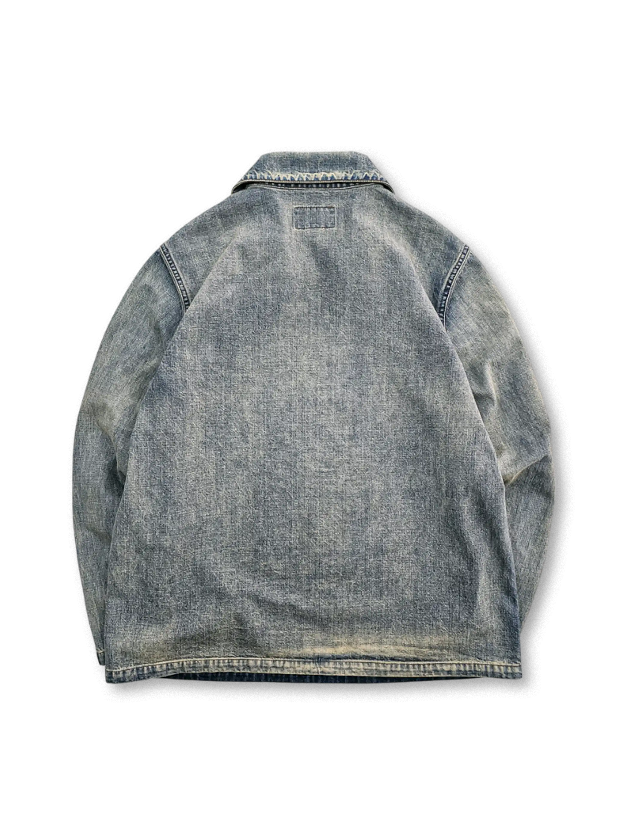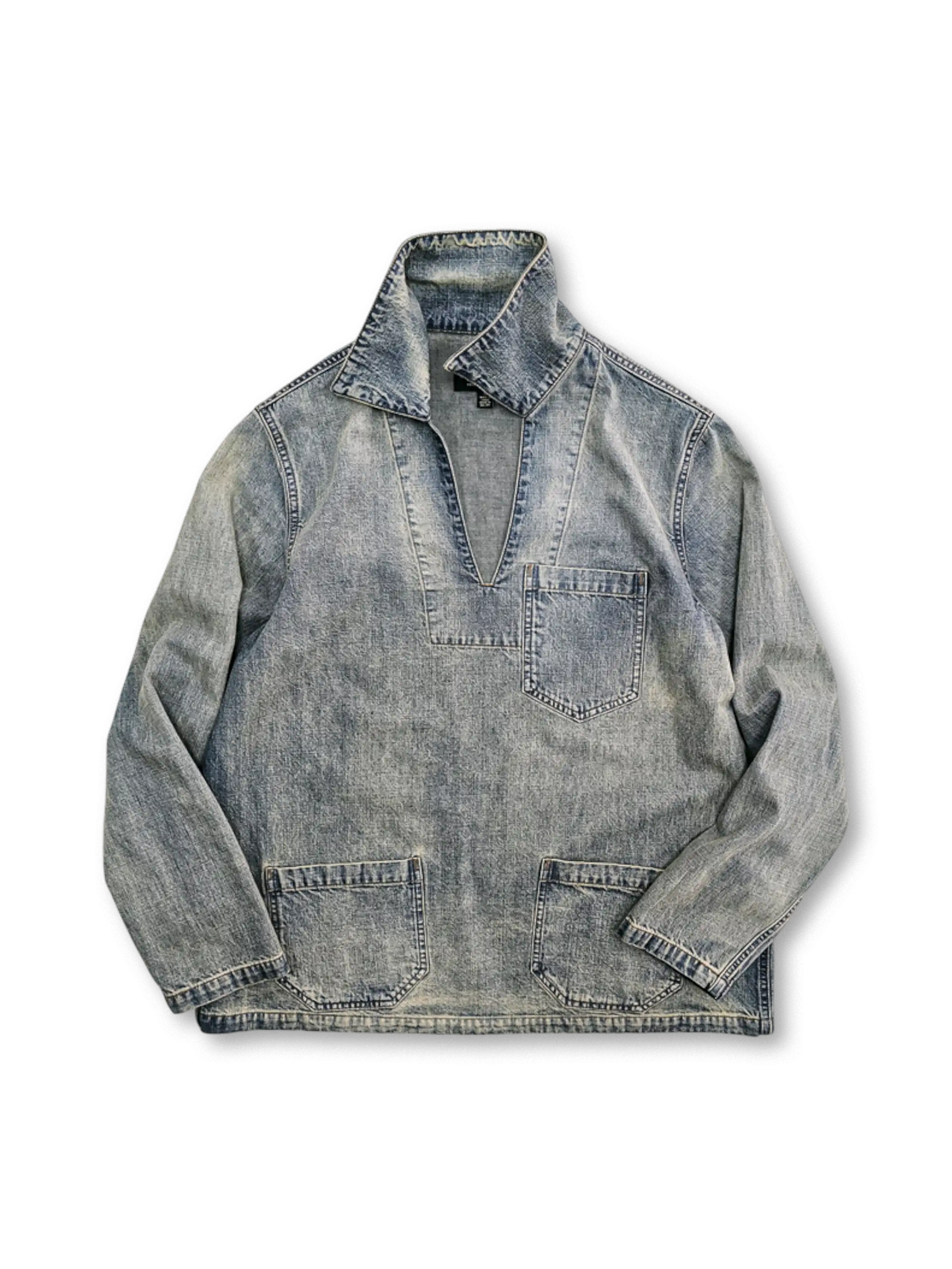 Vネックとクラシックポケットが特徴の、9.5オンス全綿デニム生地を使用した洗い加工済みヴィンテージワークシャツ。