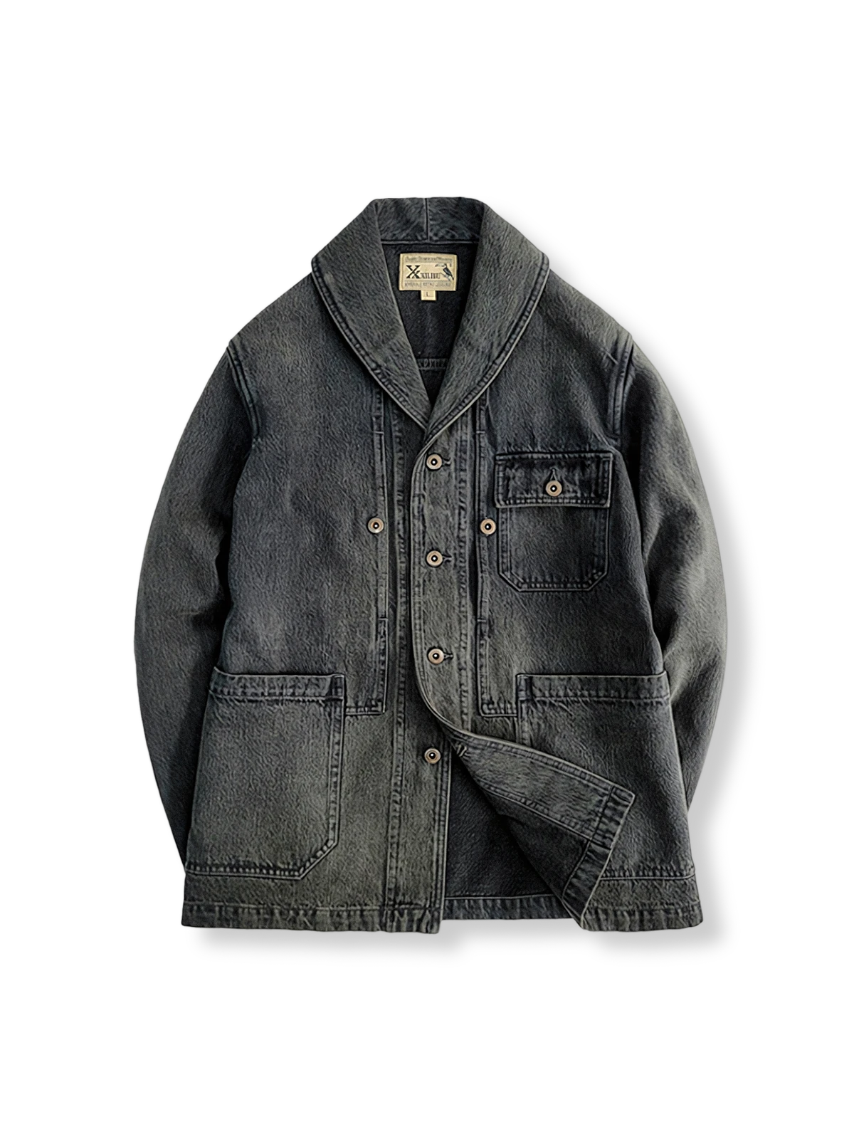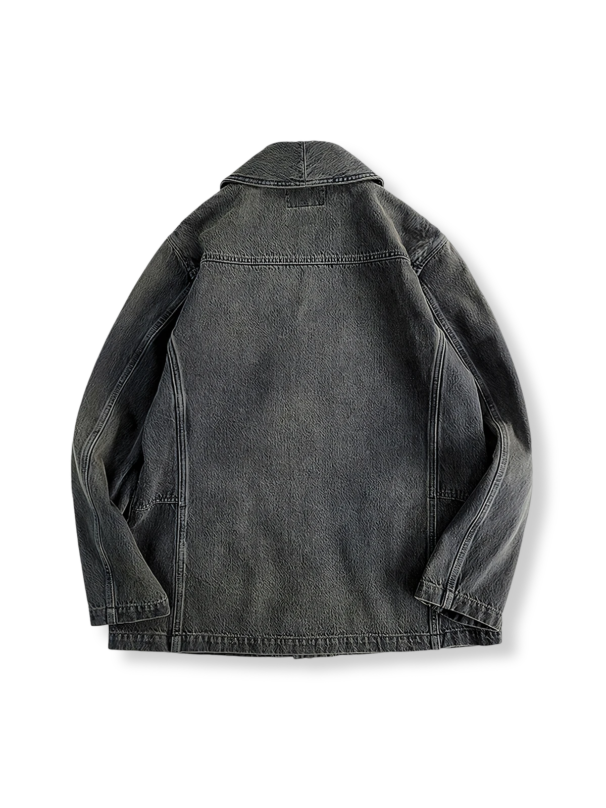 ヴィンテージウォッシュ加工と硫化黒染めを施した、ユニークな青果襟デザインが特徴のデニムワークジャケット。