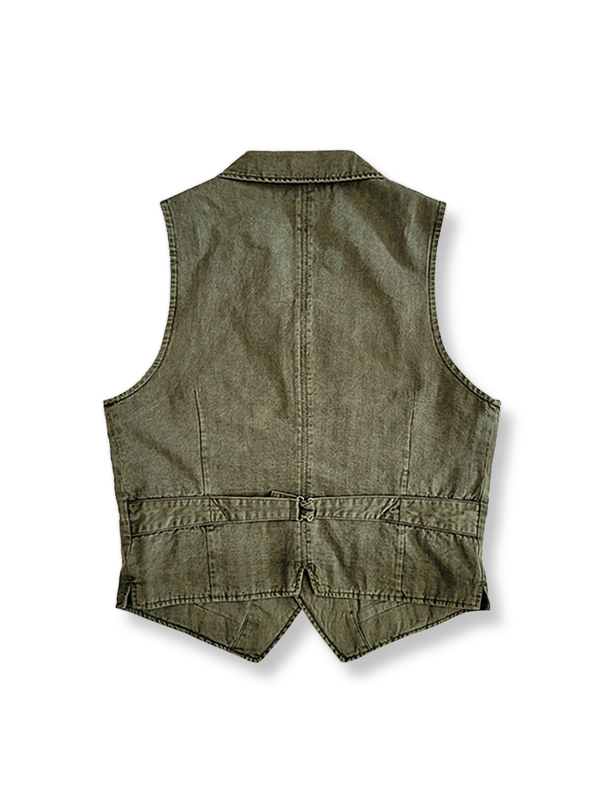 アーミーグリーンのクラシックなデザインで、100%コットンのヘリンボーンテーラードカラーベスト。