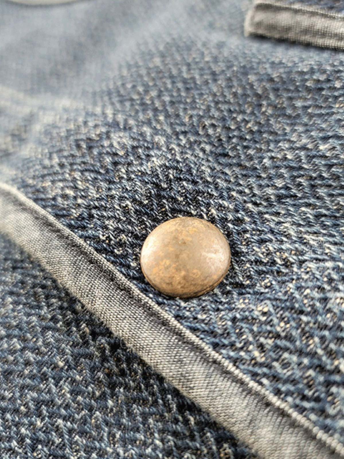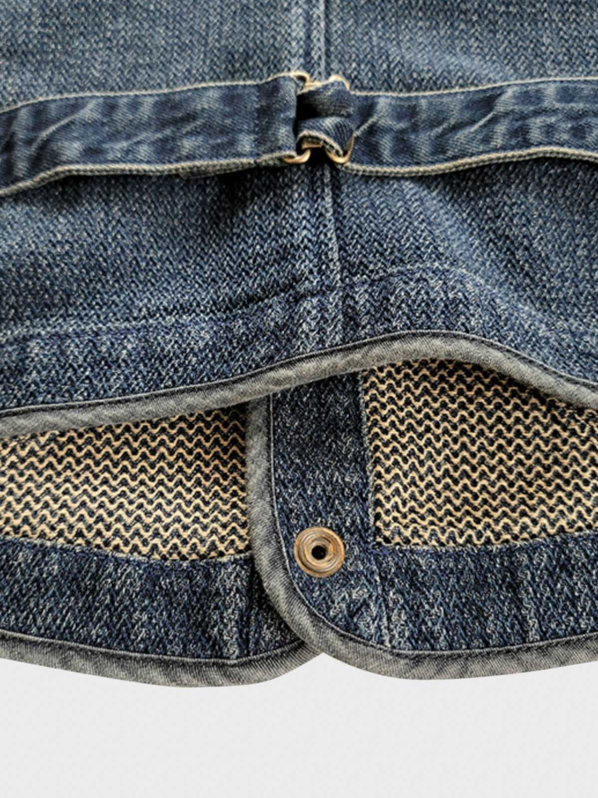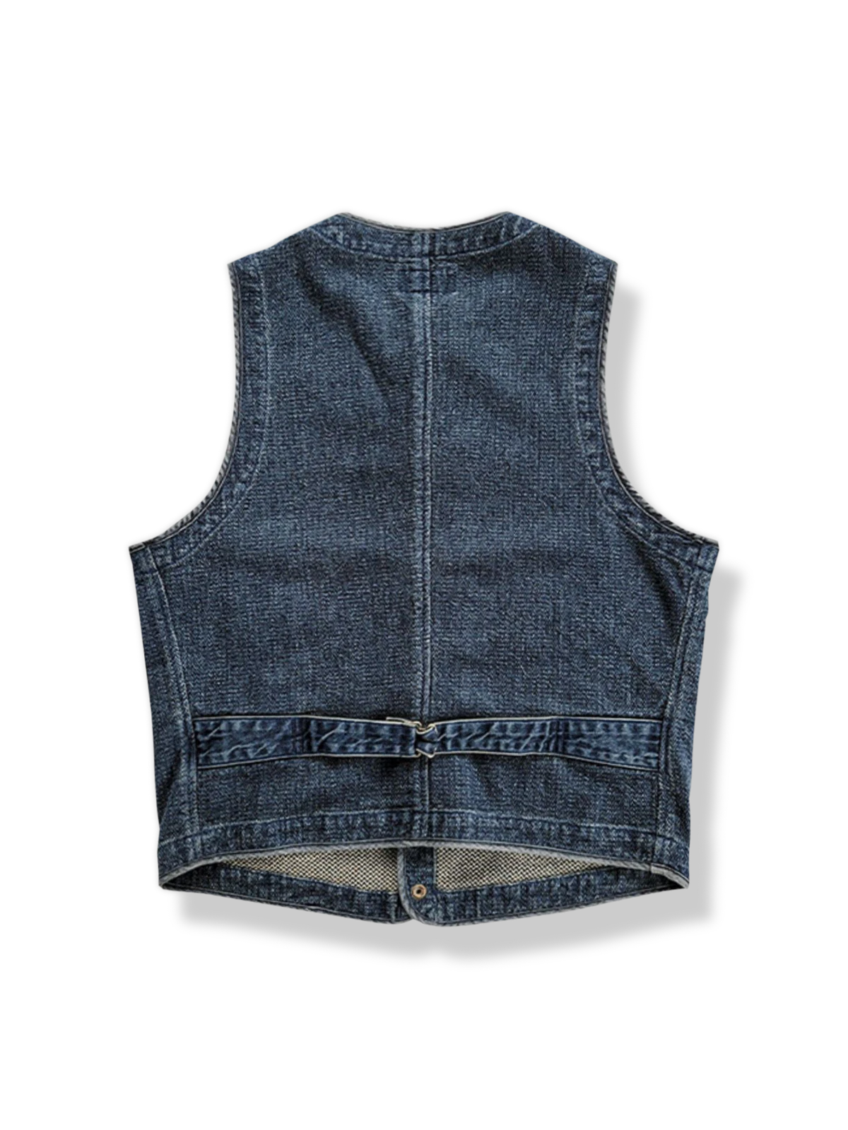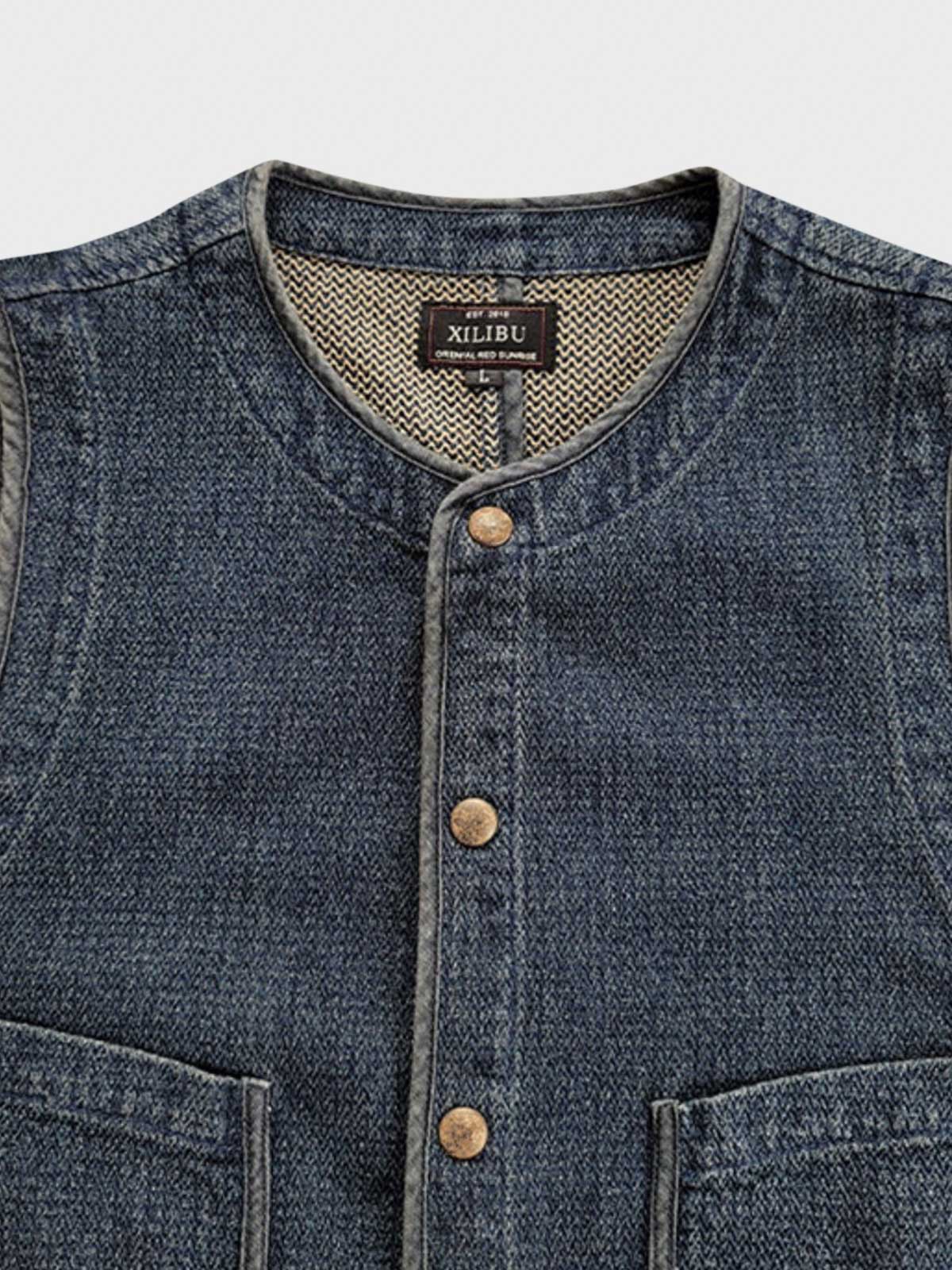 高品質のデニム生地を使用し、特殊な加工により耐久性があり、色褪せにくい特徴を持っています。典型的なダブルステッチ技術により、ベスト全体の耐久性を向上させています。大型のパッチポケットと金属ボタンのディテールは、実用的でありながら、ヴィンテージスタイルの特徴も強調しています。