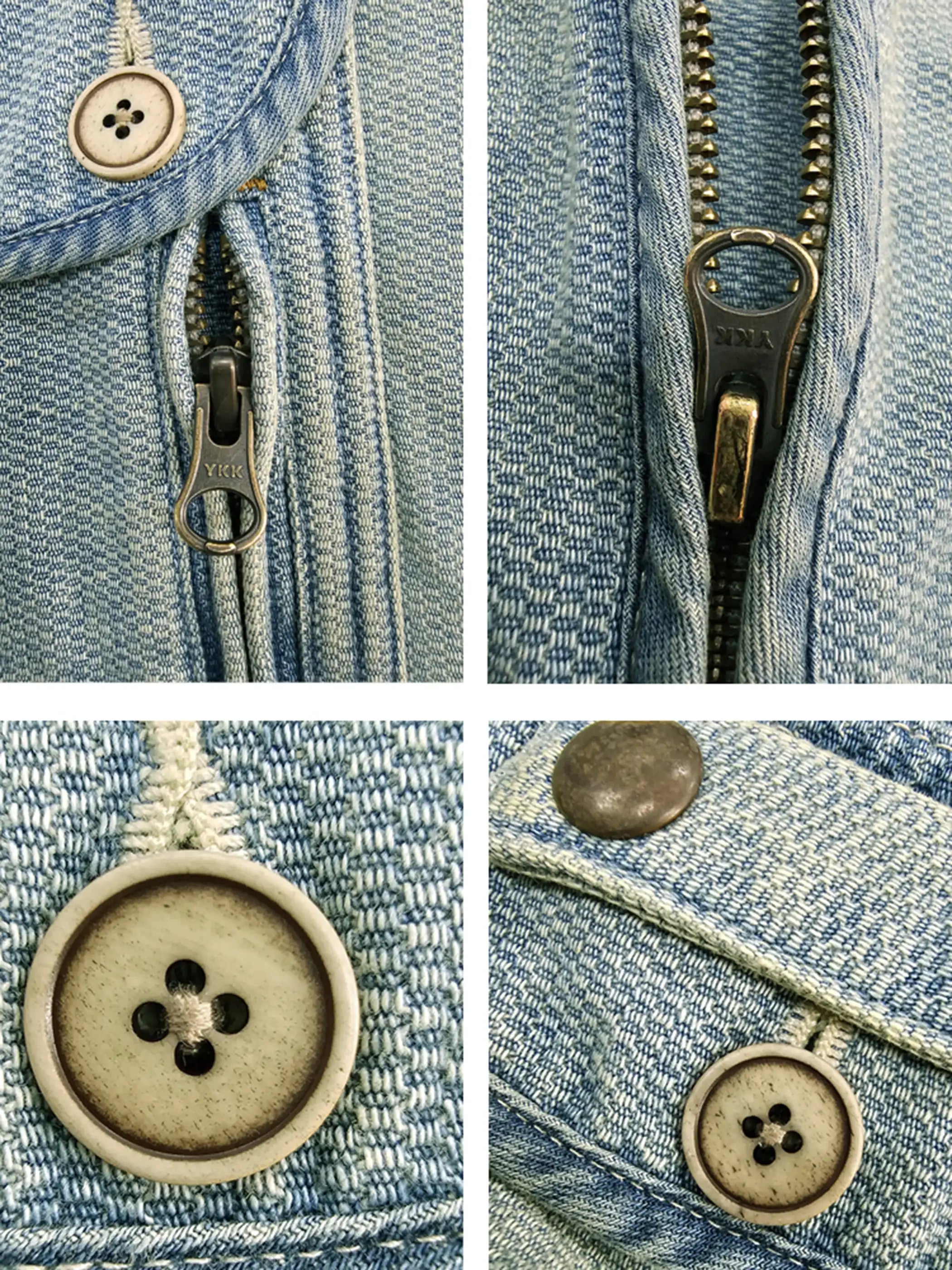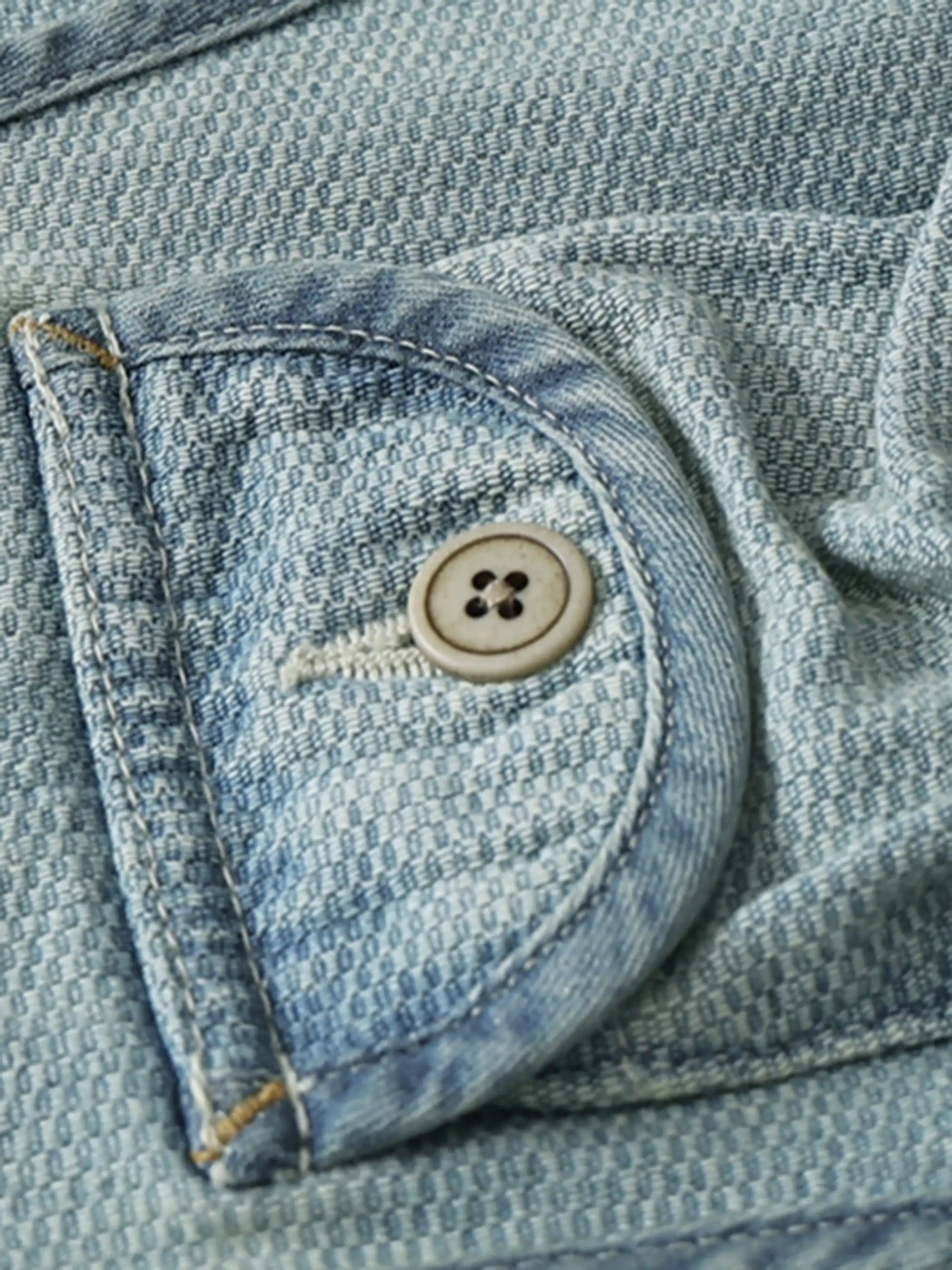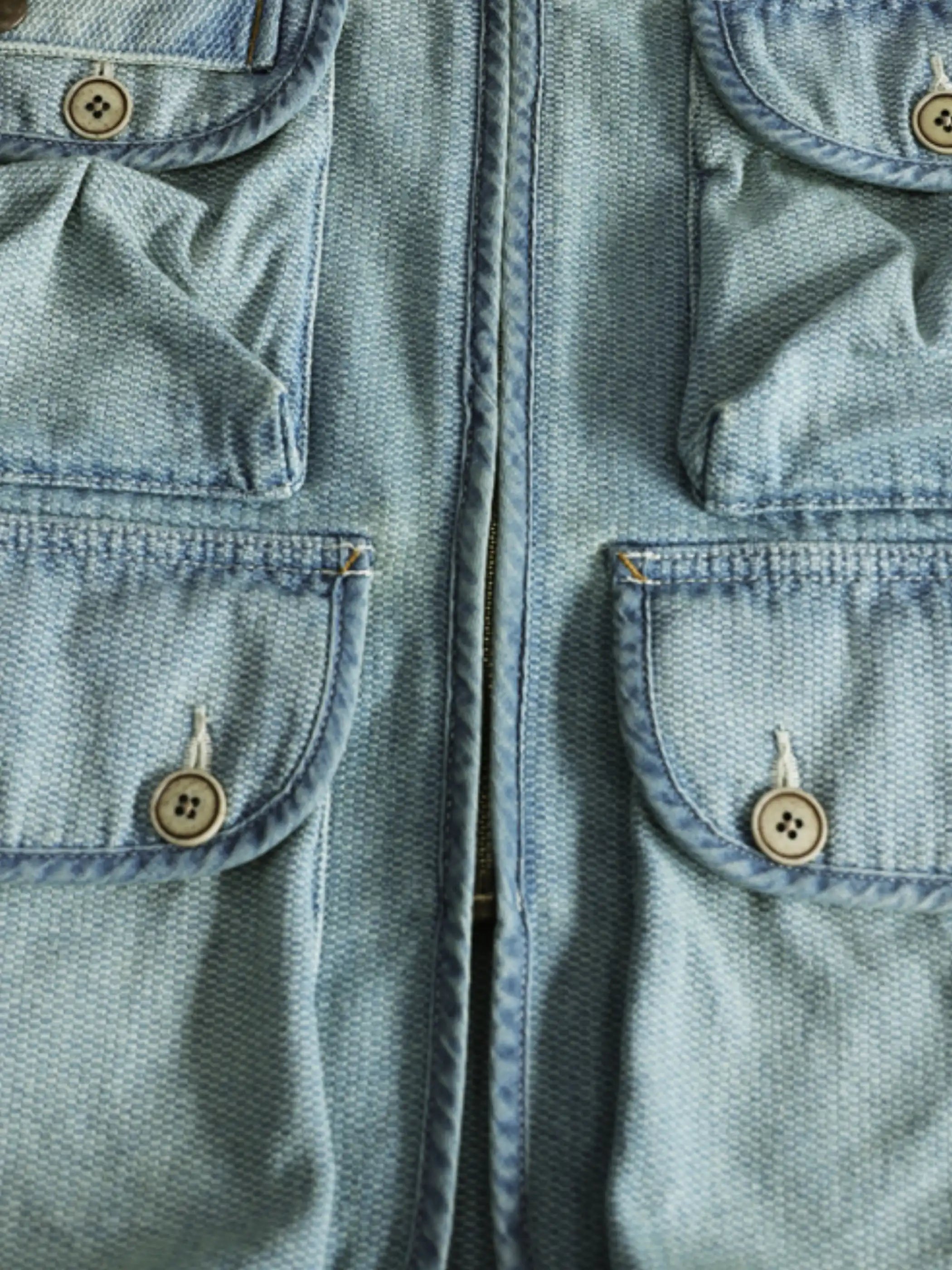 10.5ozのハニカム織りデニム生地(綿100%)を使用し、独自の石磨きウォッシュ加工により淡いブルーのヴィンテージ感を表現。立体的な多ポケット設計で収納力を確保し、釣りやアウトドアなどのシーンでも使いやすい。牛骨ボタンとYKK製のヴィンテージ加工ジッパーがアクセントとなり、日常的なコーディネートからアウトドアスタイルまで幅広く活躍。夏場のレイヤードアイテムとしても適度な通気性を備え、軽快な着心地を実現する。