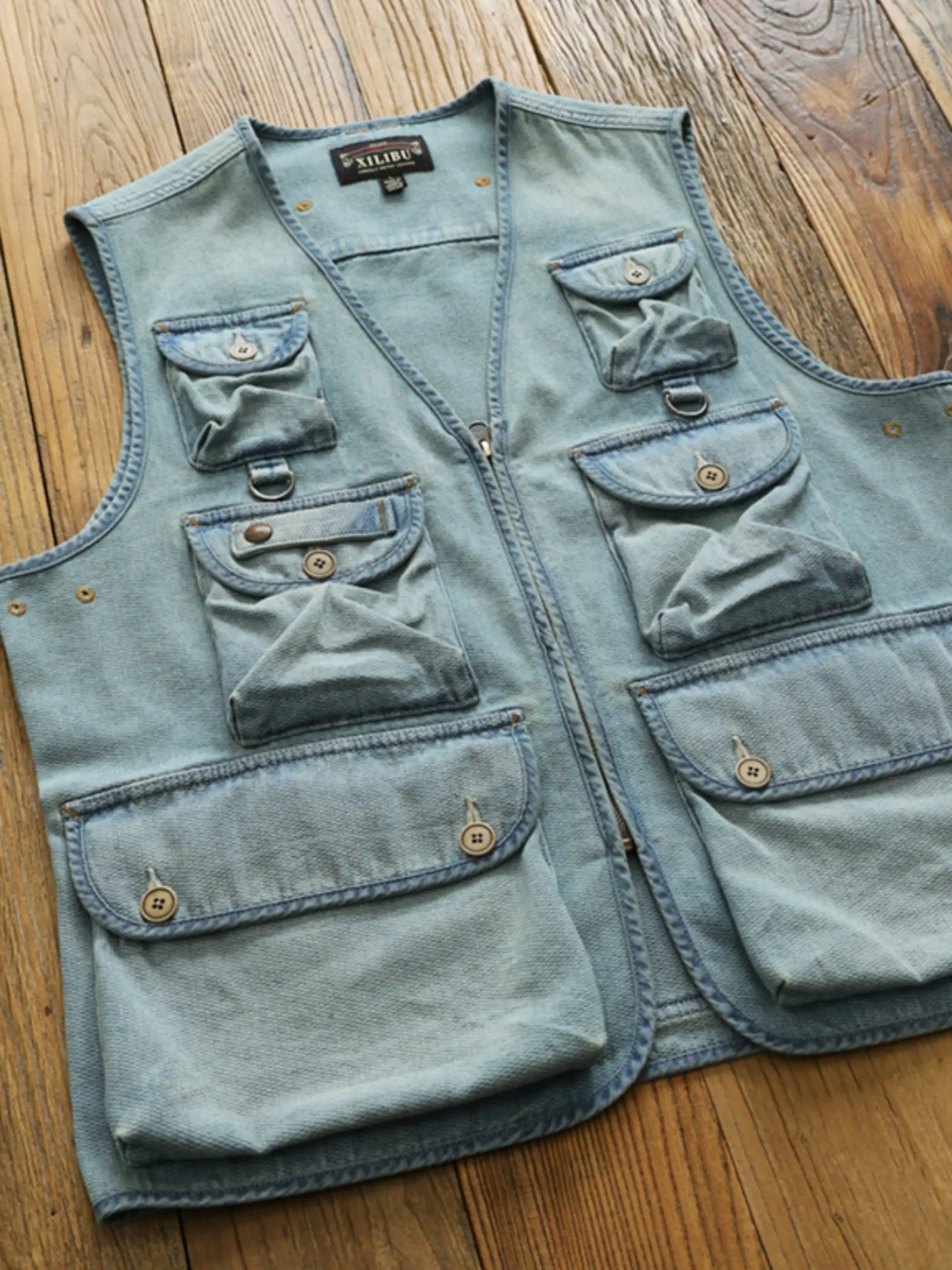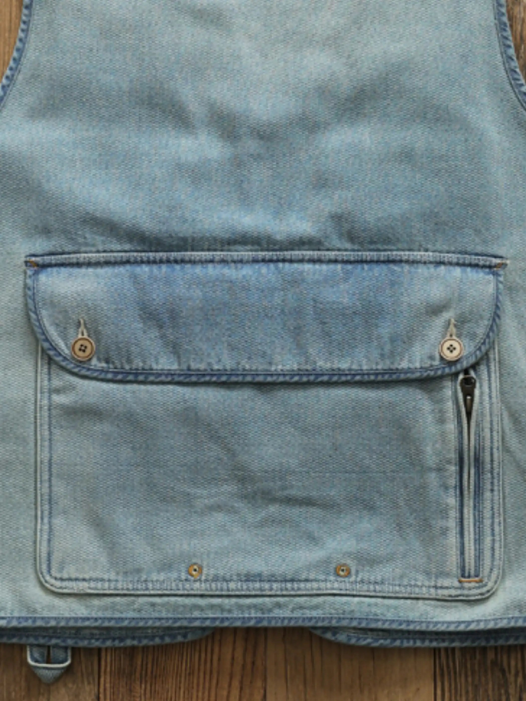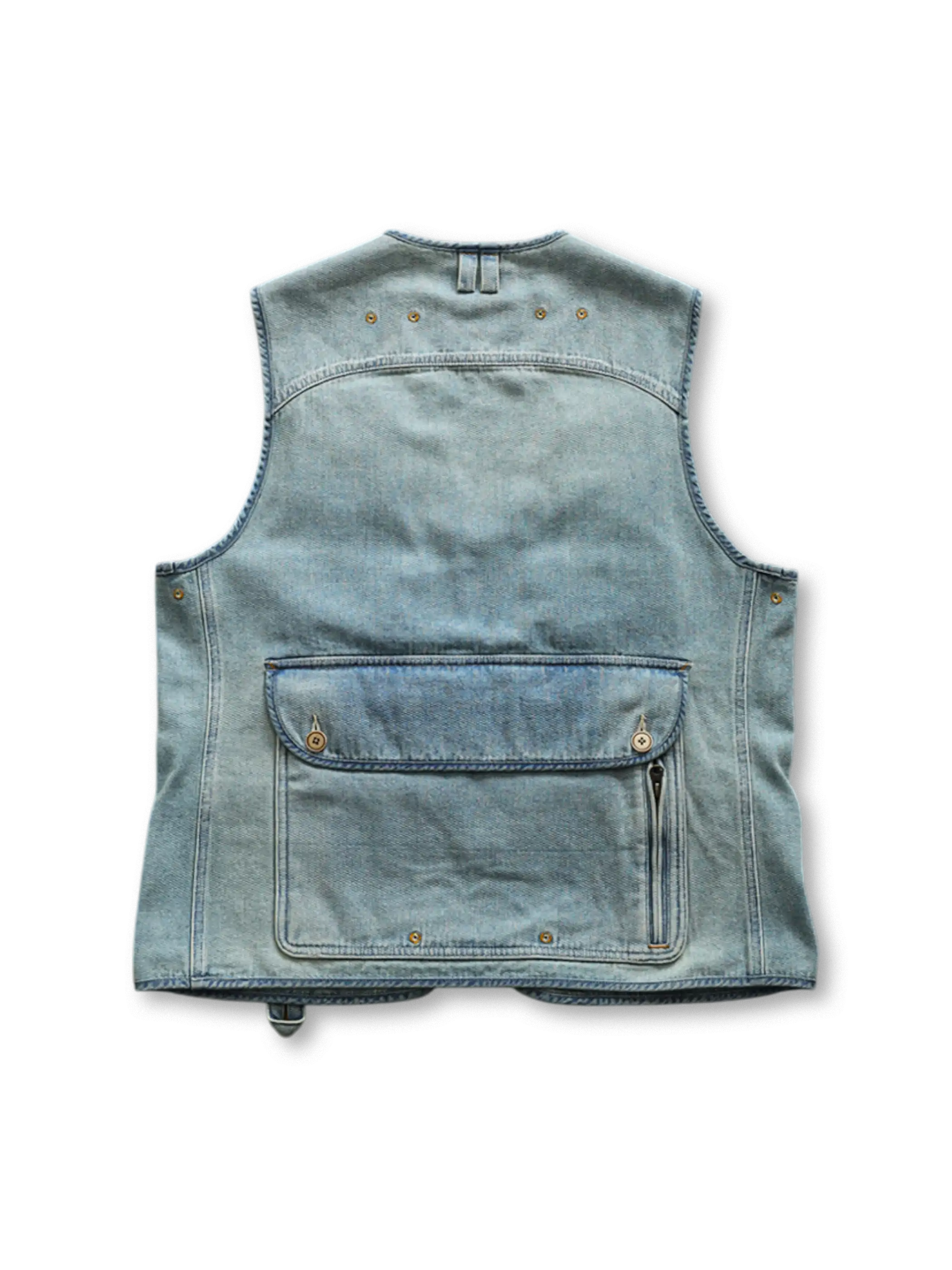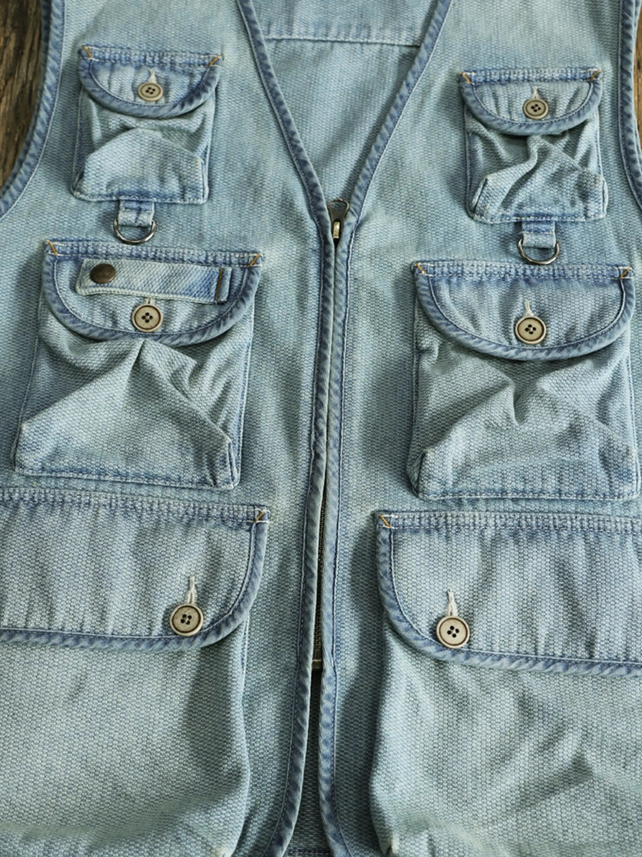 ファッション性と実用性を兼ね備えたハニカム織りデニムの多ポケットベストで、ヴィンテージ感ある石磨きウォッシュ加工が特徴。