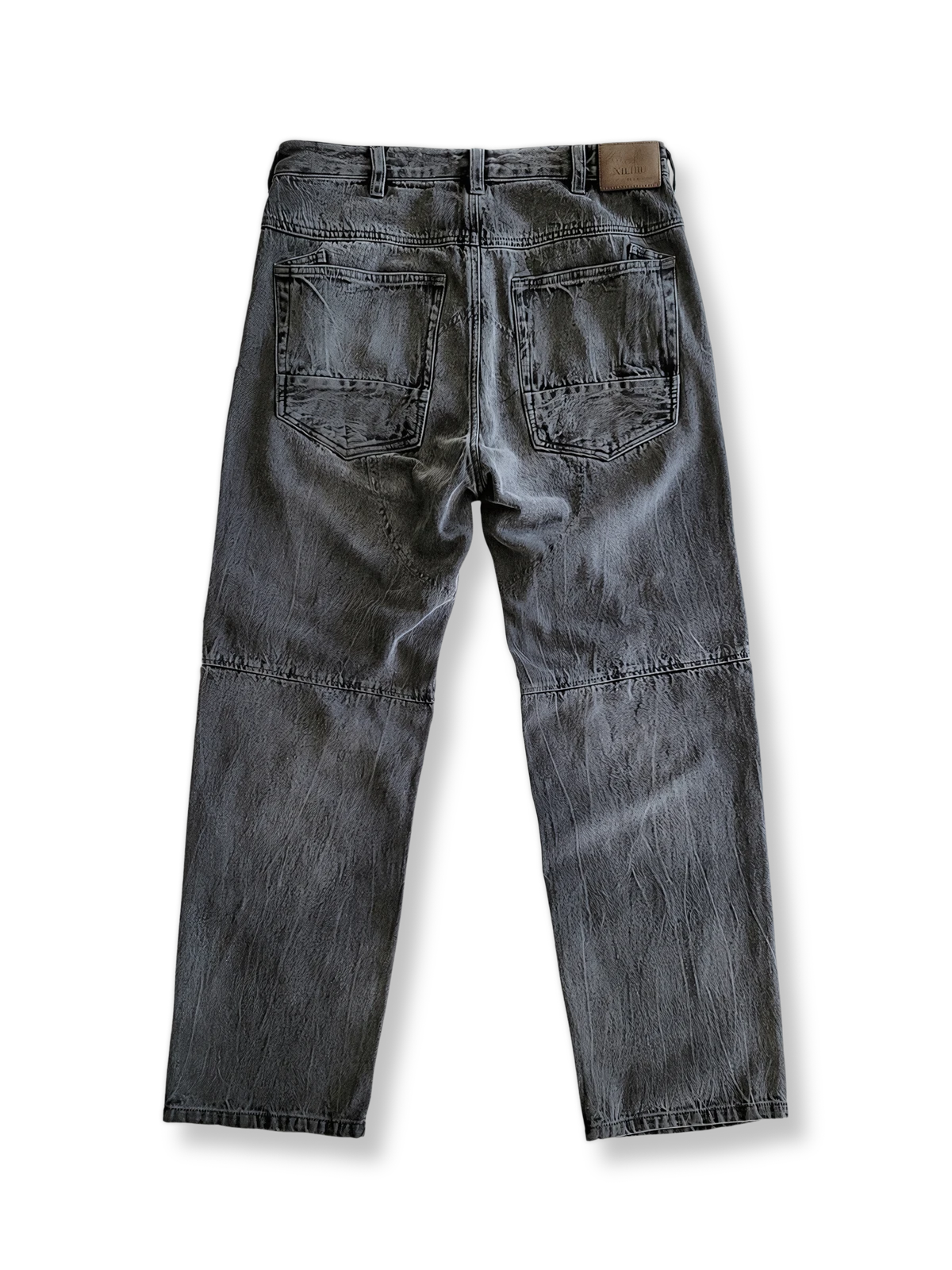 立体裁断デザインと抜染ウォッシュ加工を組み合わせた、ヴィンテージ感あふれるストレートデニムパンツ。