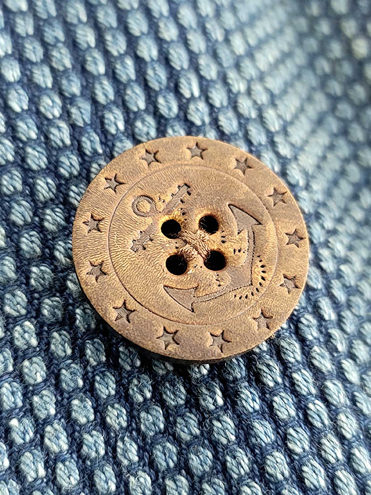 藍染デニム素材を使用し、その耐久性と時間の経過とともに生じる独特の色褪せ効果で人気です。木製のダブルブレストボタンとコントラストカラーのステッチがコート全体の視覚的インパクトを強化します。