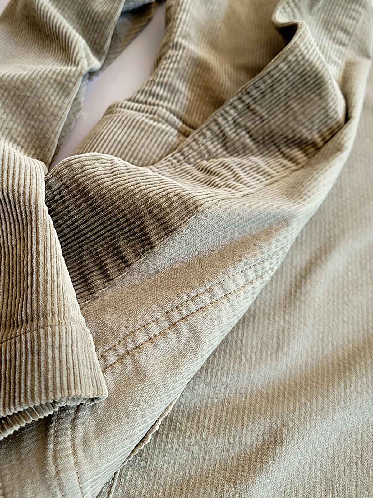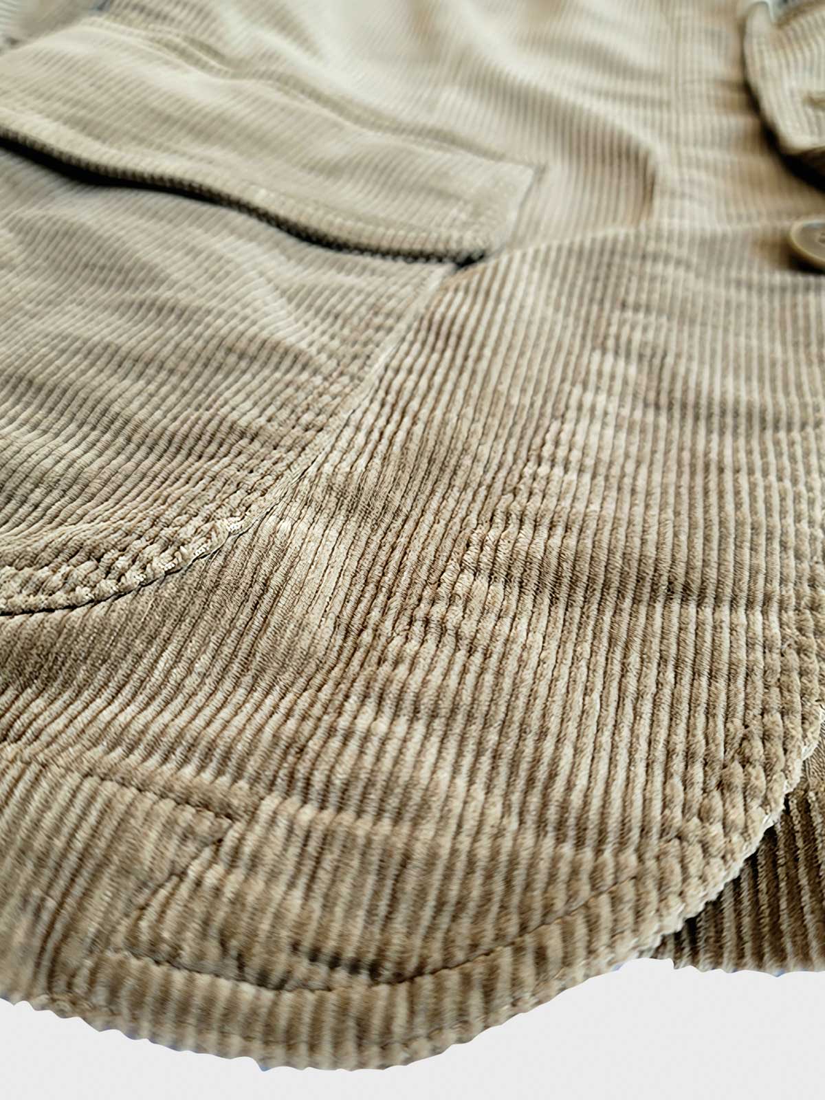 このスーツの素材には、高品質の全綿コーデュロイが使用されています。繊細な起毛面と鮮やかなストライプデザインは、レトロな魅力を演出すると同時に、精密な技術を際立たせています。素材の耐摩耗性とメンテナンスの容易さは、日常着としての実用性と耐久性をもたらします。