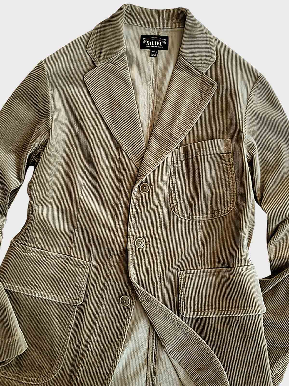 スーツはリラックス感のあるカジュアルなカットを採用しており、ゆったりとしたシルエットは日常着にも適している一方で、適度なフォーマル感も保っています。全綿素材は快適さと通気性を確保し、コーデュロイの質感は保温性と柔らかな触感をさらに向上させます。