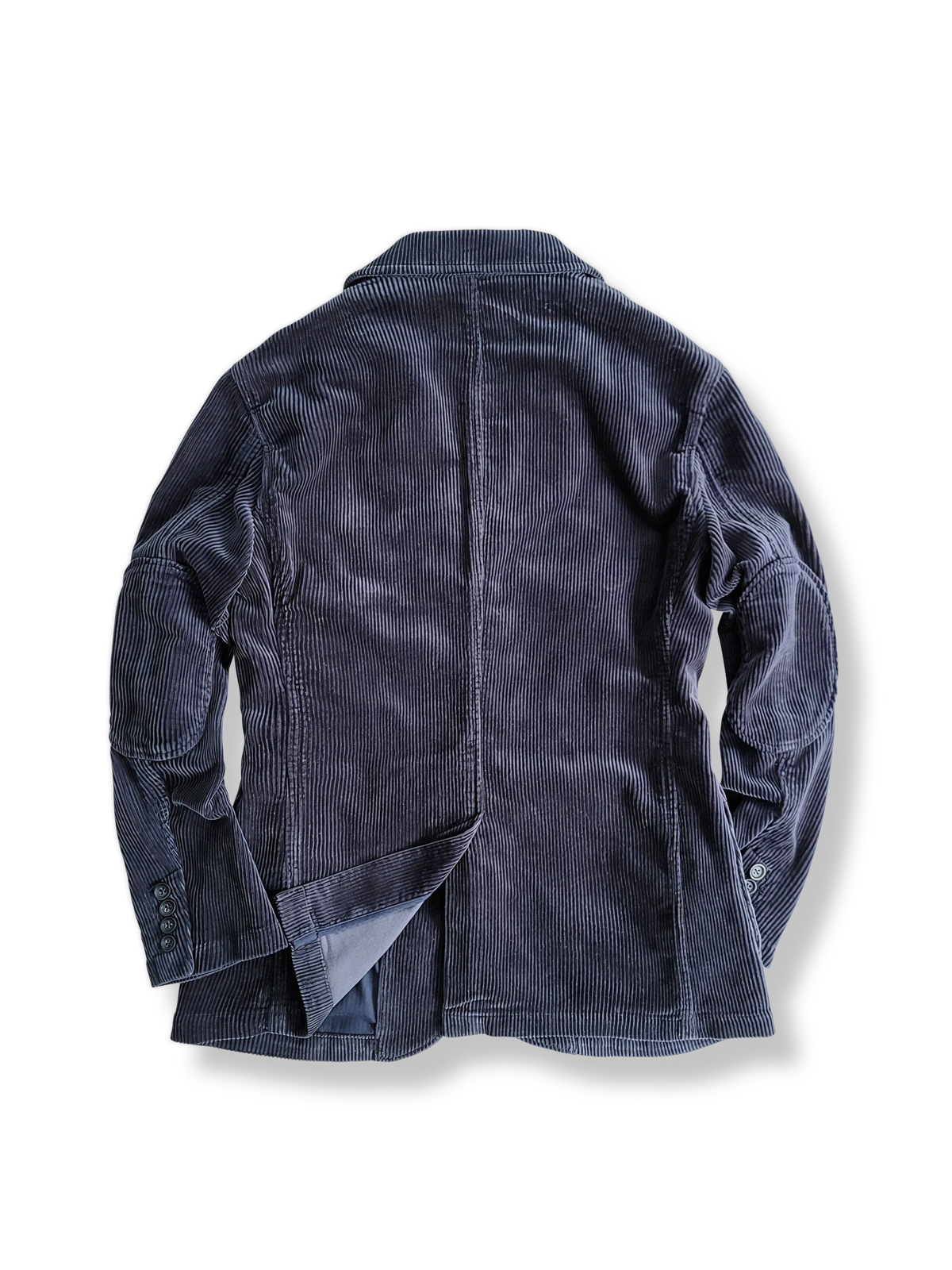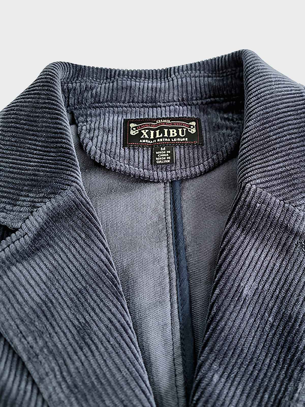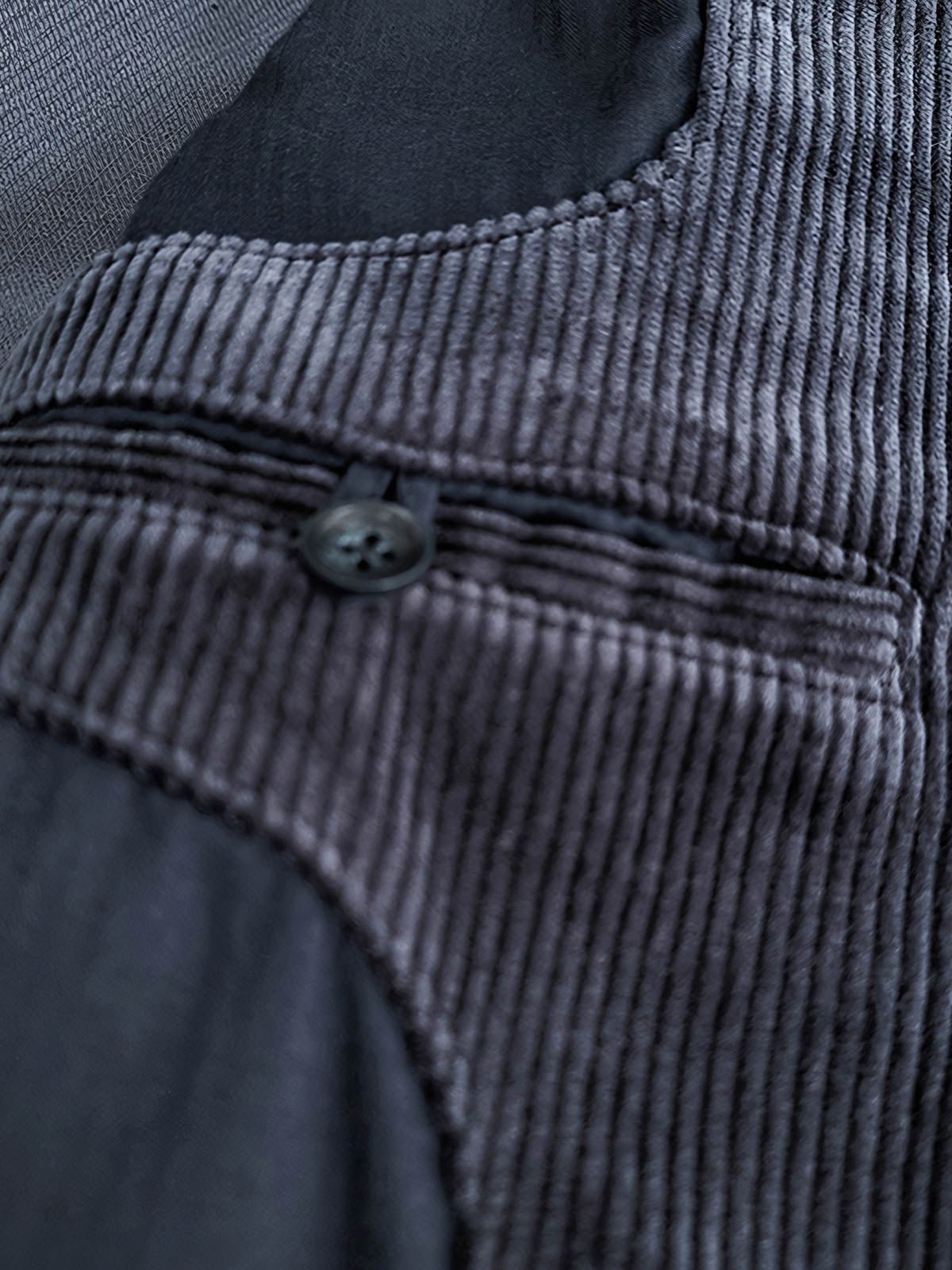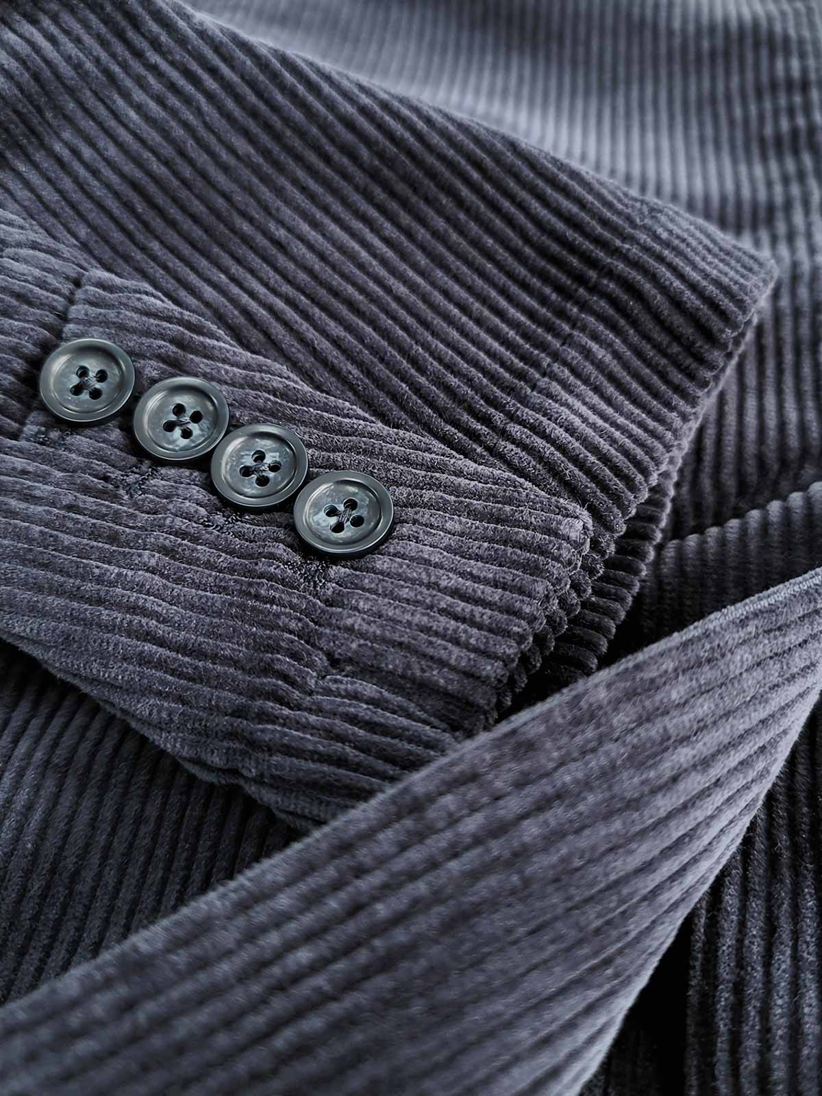 このスーツは、ヴィンテージスタイルのコーデュロイ生地を使用し、特有のストライプテクスチャーがレトロで温かみのある視覚効果をもたらします。コーデュロイは、17世紀のイギリスに起源を持ち、一時は上流社会の象徴とされました。