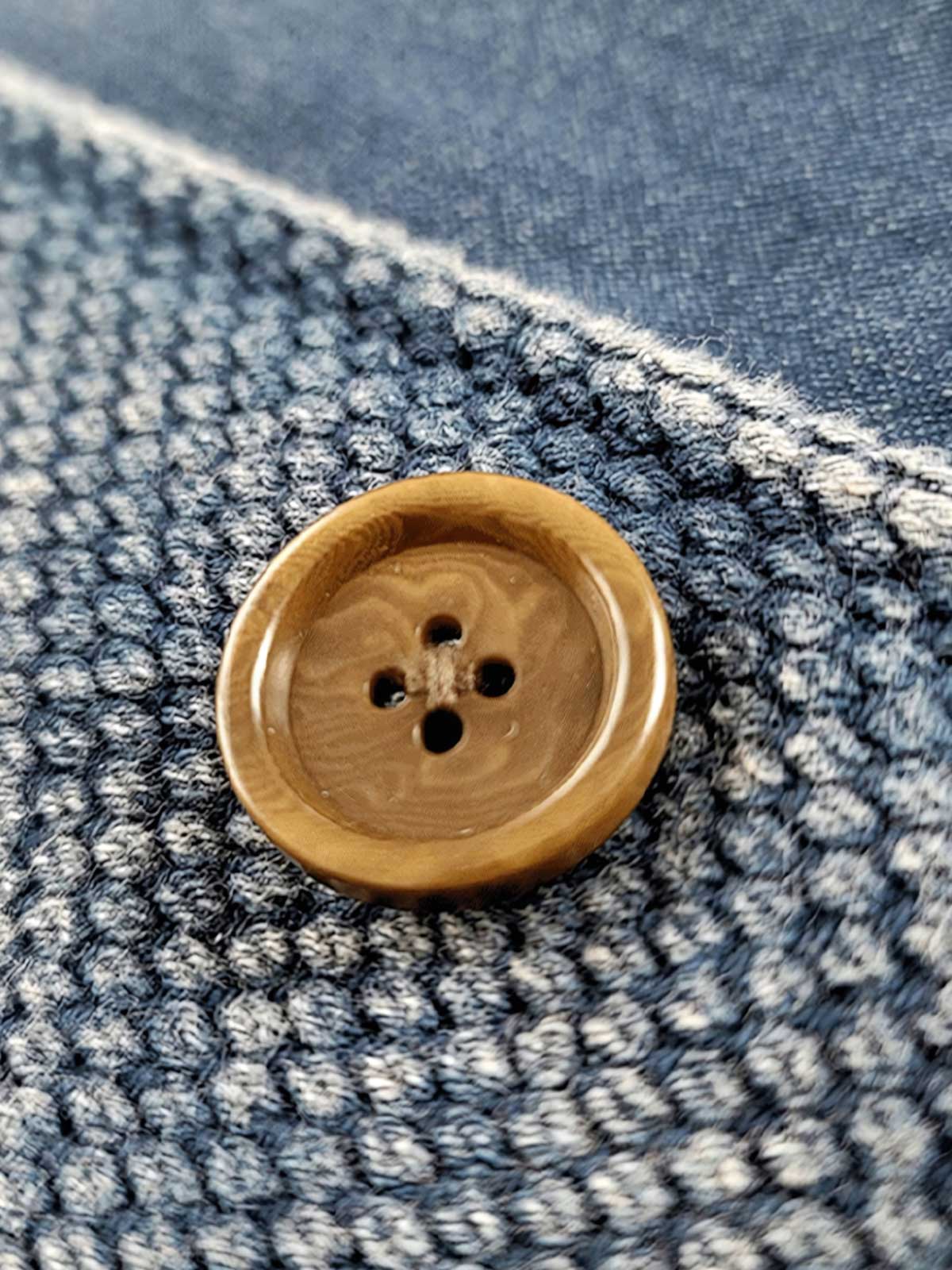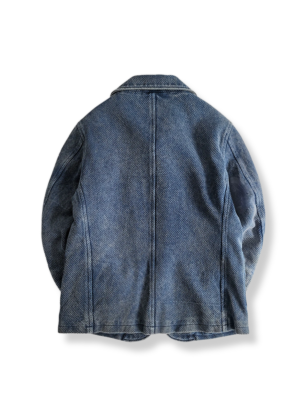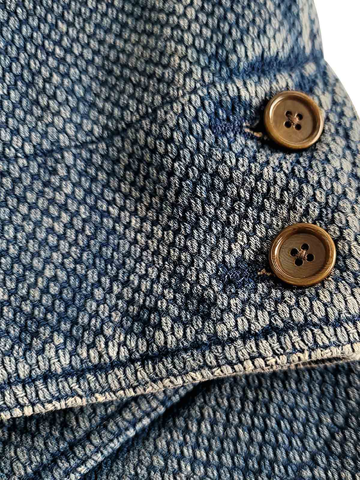 緻密な織りと質感のあるコットンツイード生地を使用しており、做旧加工によりビンテージ感をプラス。配色ステッチポケットとシンプルなシングルブレストのボタンは、細部へのこだわりを感じさせます。