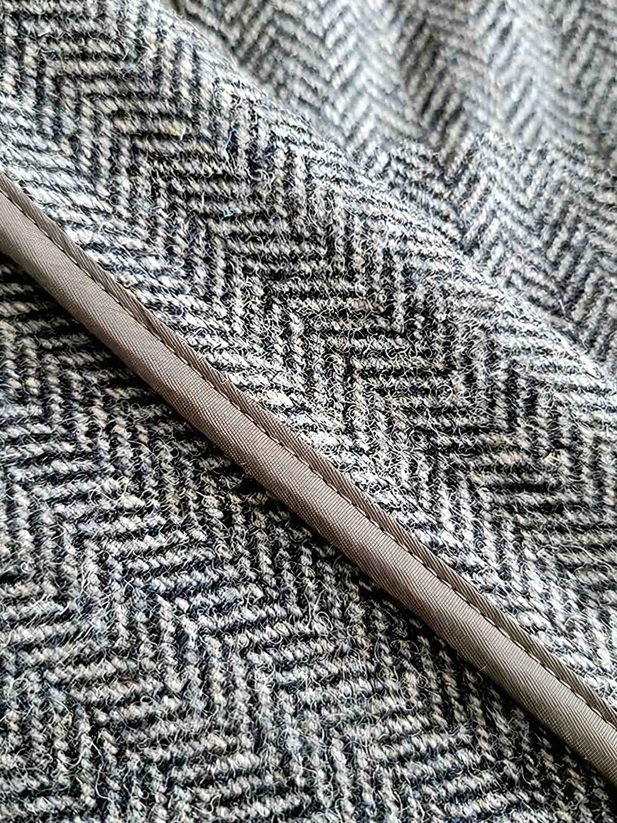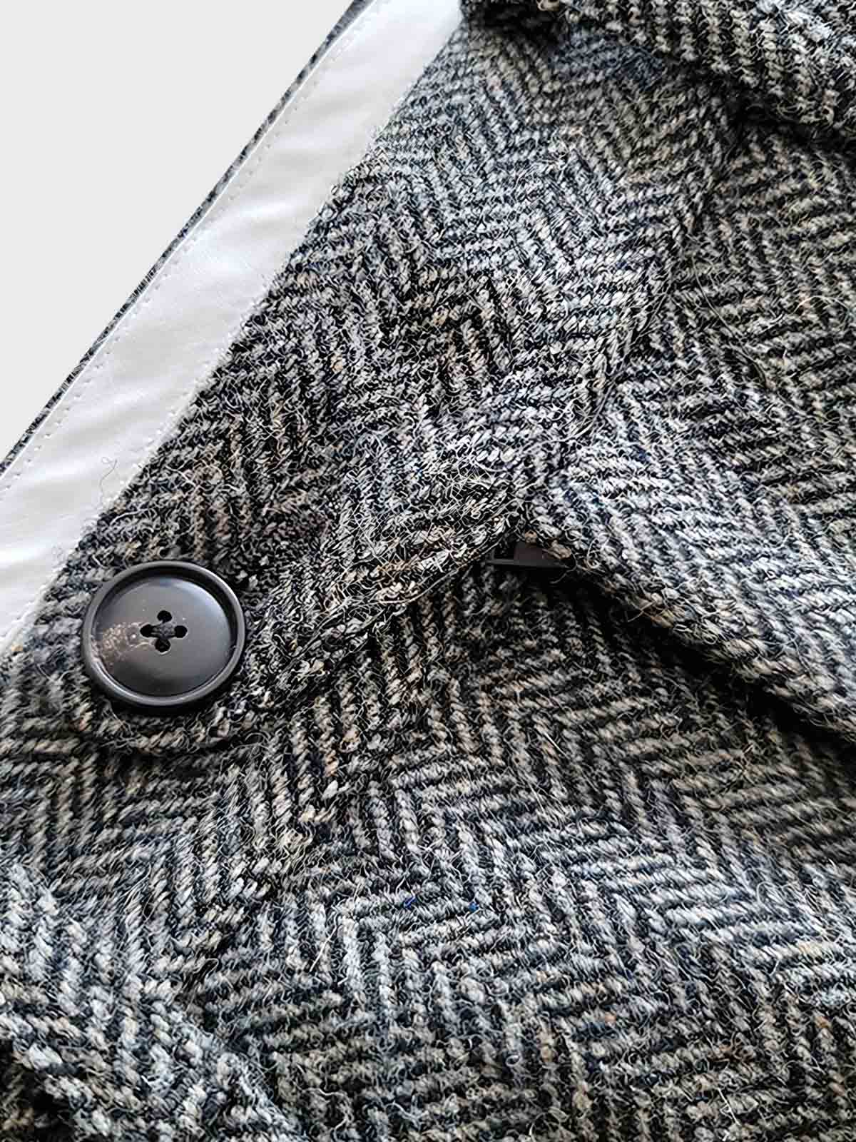 丈夫なウール素材を使用し、繊細なヘリンボーン織りがエレガントな印象を与えます。また、ウール素材は保温性が高く、肌寒い季節にも適しています。フロントには伝統的なフックとジッパーの留め具があり、洗練された外観を演出しています。
