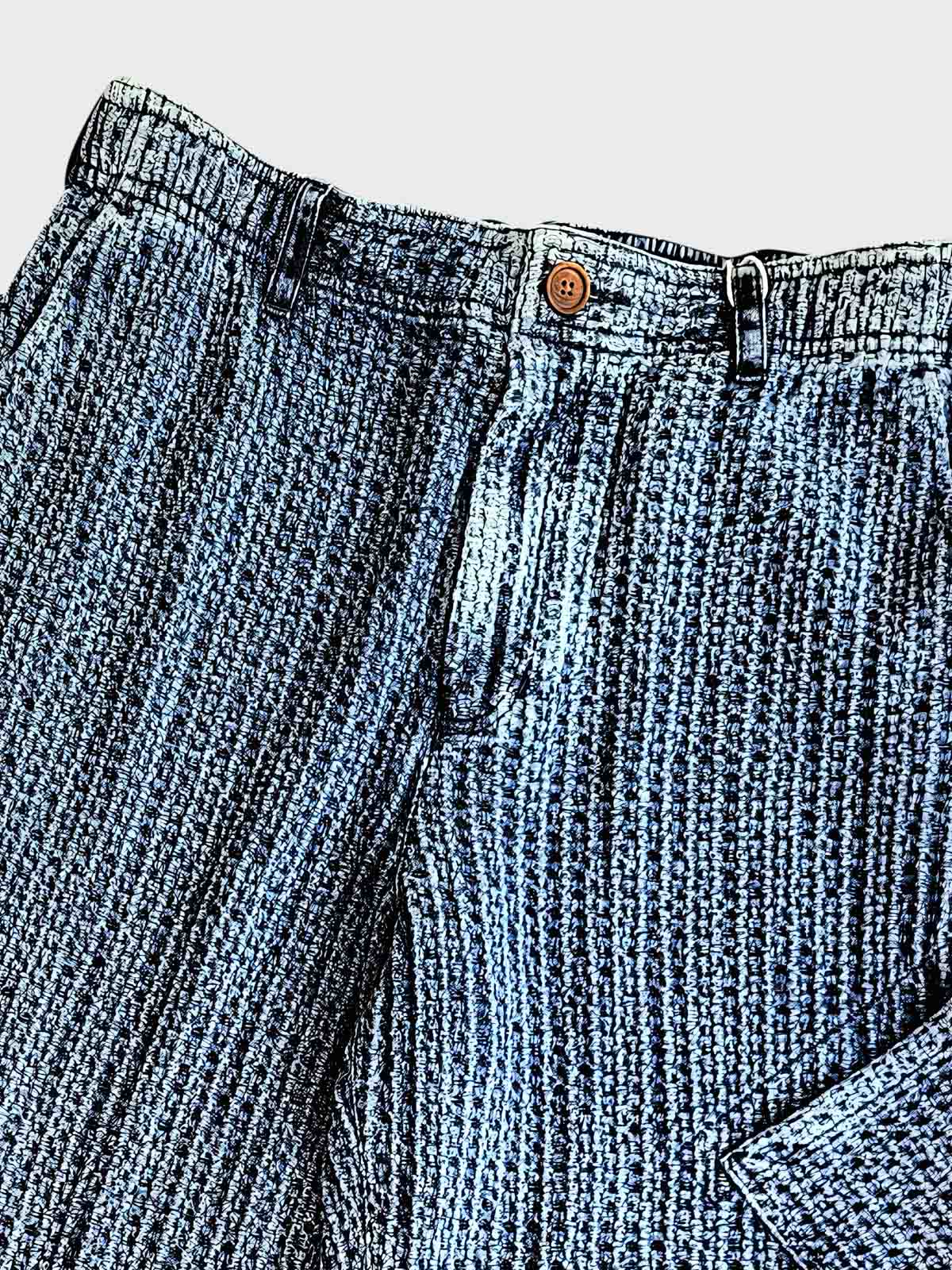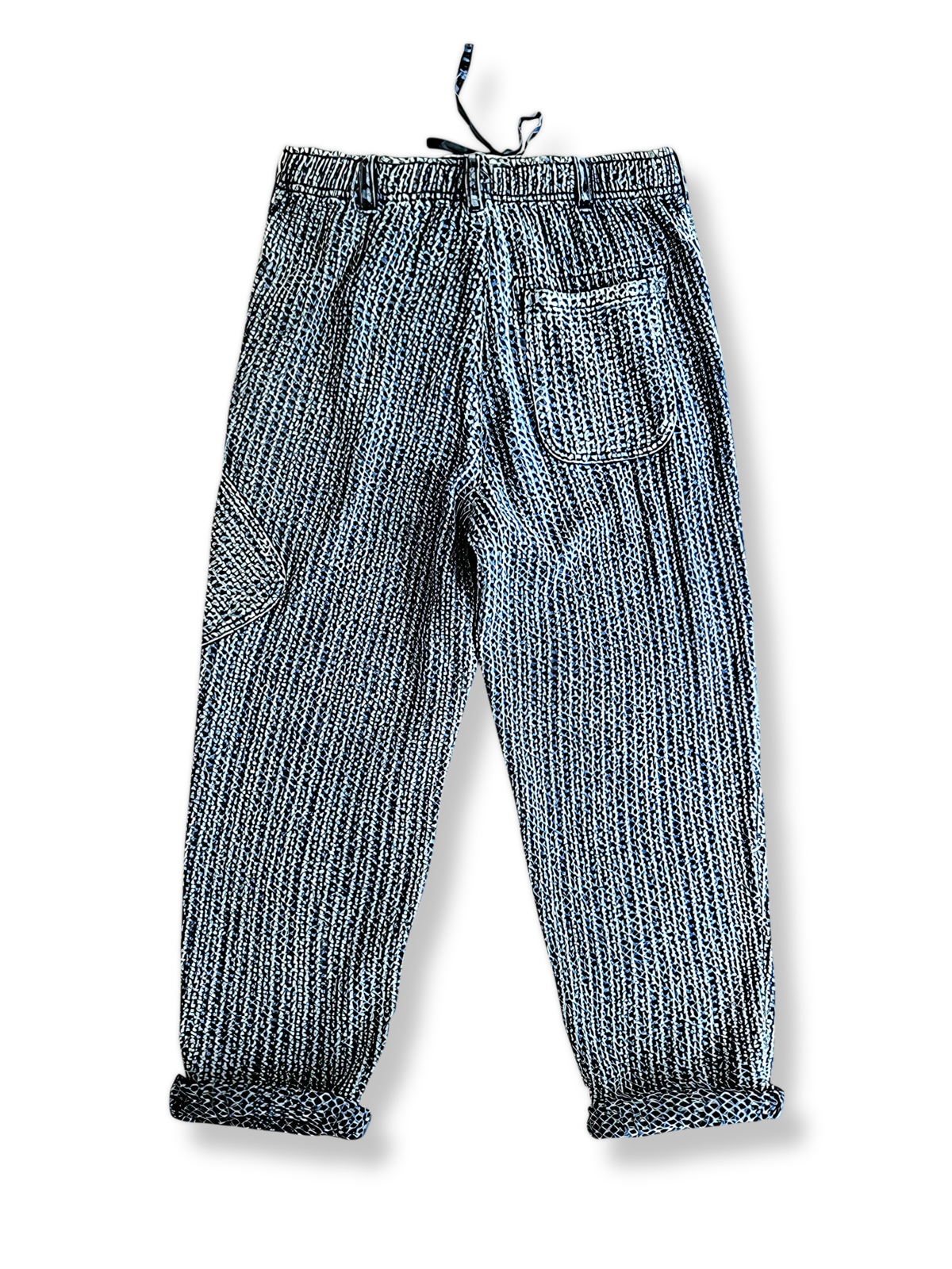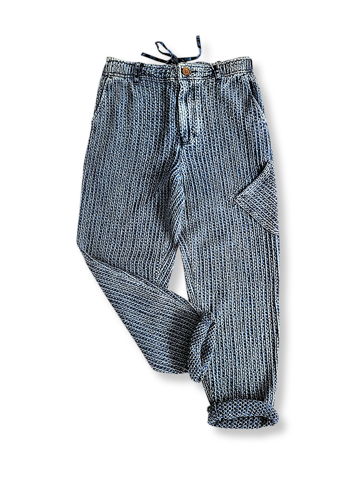 このカジュアルパンツは、100%コットンの藍染刺し子素材を使用し、独特なレトロ感と手工芸の美しさを表現しています。刺し子素材は日本の江戸時代に起源を持ち、農民や漁師が使用した耐久性と保温性を高めるために布を多層に縫い合わせたものです。刺し子工芸は素材を強化するだけでなく、独特なテクスチャーと美しい模様を生み出します。ゆったりとしたシルエットとテーパードカットのデザインにより、快適な着心地とファッション性を両立。デザインのインスピレーションは伝統的な日本の工芸とアメリカンカジュアルスタイルを融合しており、日常のカジュアルなシーンやアウトドア活動に最適です。Tシャツやシャツと合わせることで、ユニークなレトロスタイルを演出します。