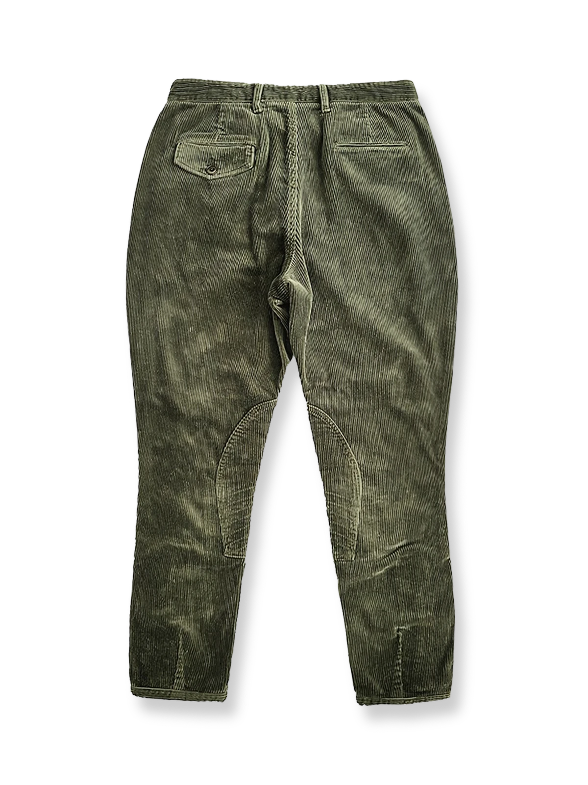 このビンテージコーデュロイジョッパーズは、ふくらはぎに施された独特なバンデージデザインが特徴で、装飾的な要素と機能性を兼ね備えた一着です。上質なコーデュロイ素材を使用しており、柔らかな手触りで、特に秋冬シーズンに最適なパンツです。脚部にフィットするカッティングがレトロなライダーススタイルを引き立て、快適さとファッション性を両立させています。ブーツやビンテージシューズとの相性も抜群で、独自の個性とスタイルを際立たせる一着です。