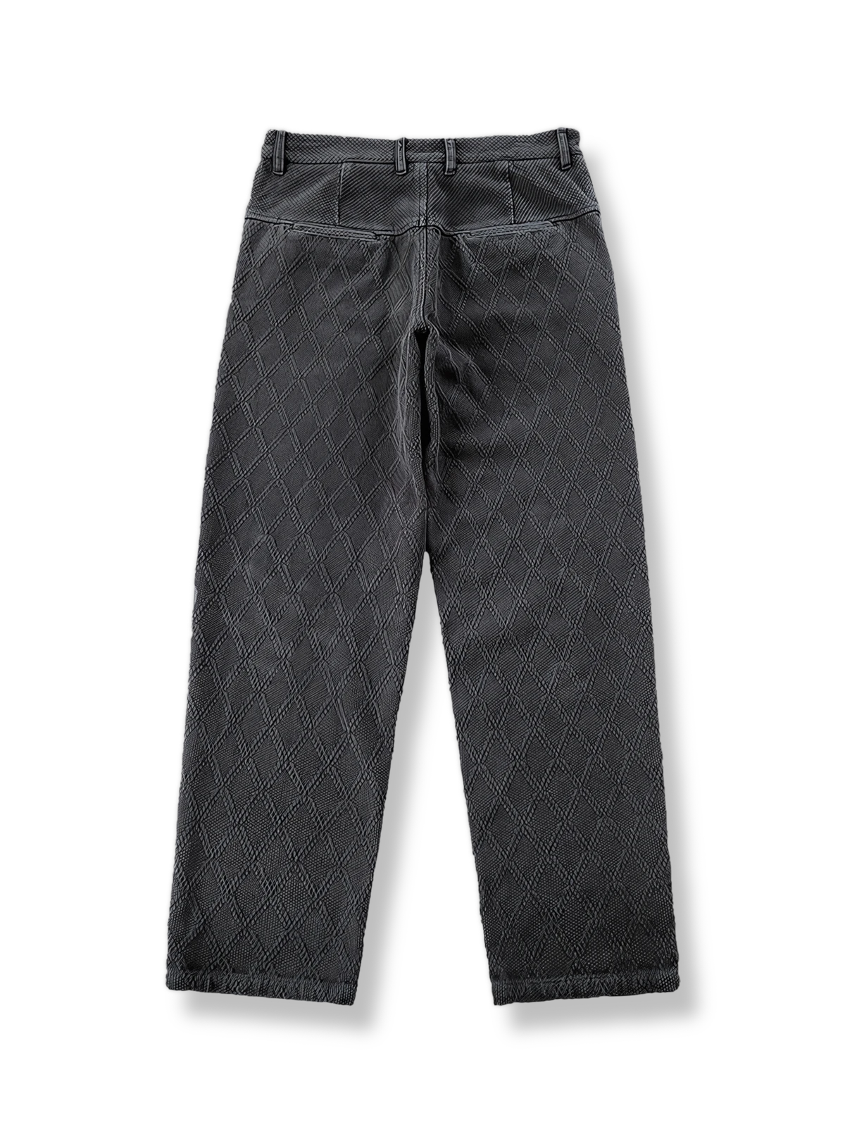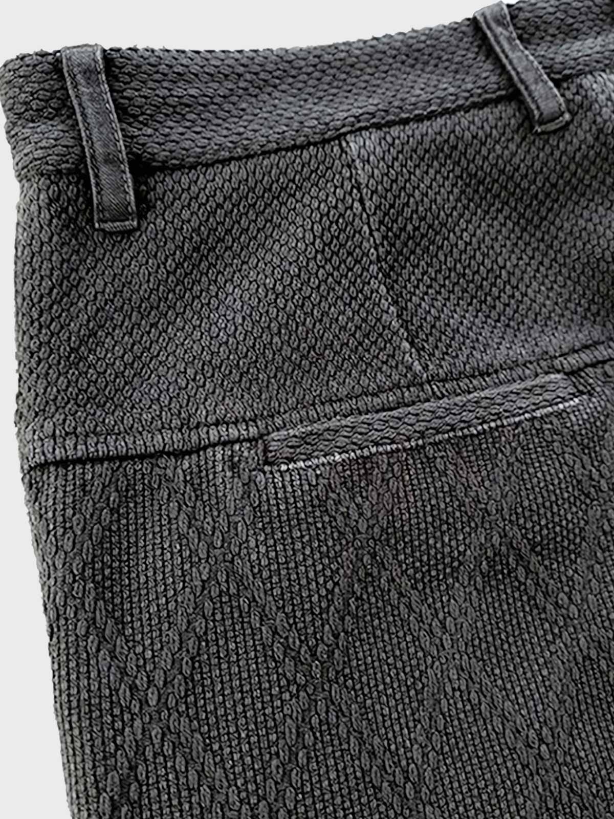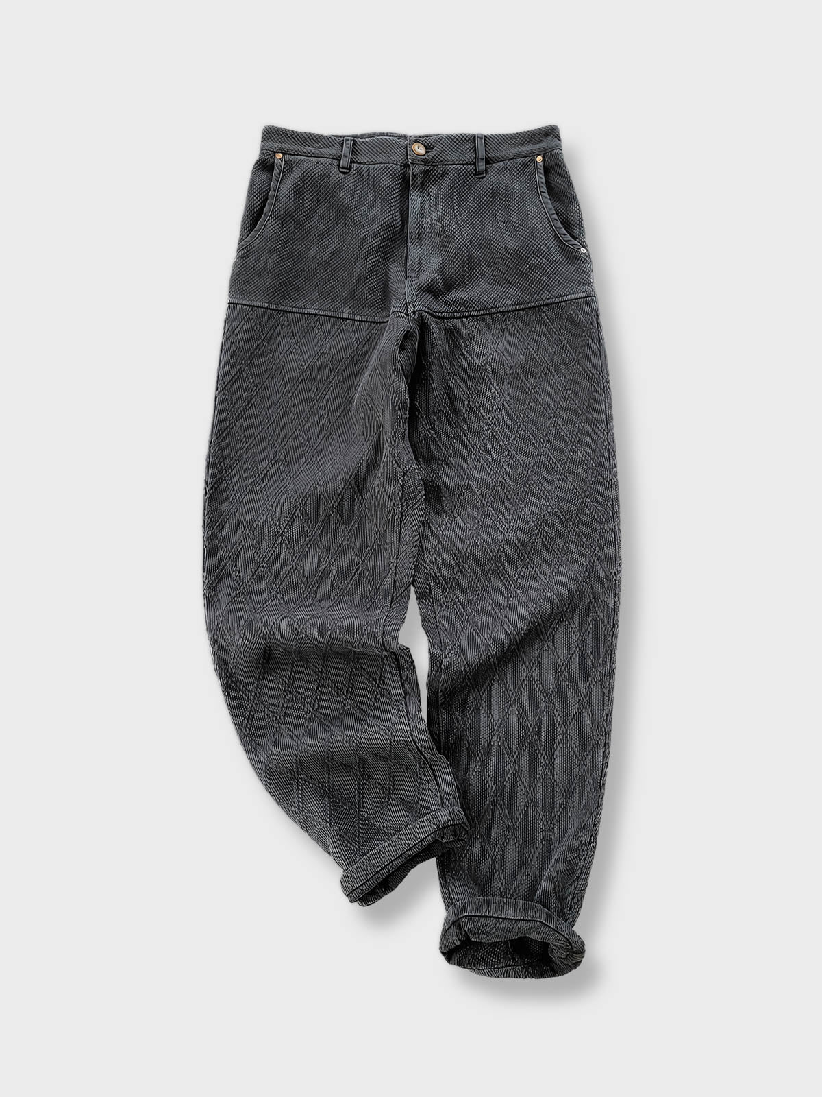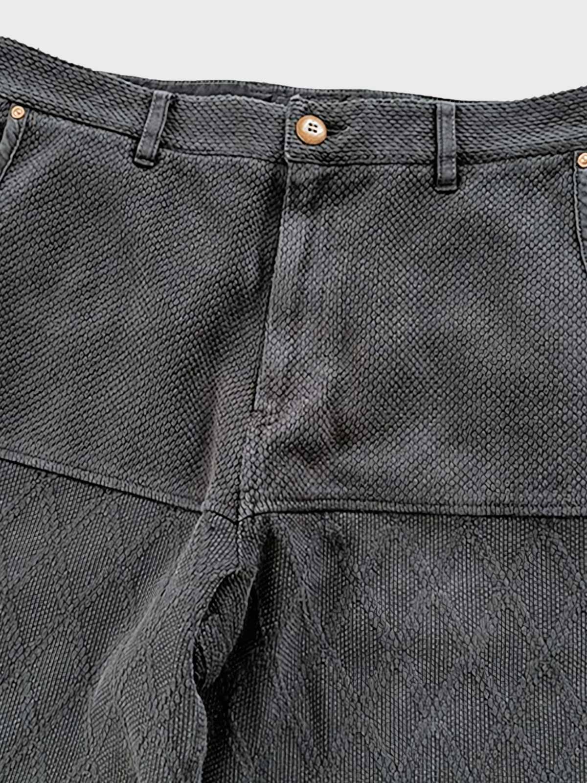 これらのスラックスは、刺し子の伝統技術にインスパイアされたユニークなパッチワークデザインを特徴としています。刺し子はもともと日本で発展した刺繍技法で、布を補強し耐久性を高めるために生まれました。この技術を現代のファッションに応用することで、歴史とモダンスタイルが融合したアイテムが完成しました。