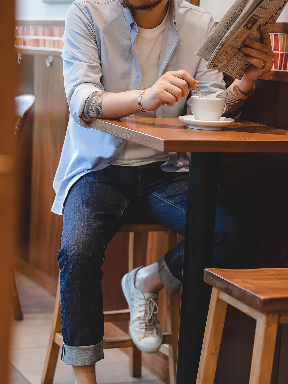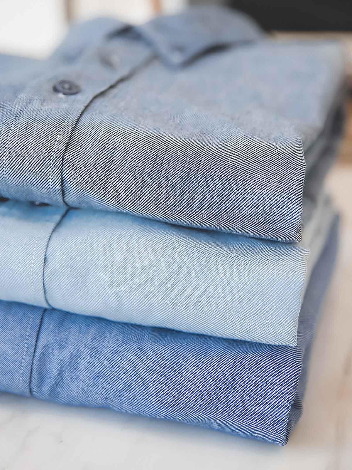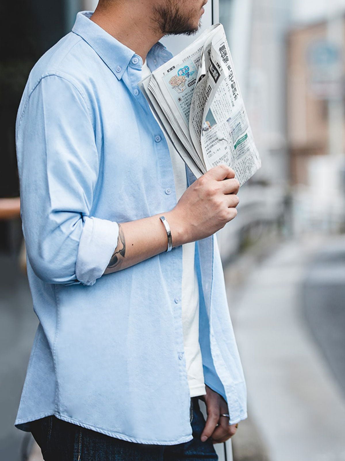 このブルーシャツは、ダークカラーのスラックスやカジュアルパンツと組み合わせ、ドレスシューズやカジュアルシューズを合わせることで、シンプルで洗練されたデザインで、一枚で着用することも、ジャケットやセーターのインナーとしても、多様なスタイリングを楽しむことができます。