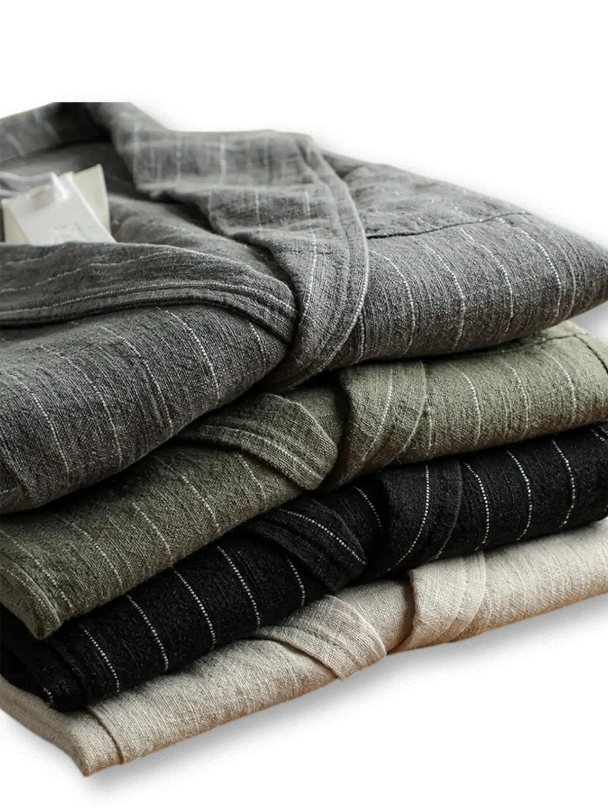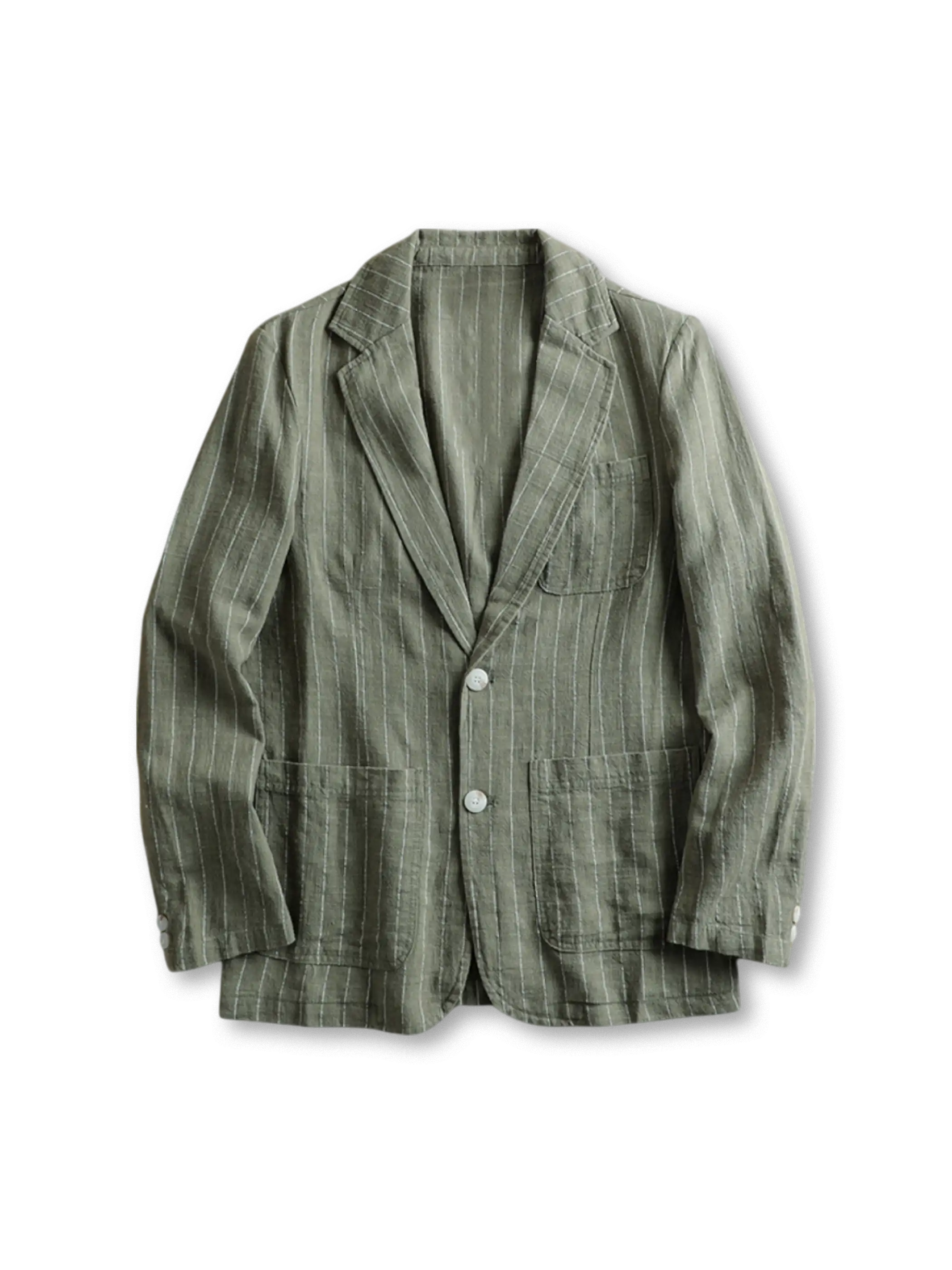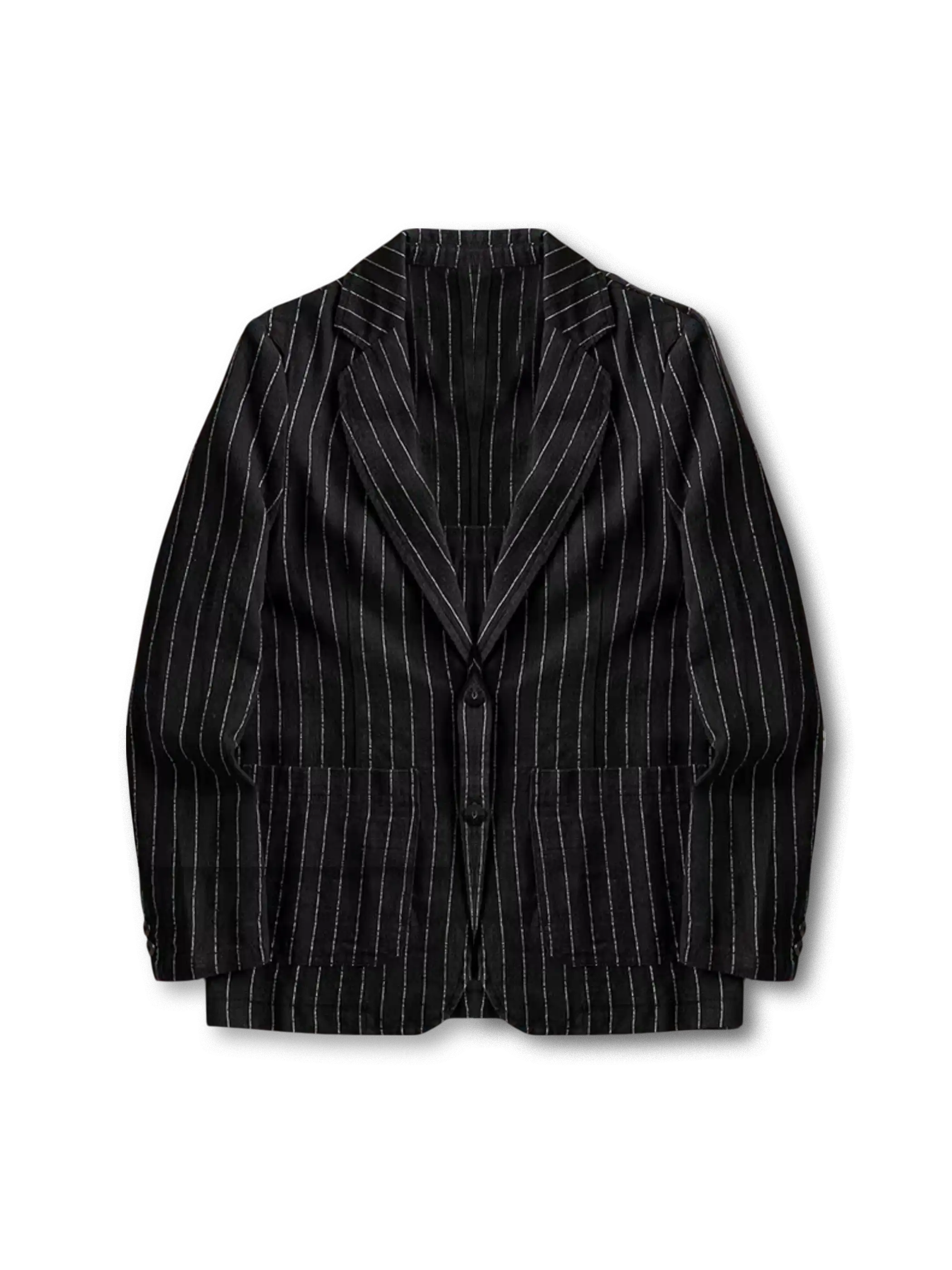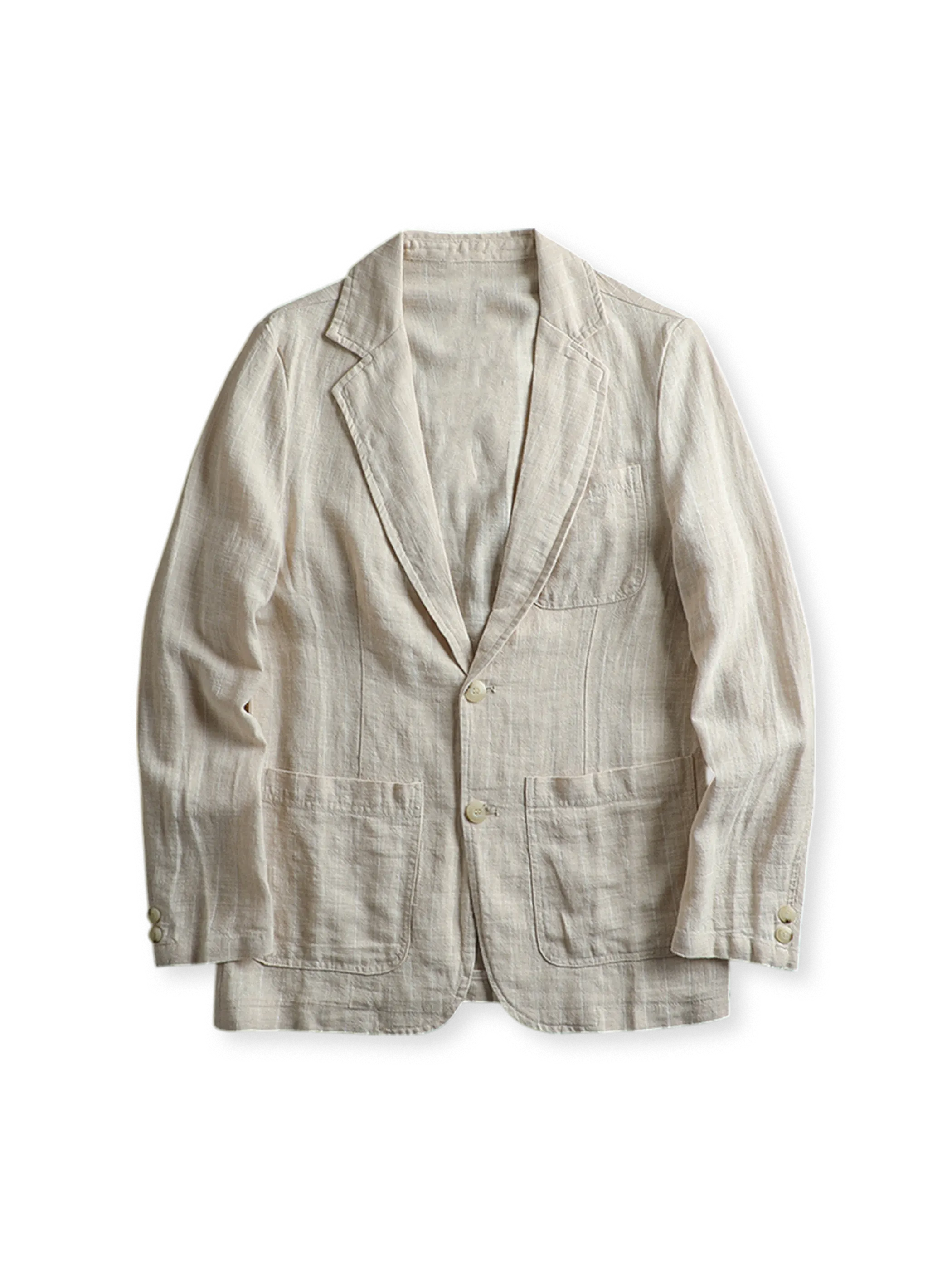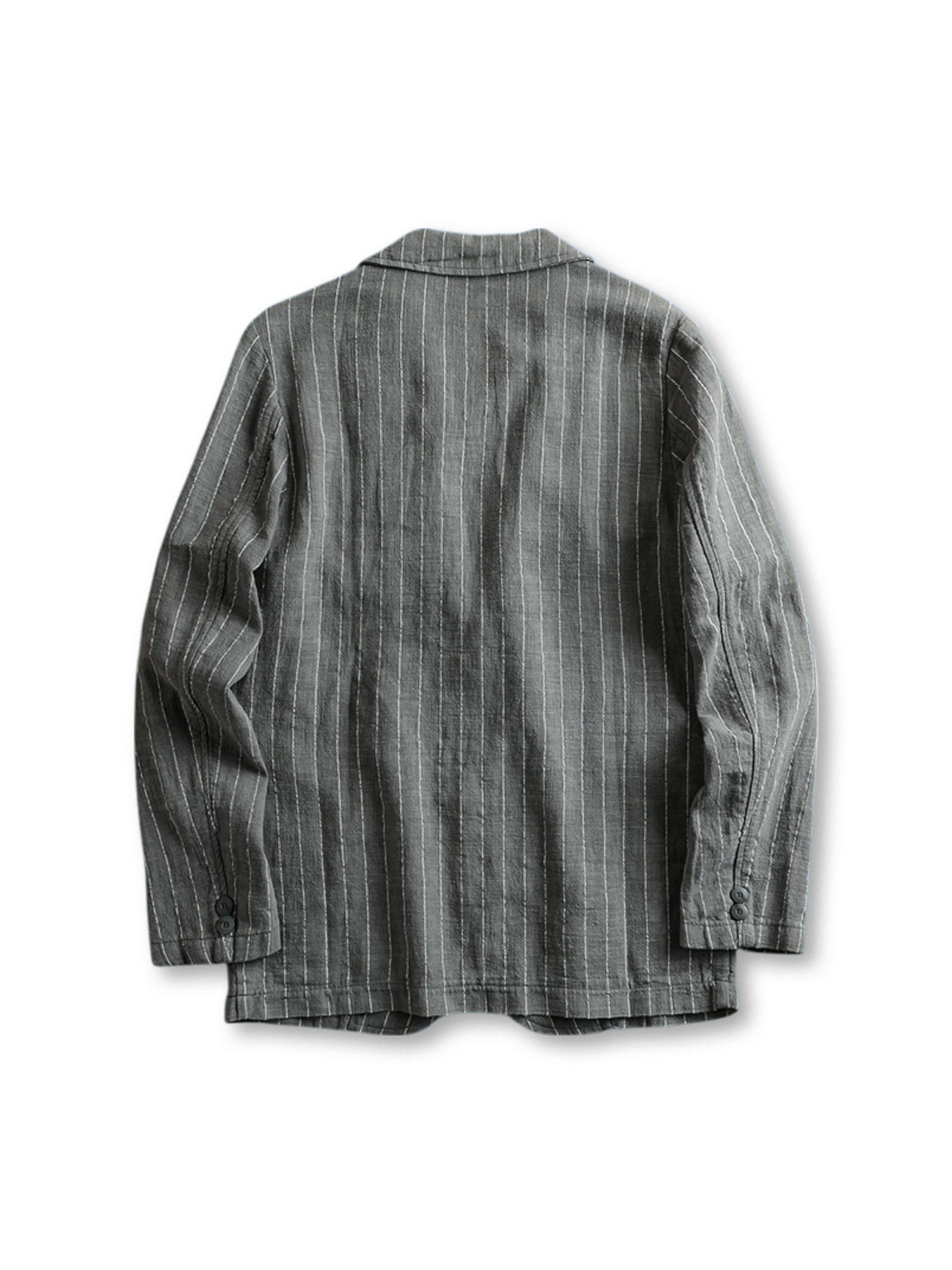 ラミー70%×コットン30%のストライプ生地をヴィンテージ水洗い加工し、春夏に映えるスリムフィットのテーラードジャケット。
