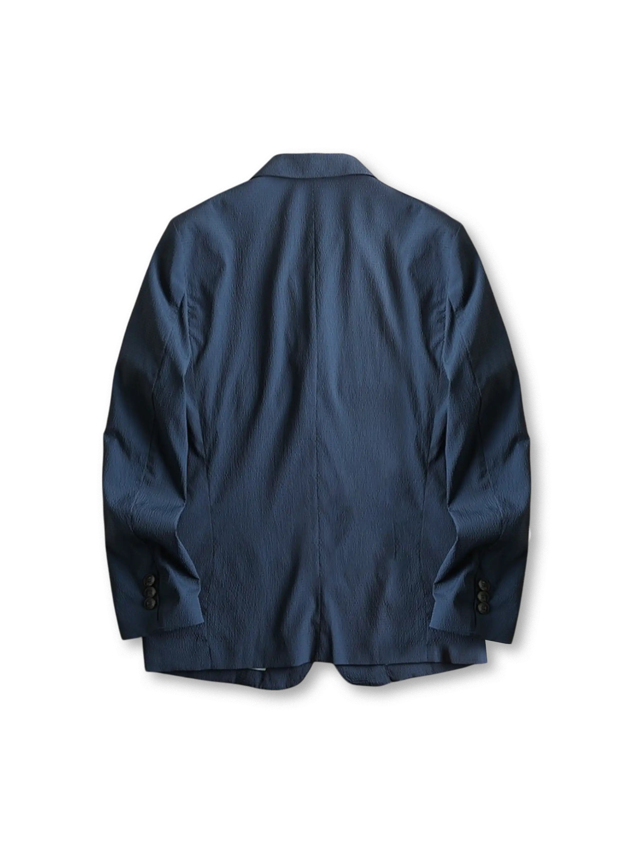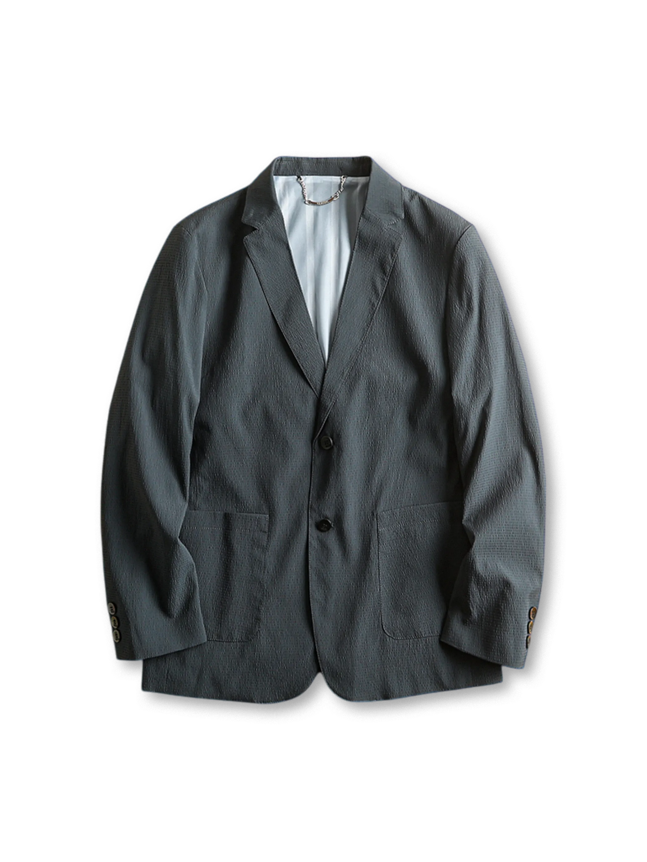 このジャケットは、水波紋風のテクスチャーとストレッチ性を兼ね備えた、軽量で通気性に優れたビジネスカジュアル向けの一着です。