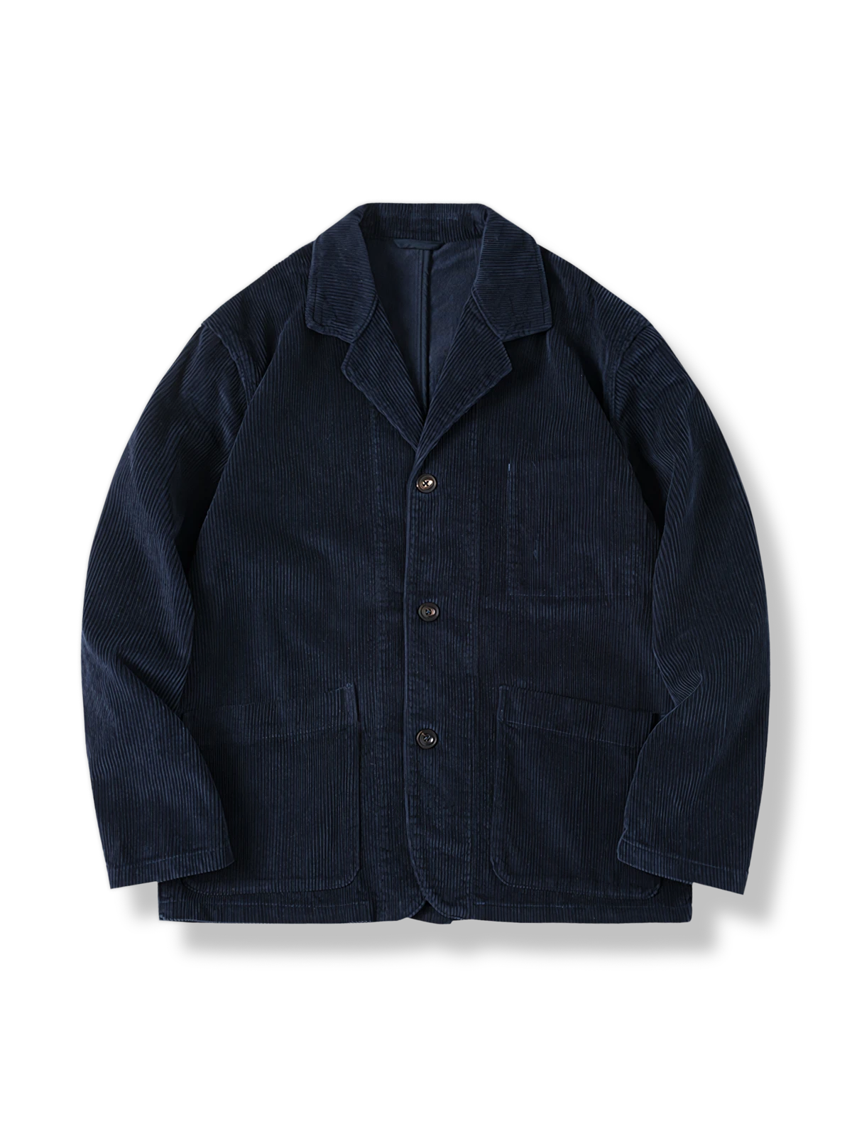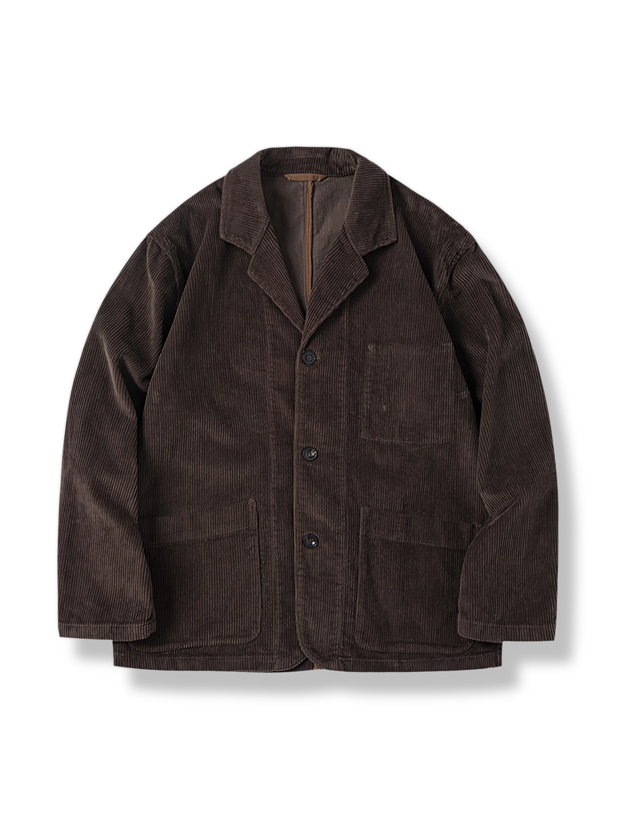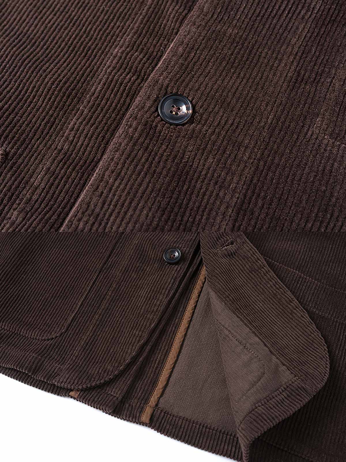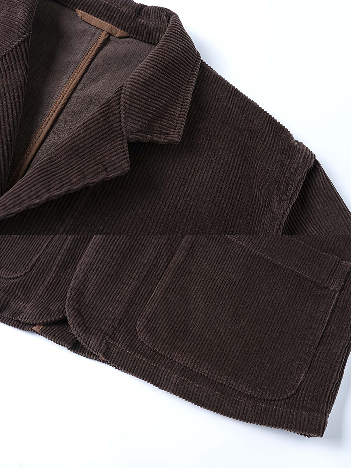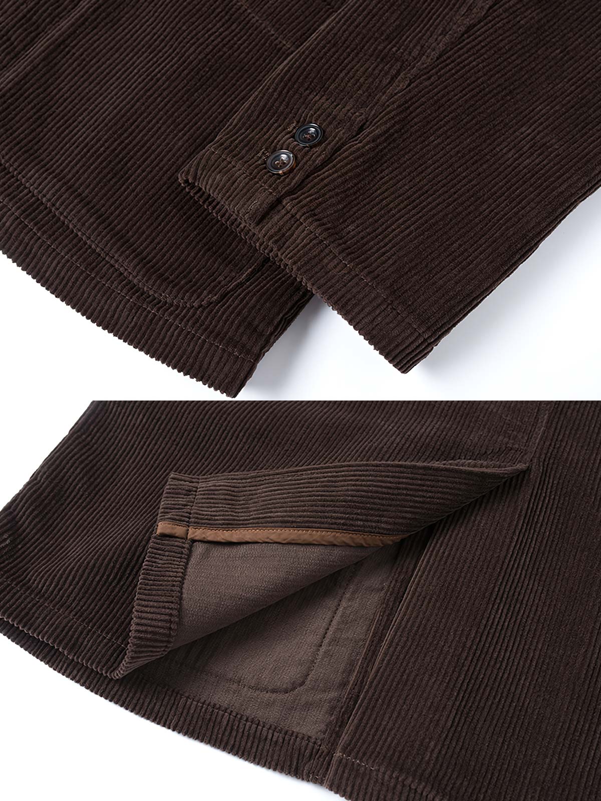厚手コーデュロイ生地を使用しており、はっきりとしたコールと暖かな手触りが特徴で、適度な張りと厚みがあり、秋冬に適しています。純粋な牛角ボタンの使用は、ディテールにおける天然素材への好みを強調し、全体のレトロスタイルを引き立てます。内側の全包みエッジ処理は、着心地と耐久性を高めます。