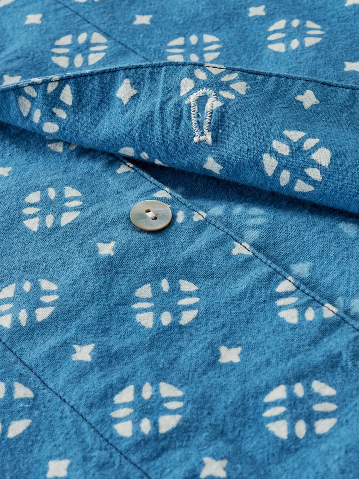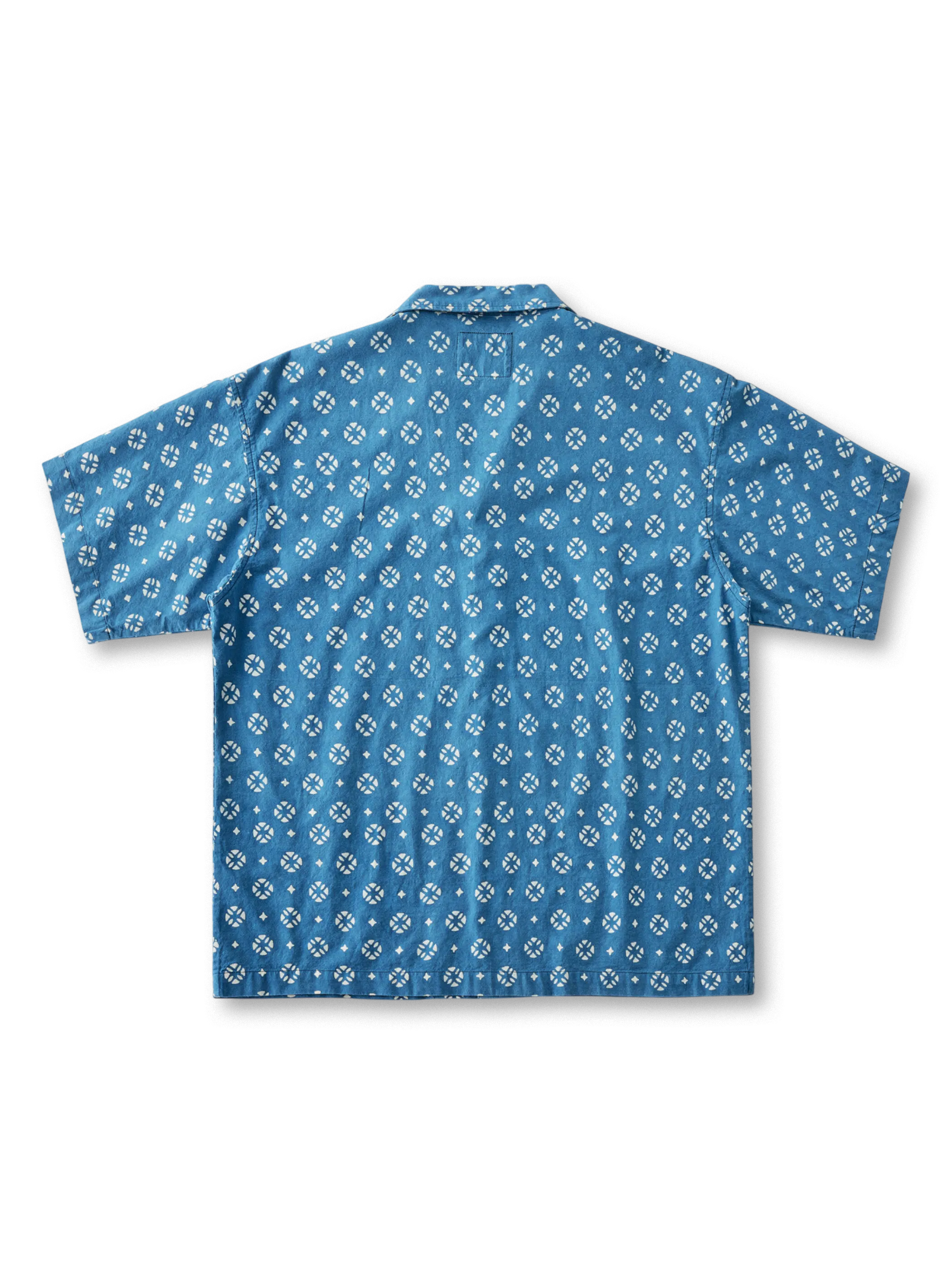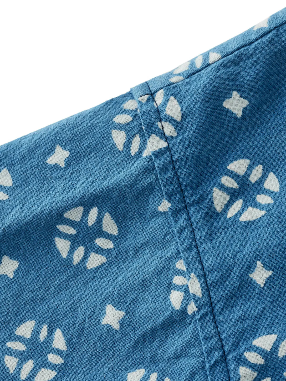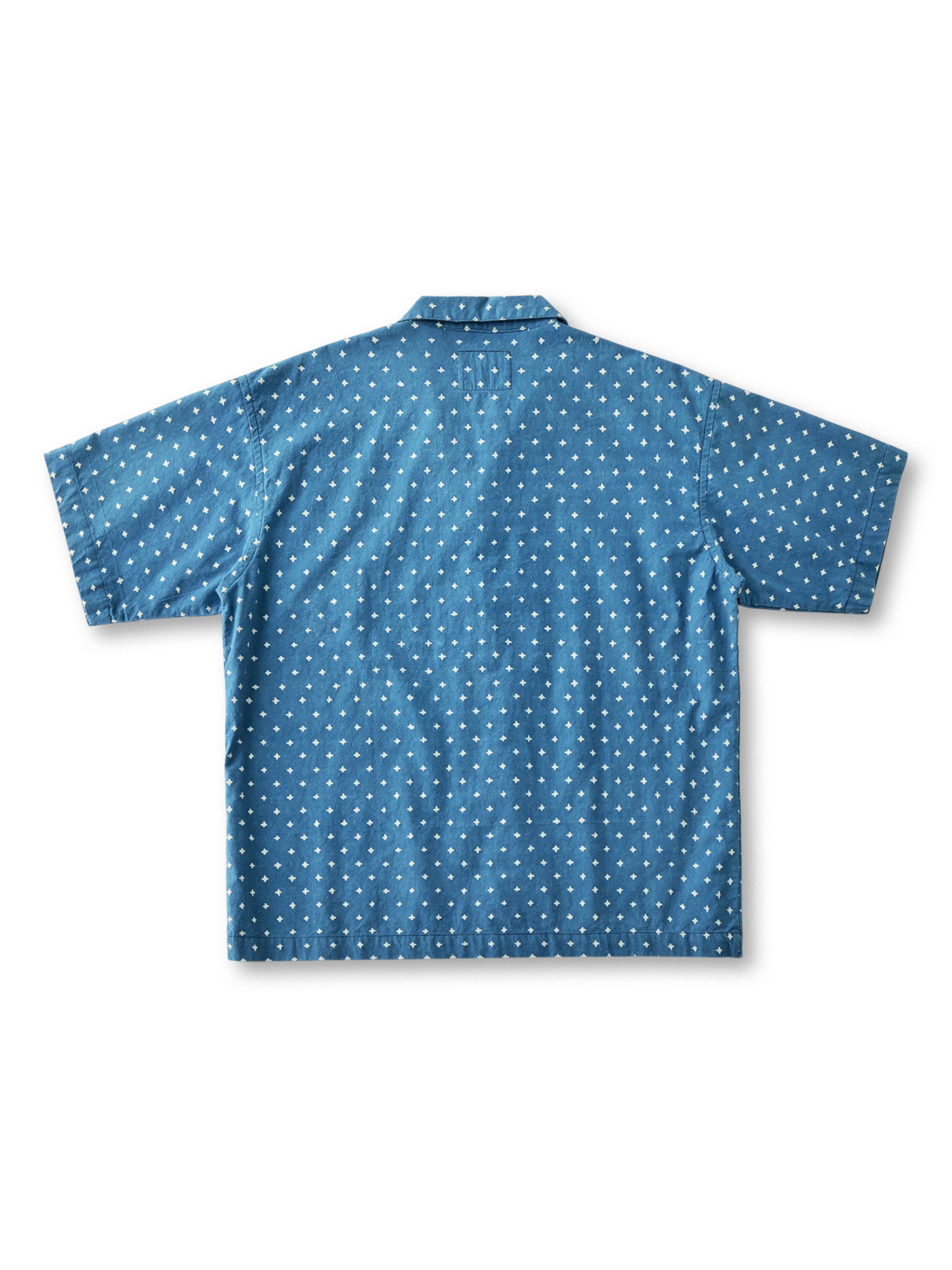 日本の藍甕で一枚ずつ手作業で染め上げた210gの平織コットンは、エンゾ酵素洗いでしなやかな垂れ感とソフトな肌触りを実現。防染には石灰と豆粕ベースの糊を用いた1300年続く型絵染技法を採用し、化学印刷にはない自然な濃淡と「氷裂文様」と呼ばれる風合いが特色。開襟のキューバ衿とボックスシルエットが涼しげなシルエットを呼び、着るほどに深まる藍色の経年変化も楽しめます。