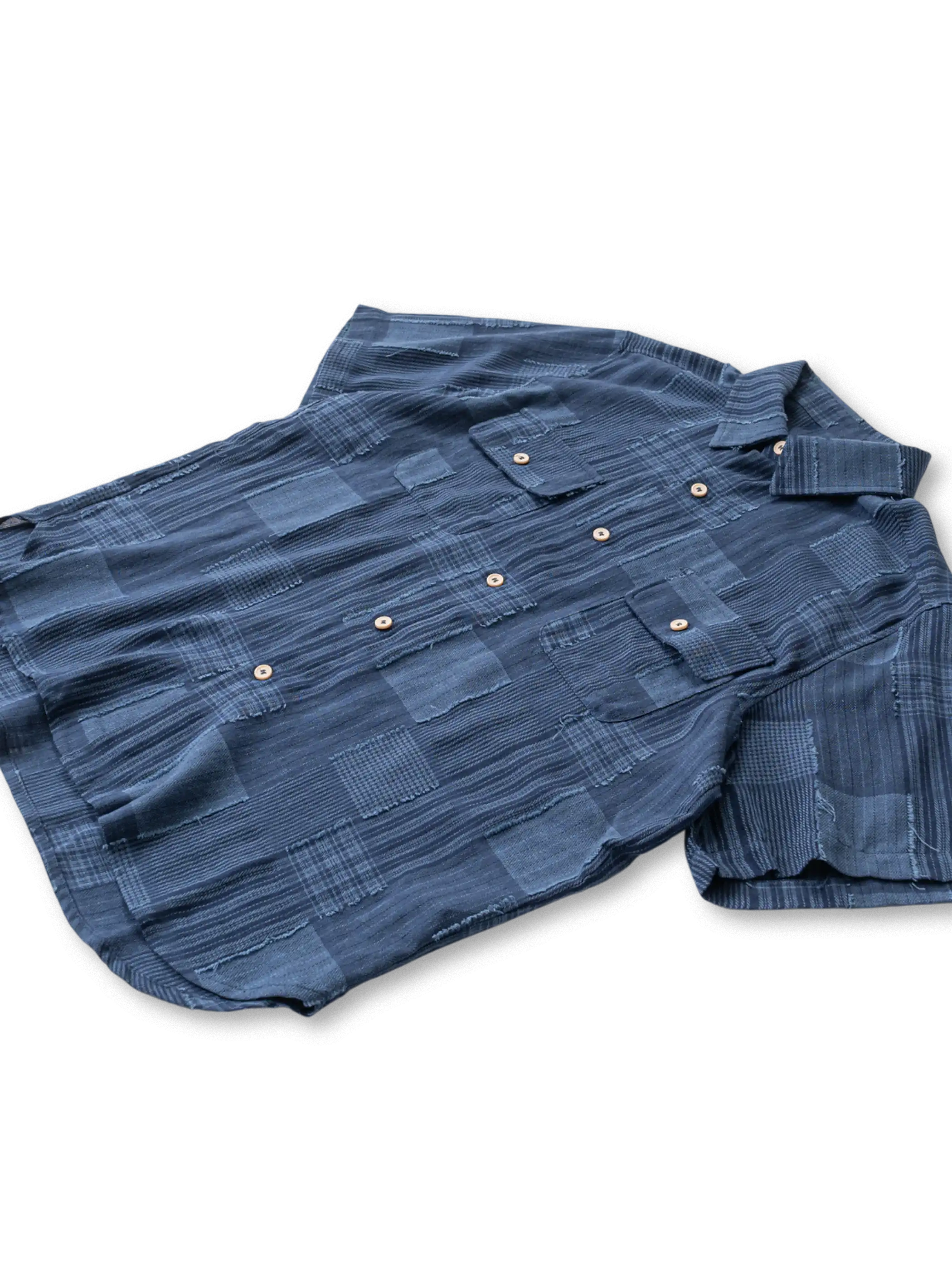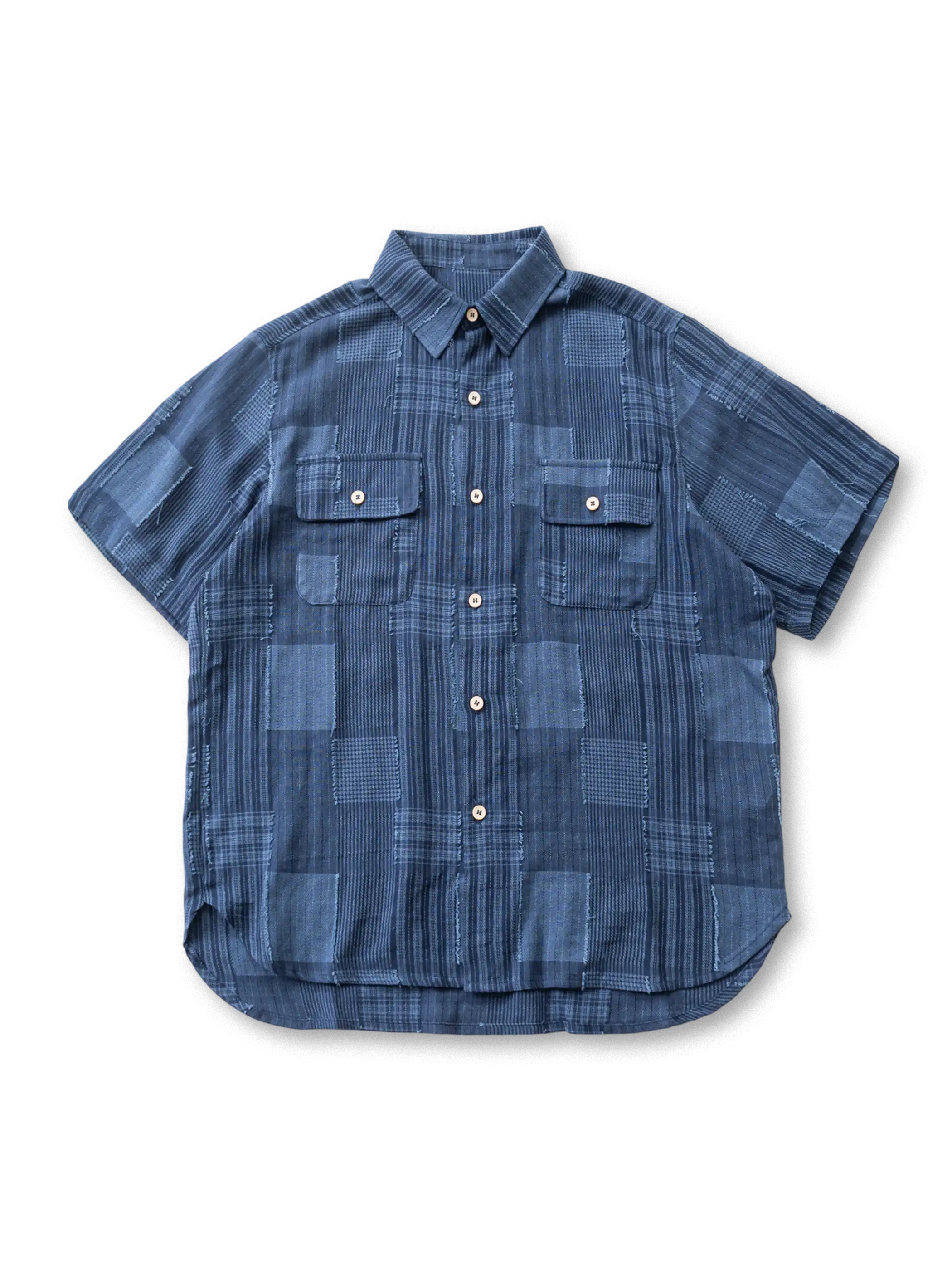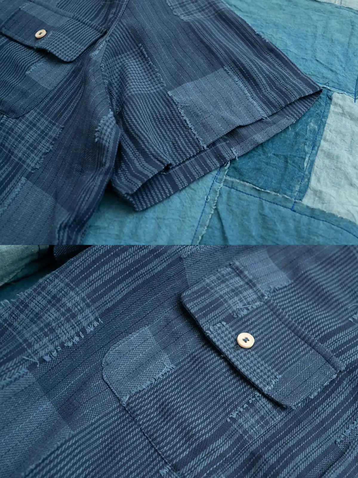 インディゴトーンのストライプとブロックチェックを大胆に組み合わせたパッチワークが、一枚で個性を主張するデザイン。胸元のフラップポケットは収納性とアクセントを兼ね備え、生地は軽やかなコットン100%で汗ばむ季節にもさらっと快適。裾はラウンドヘムでタックイン・アウト問わずバランス良く着用できます。