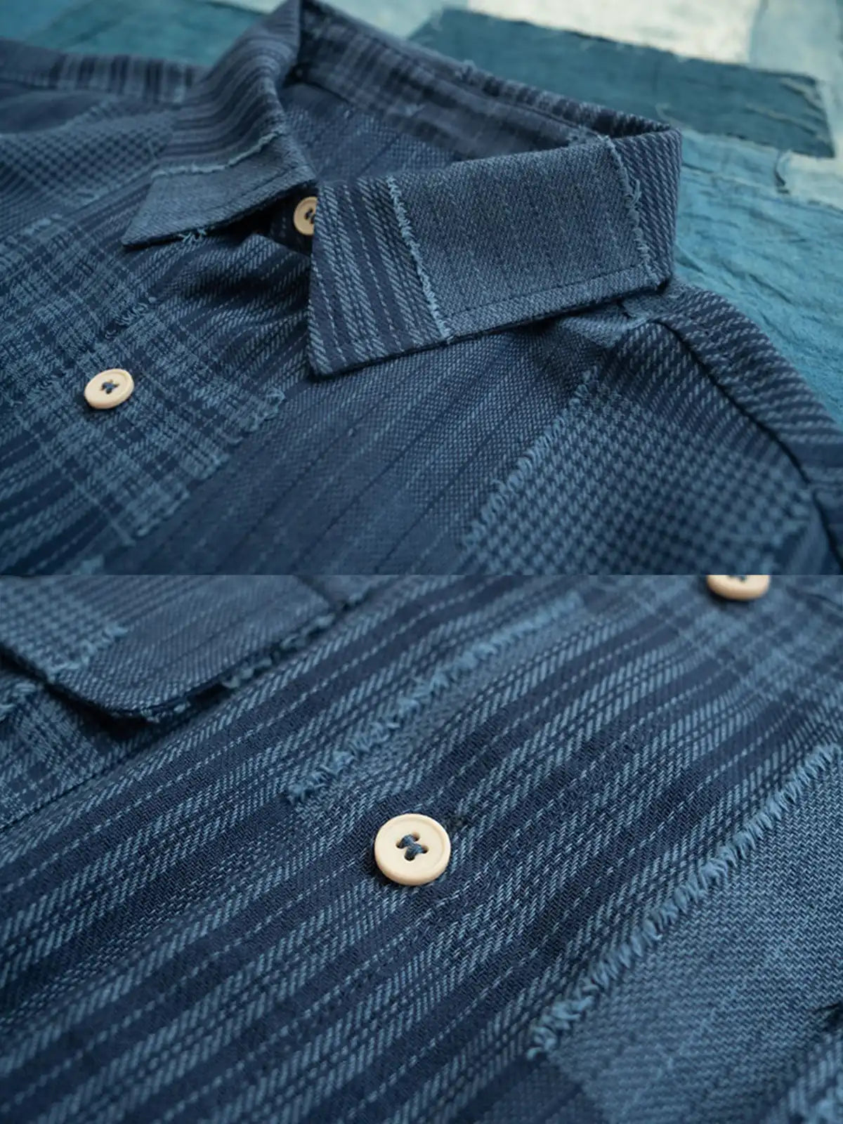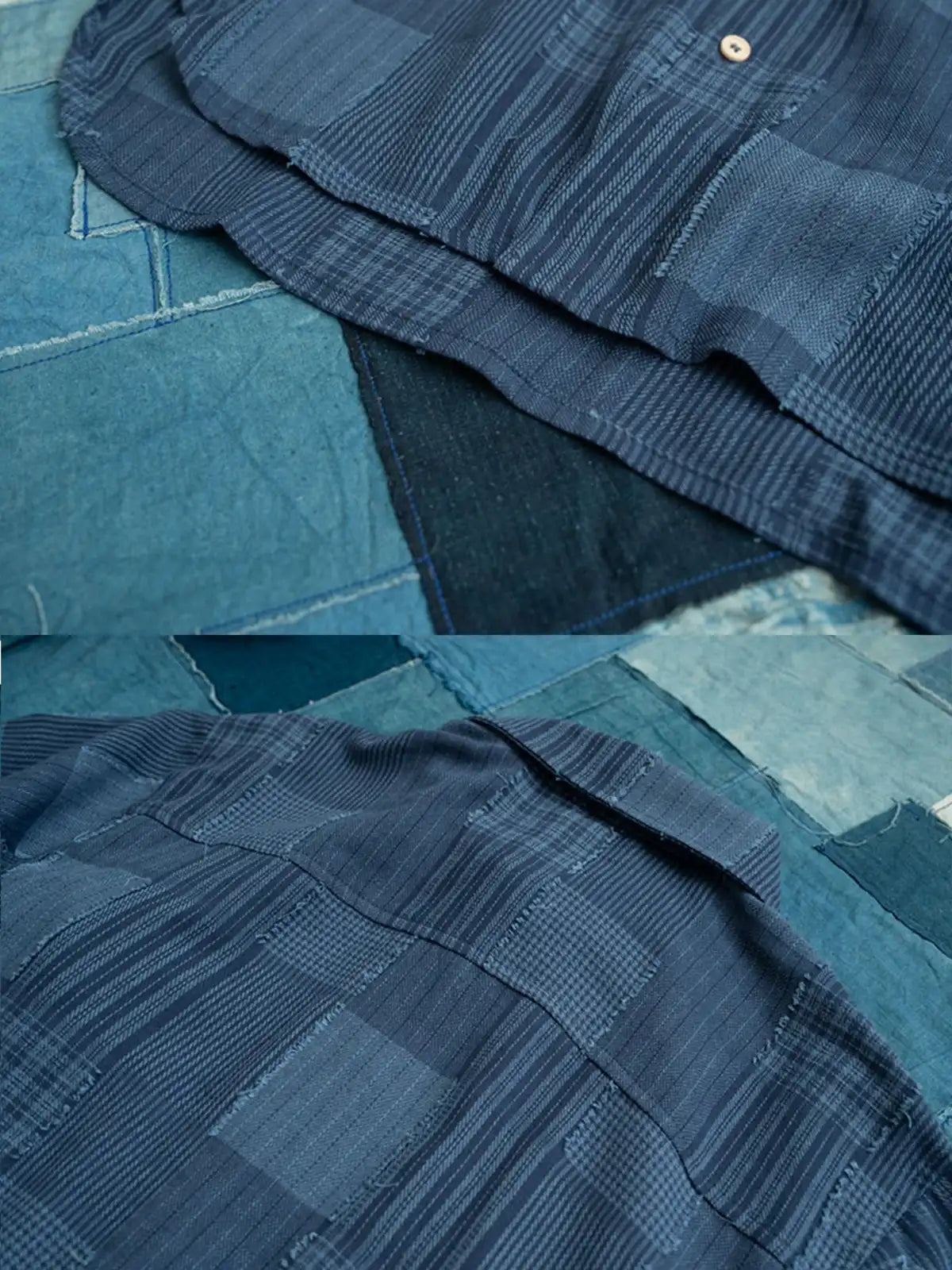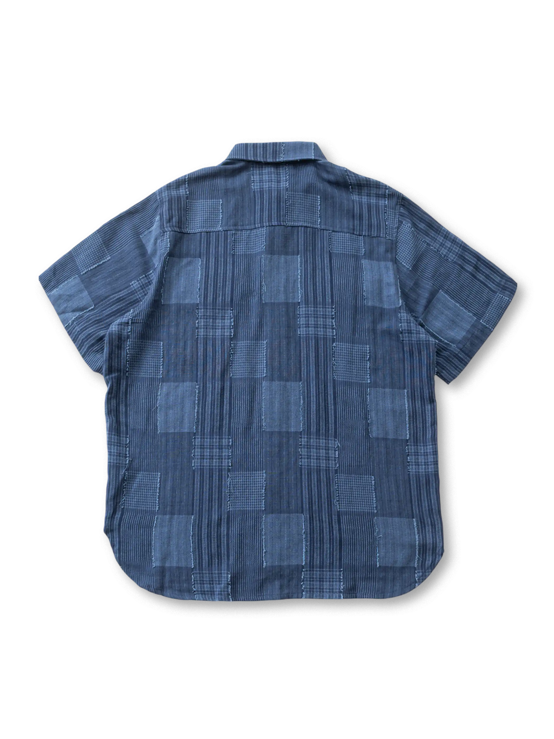 インディゴトーンのストライプとブロックチェックを大胆に組み合わせたパッチワークが、一枚で個性を主張するデザイン。胸元のフラップポケットは収納性とアクセントを兼ね備え、生地は軽やかなコットン100%で汗ばむ季節にもさらっと快適。裾はラウンドヘムでタックイン・アウト問わずバランス良く着用できます。