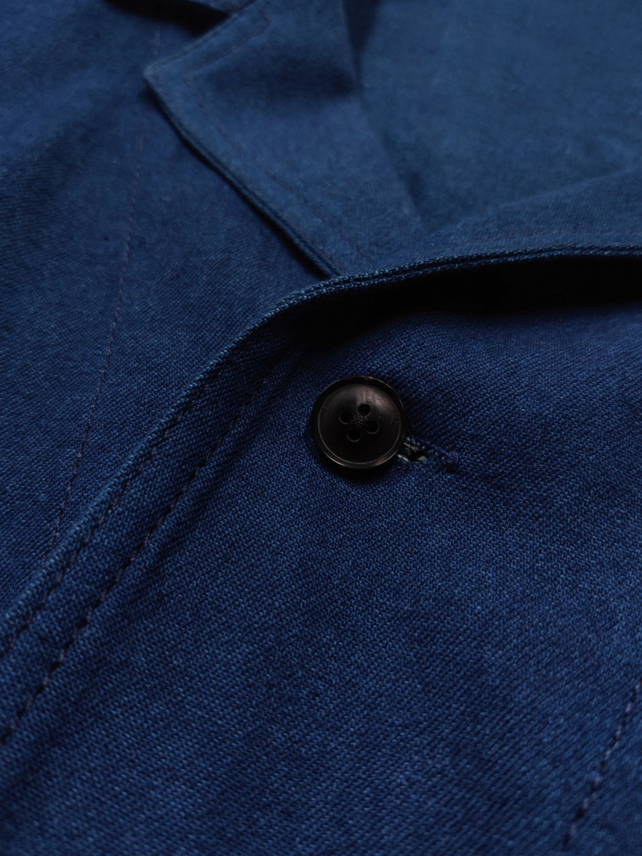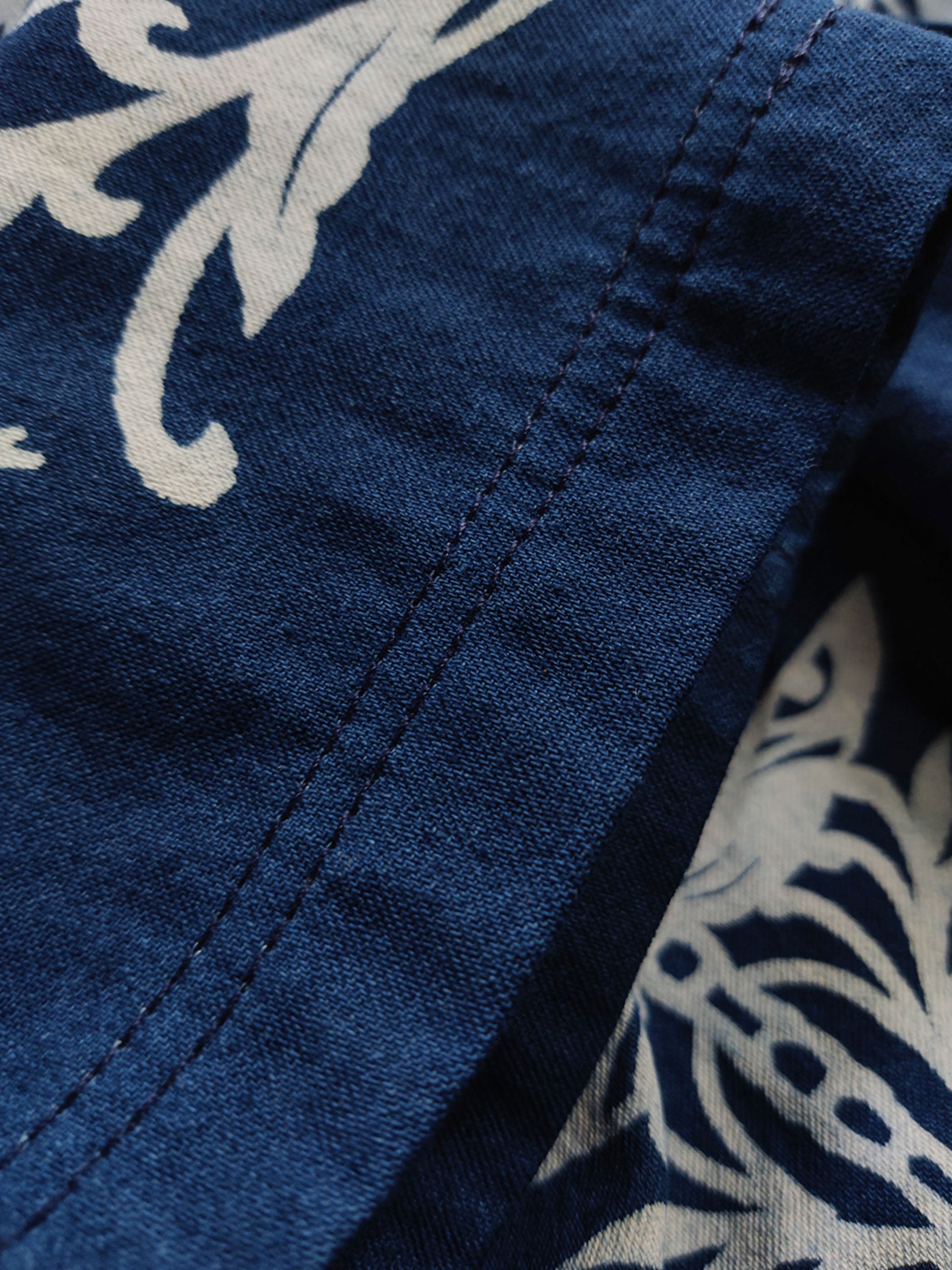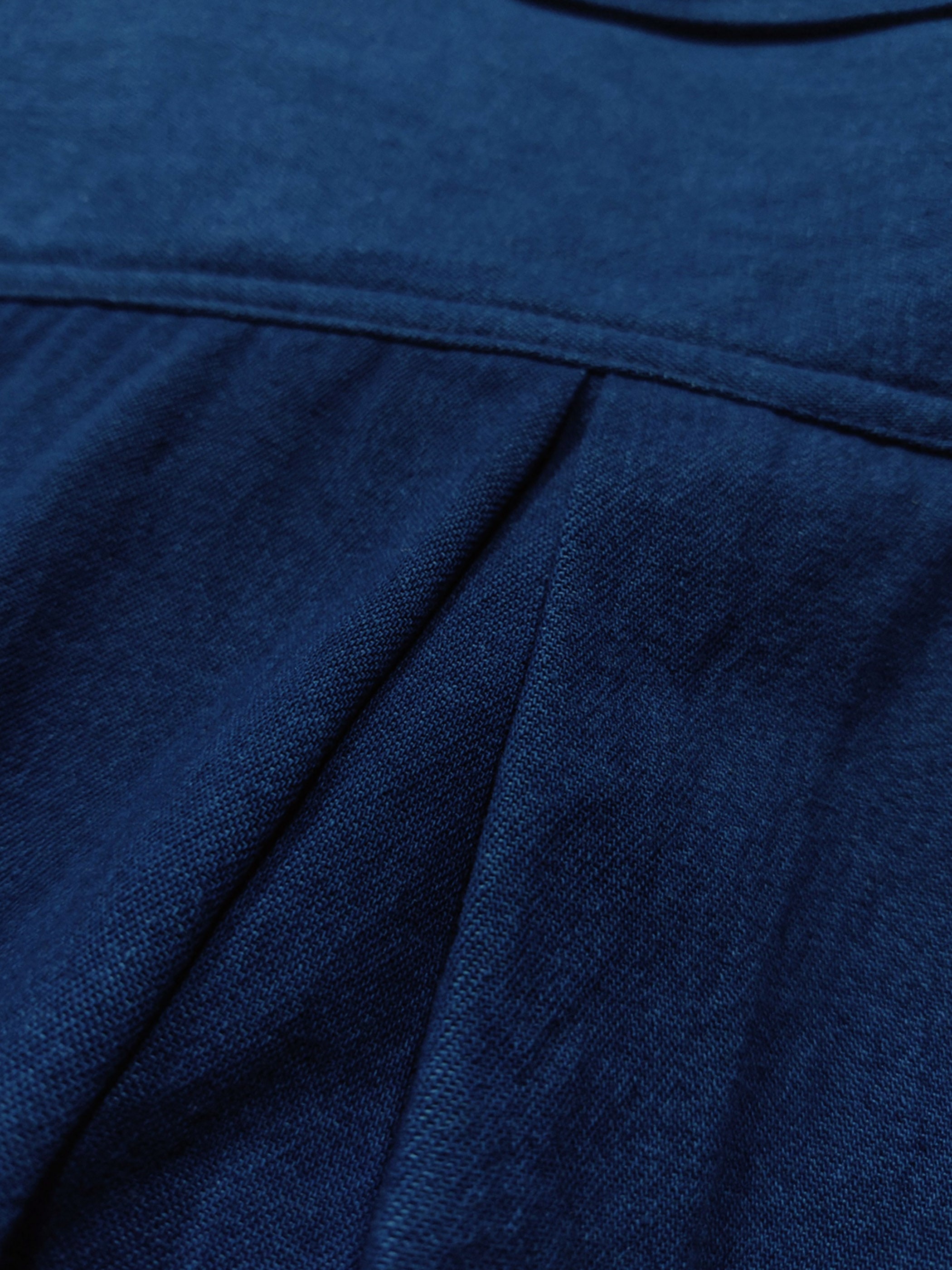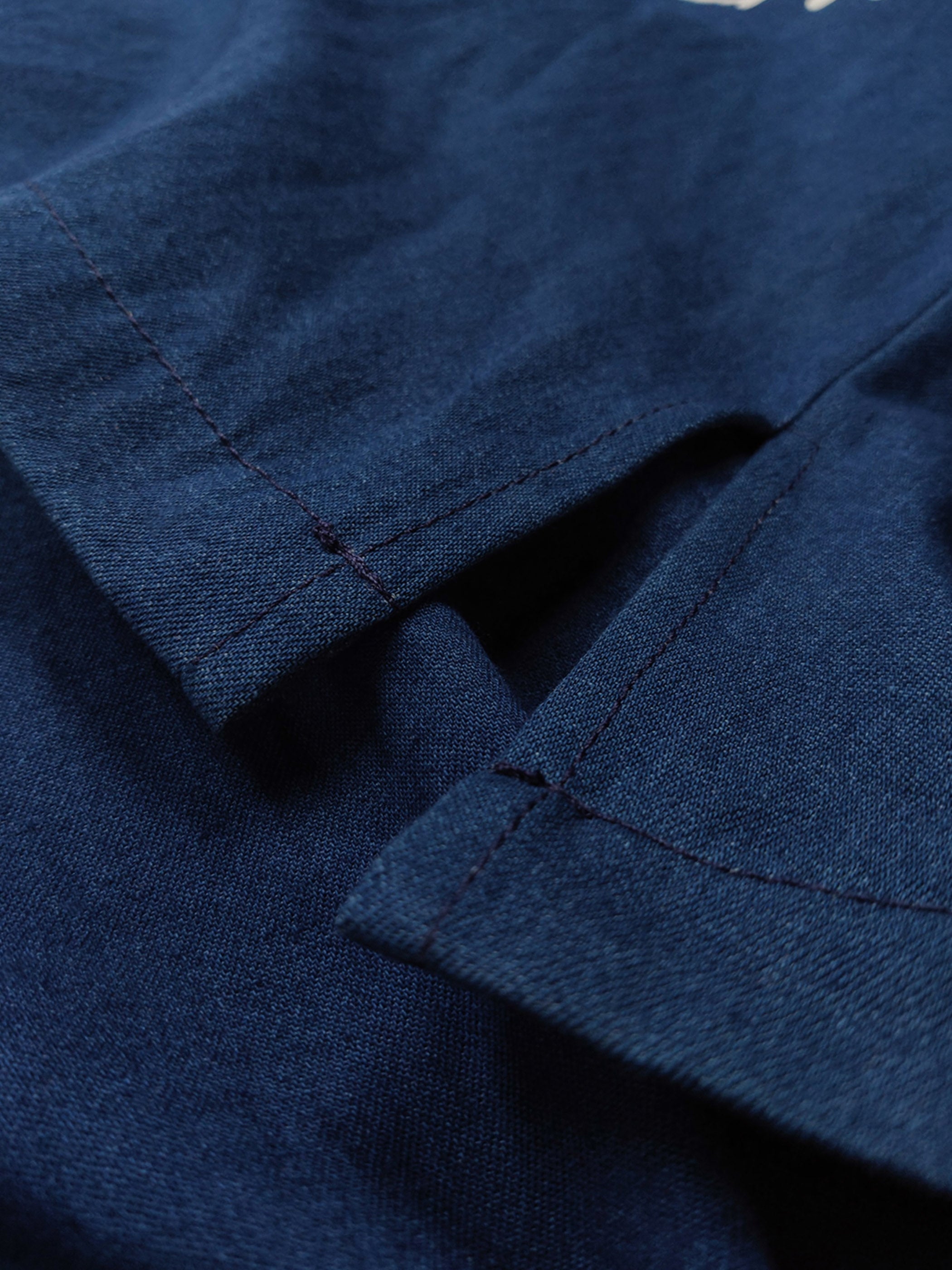生地にはコットン素材を使用して、柔らかさと耐久性を兼ね備え、吸湿性と速乾性にも優れていますので、どんな季節でも快適に着用できます。藍染の技法によって洗練された靛藍色を表現しています。