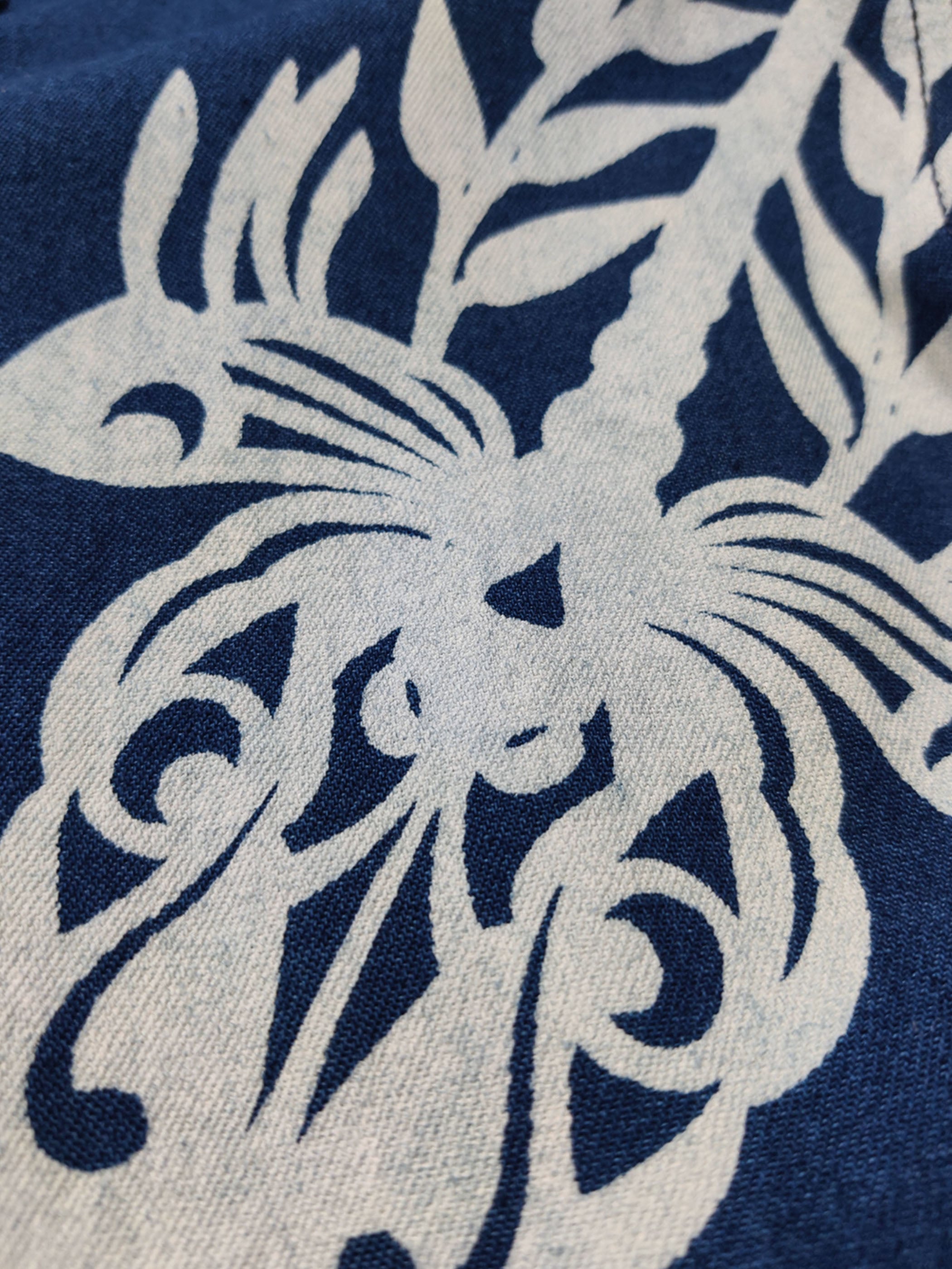 綿の斜織り生地を使用し、深い青色に染め上げ、伝統的な脱染技法を経て、レトロなトンボの柄が加えられ、淡化効果と独特なレトロスタイルを演出しています。