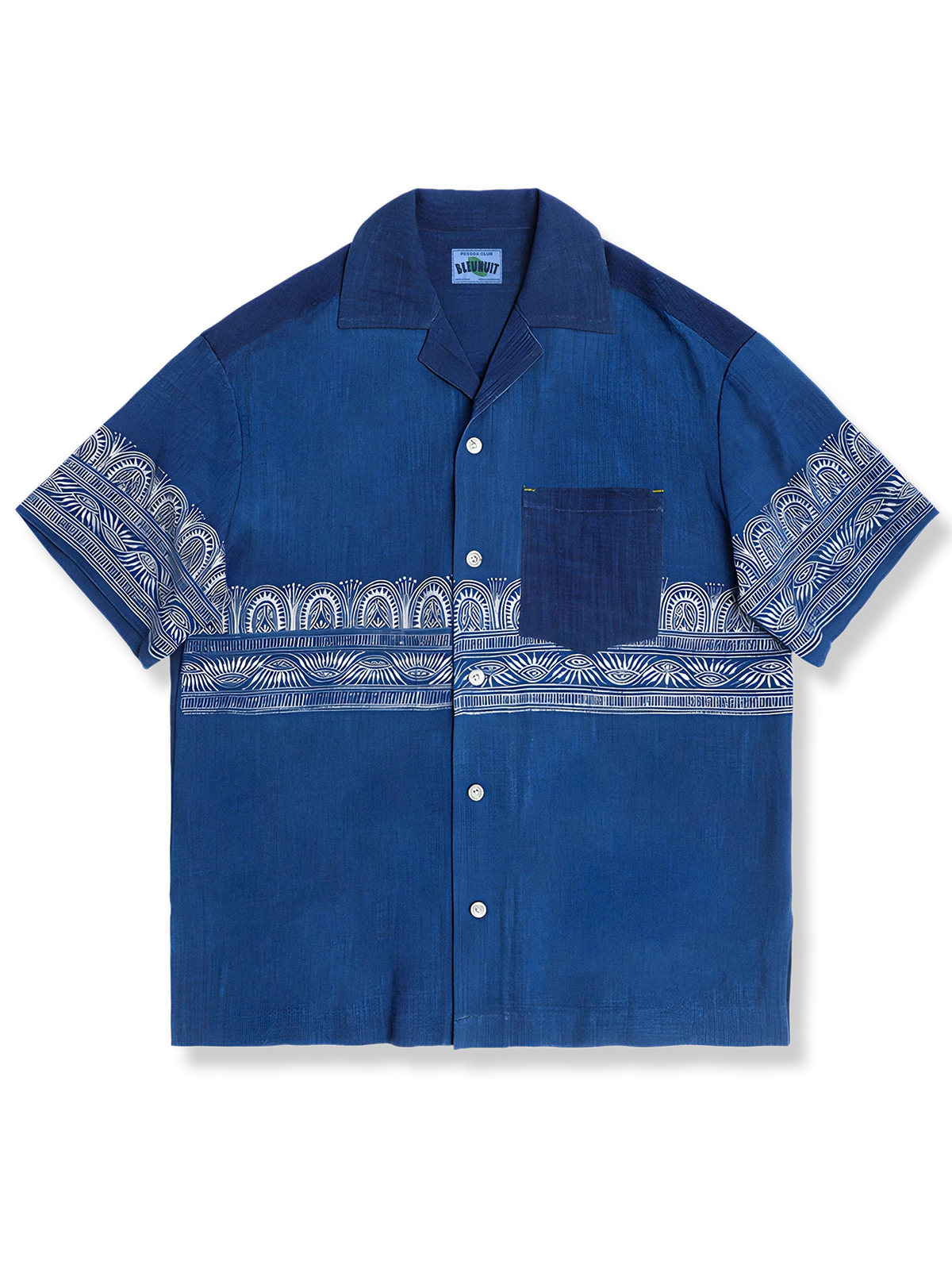 民族的なデザインが特徴的なキューバシャツは、藍染め生地に蝋結染加工を施しているため、フェード感やヴィンテージ感が演出されています。手作りされたため、一着ずつ微妙に異なる表情を持ち、胸元ポケットや飾りボタンなどの細かなディテールがポイント。