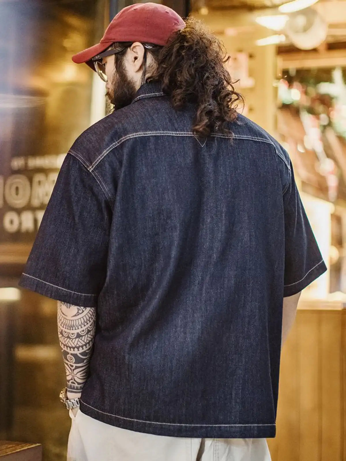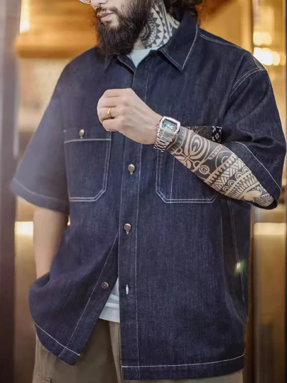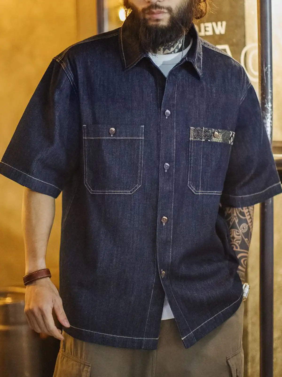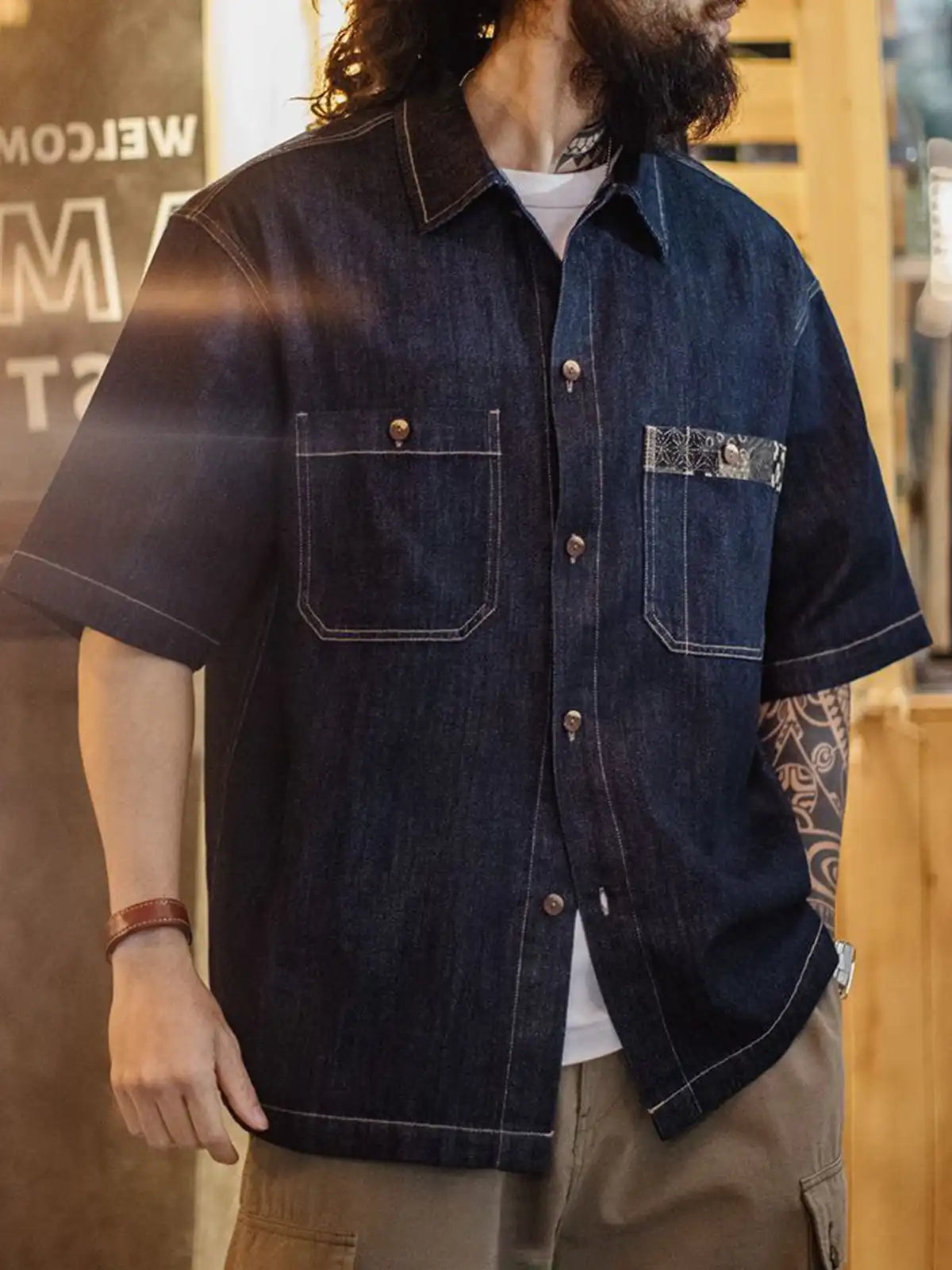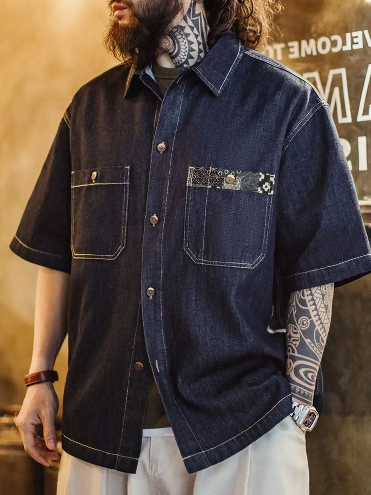 デジタルプリント技術で江戸時代の藍染古布パターンを再現し、胸ポケットにパッチのように縫い付けて90年代のヴィンテージ感を演出。284g/m²のコットン65.4% × ライセル34.6%混紡デニム生地を使用し、適度な落ち感と柔らかな肌触りが特徴。椰木ボタンや配色ステッチで、アメカジと和の要素をバランスよくミックス。デニム特有の経年変化も楽しめるため、夏のワードローブに個性的なアクセントを加えてくれます。