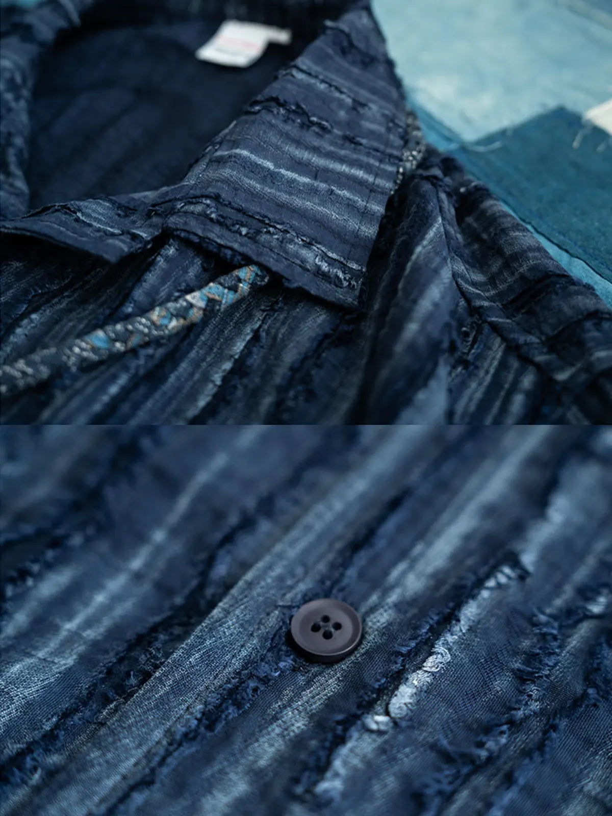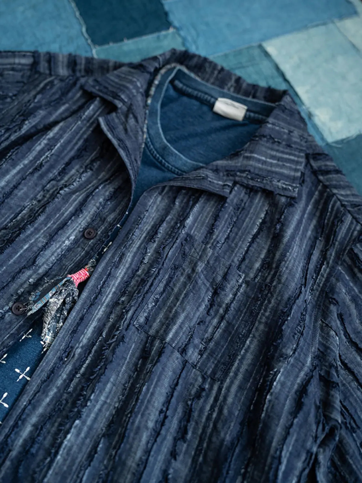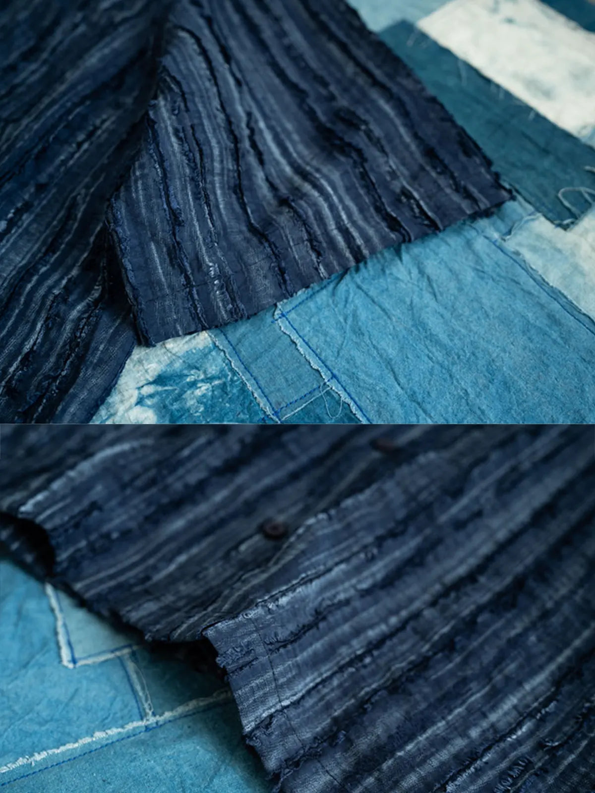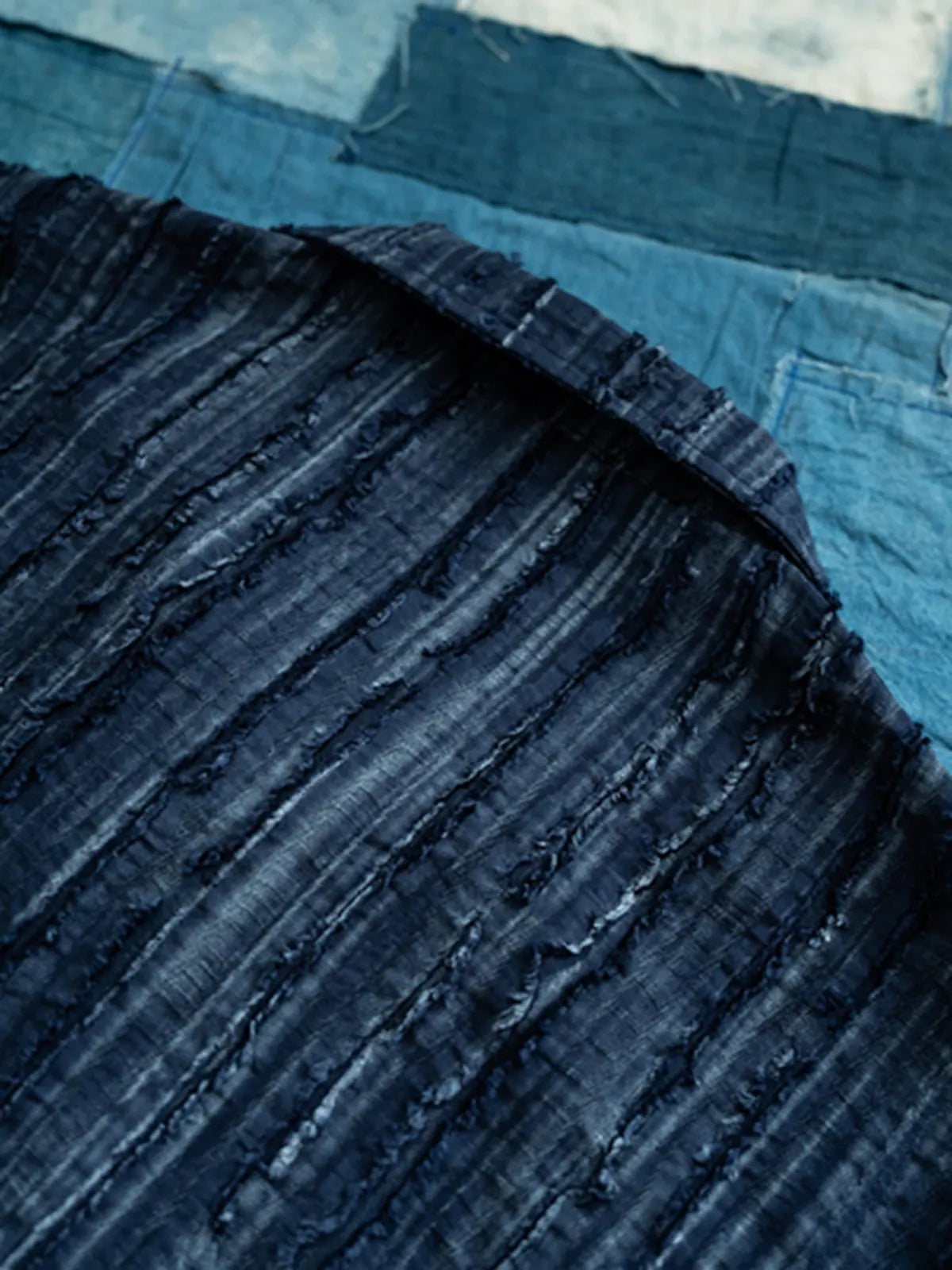 天然染め風のインディゴ調と立体的なシェアード加工で、涼しさと品格を纏う夏の一着。