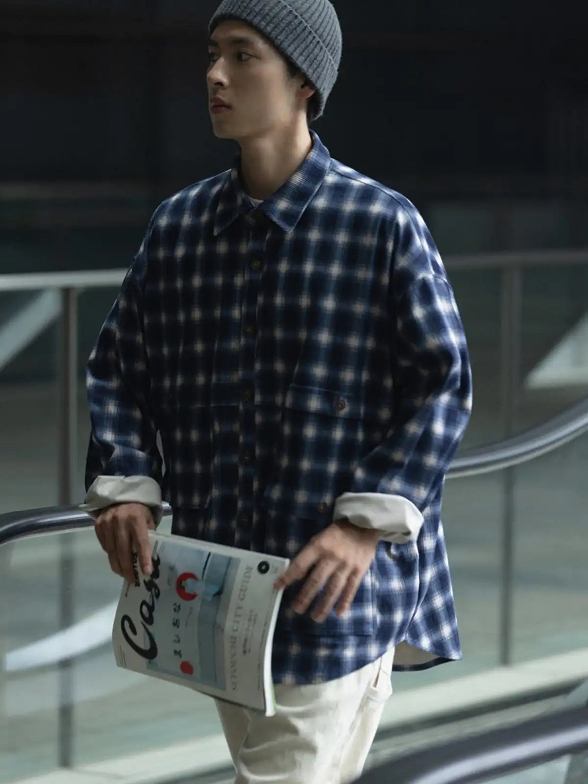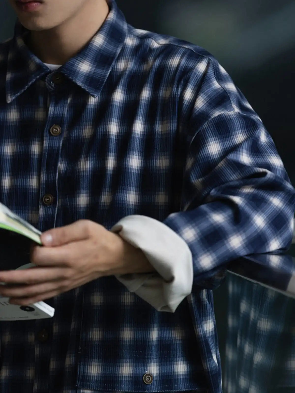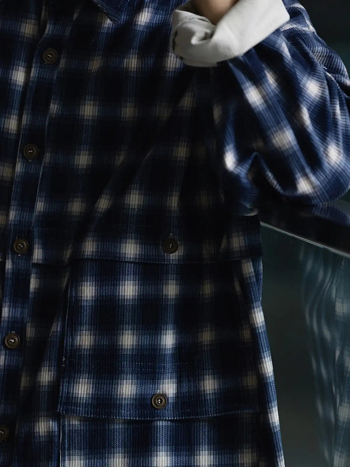 柔らかなコーデュロイ素材に上品なチェック柄を配したルーズフィット長袖シャツ。