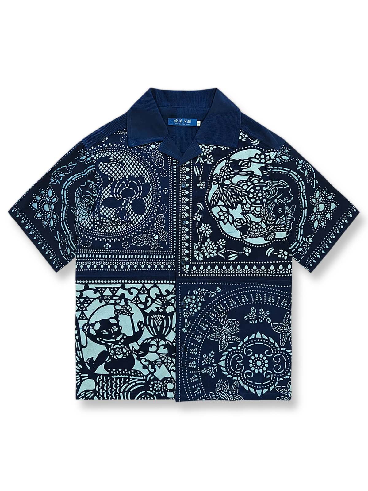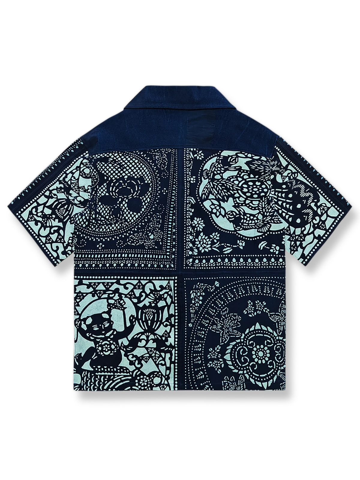 このシャツは、漢代にさかのぼる中国の伝統的な型糊染技術を用いています。蓮や祥雲など、中国文化の象徴的な要素を取り入れたデザインが、東洋の美学を現代のファッションに融合させています。