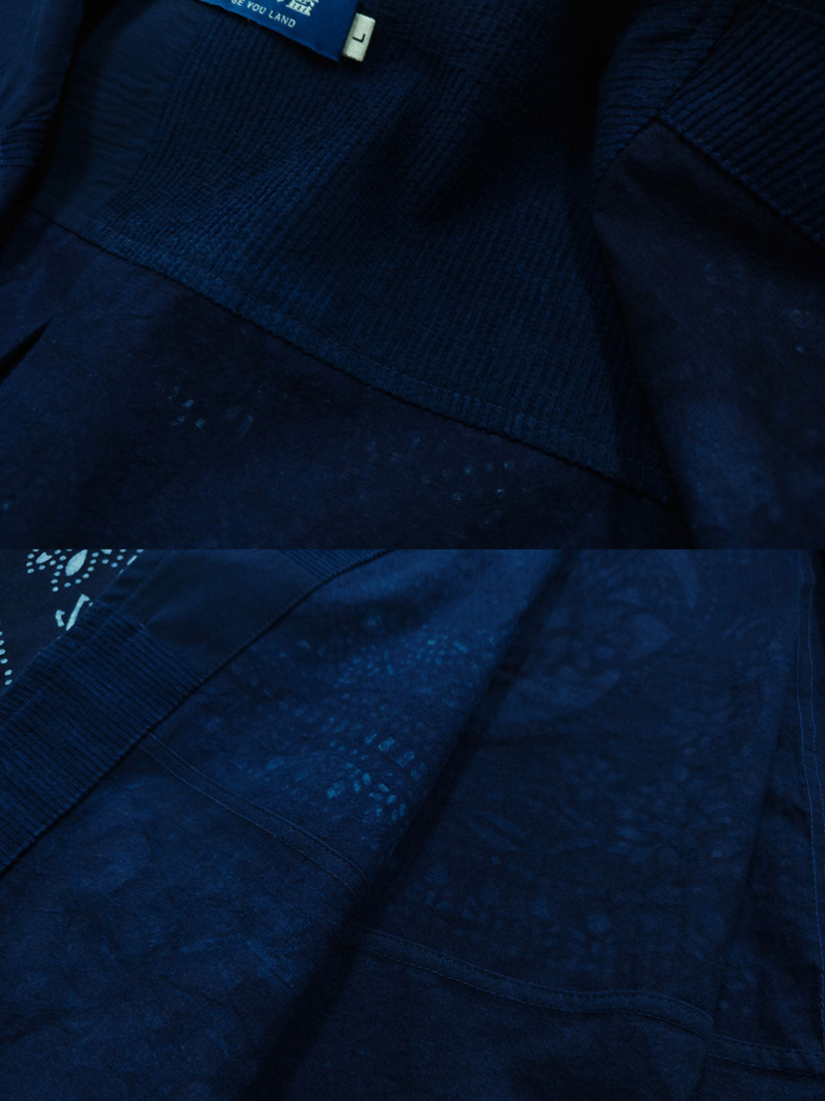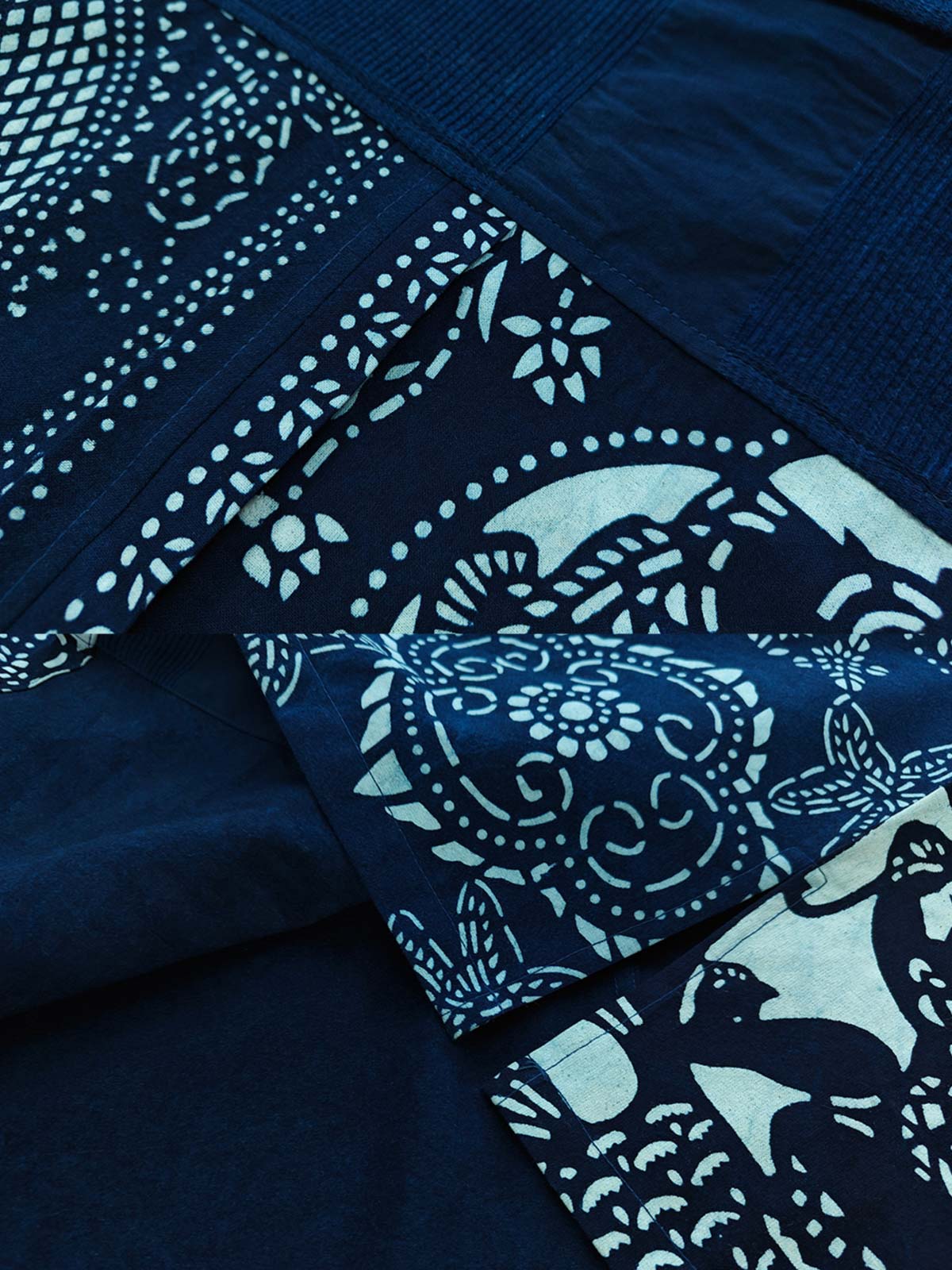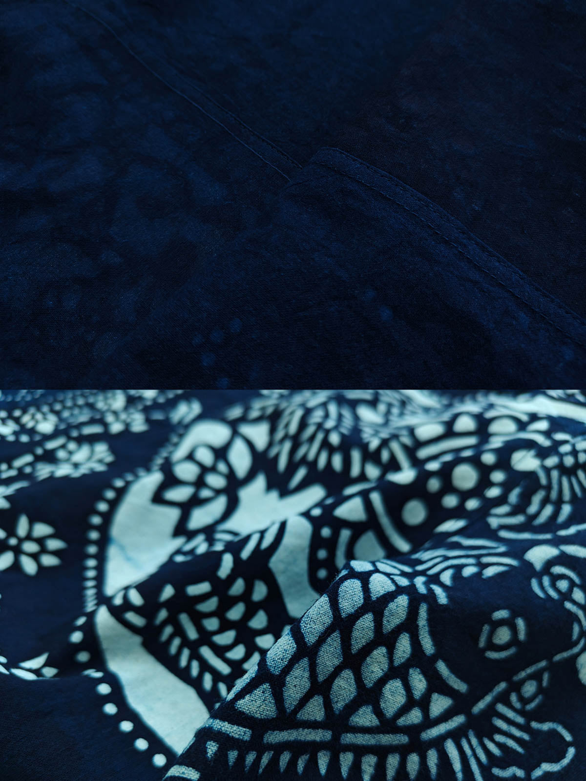 柔らかなコットン素材と植物性インディゴ染料による自然な青色調が特徴です。型糊染技術による布のパターンは手工芸の温もりと精緻なディテールを保ち、各シャツが一点物の美しさを持っています。