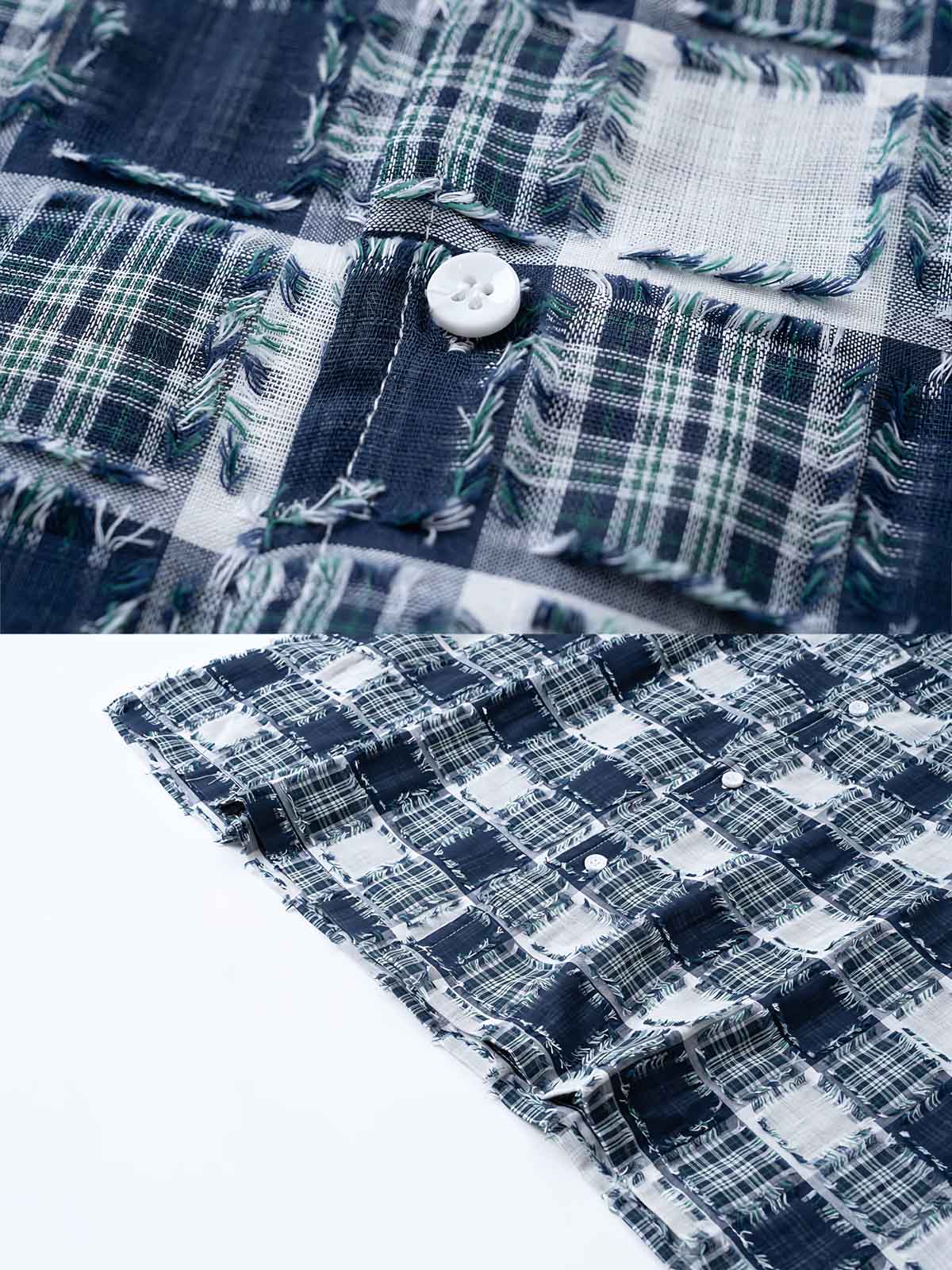 このシャツは、クラシックなブルーとホワイトのチェック柄を基調とし、ヴィンテージ感のあるカジュアルなスタイルを提供します。フリンジデザインが個性的で、デザインに深みを加えています。ゆったりとしたシルエットで、さまざまな体型にフィットし、快適な着心地を提供します。単独でも、インナーとしても、さまざまなスタイルに合わせやすく、日常のお出かけやカジュアルな集まりに最適です。