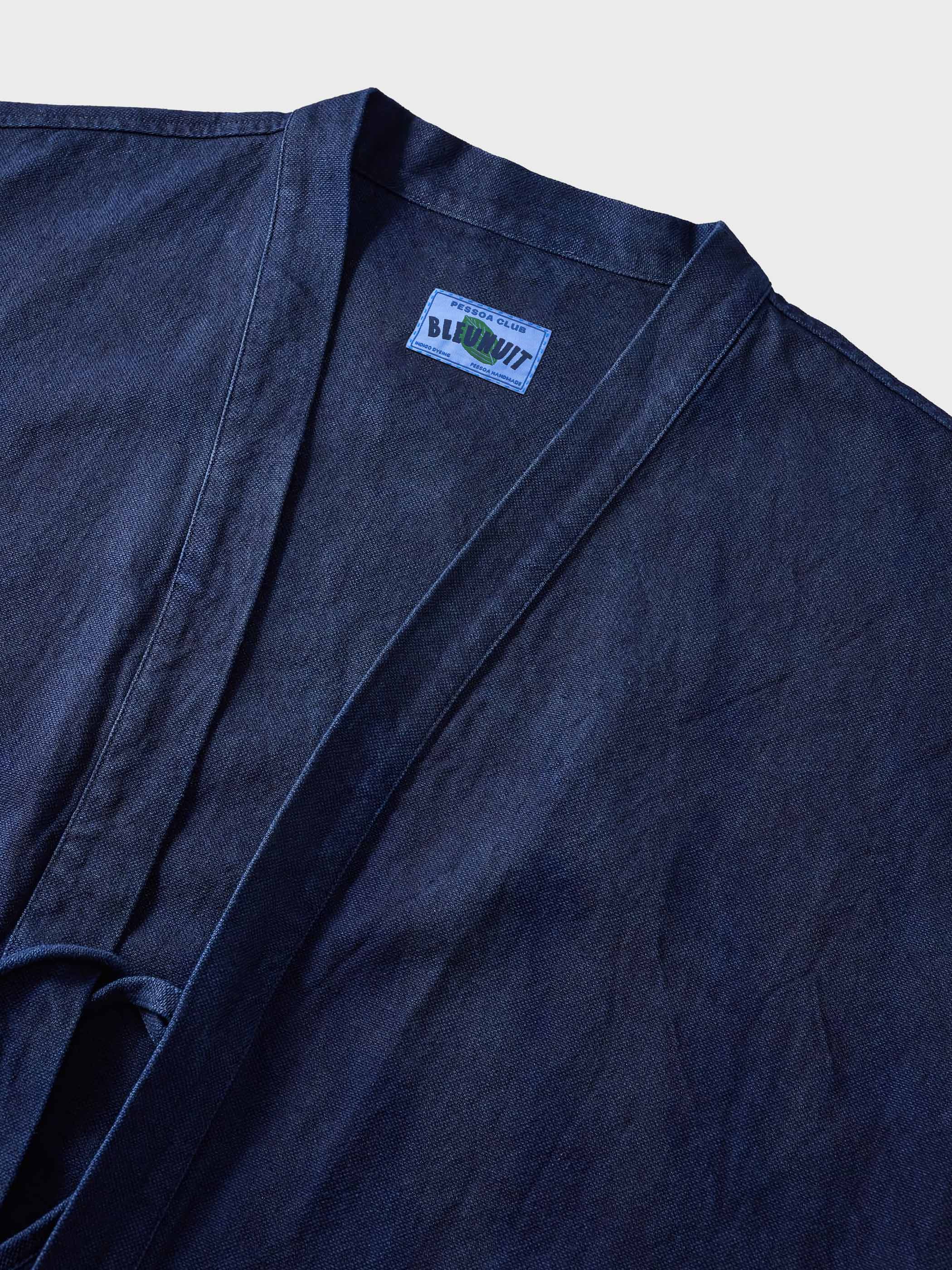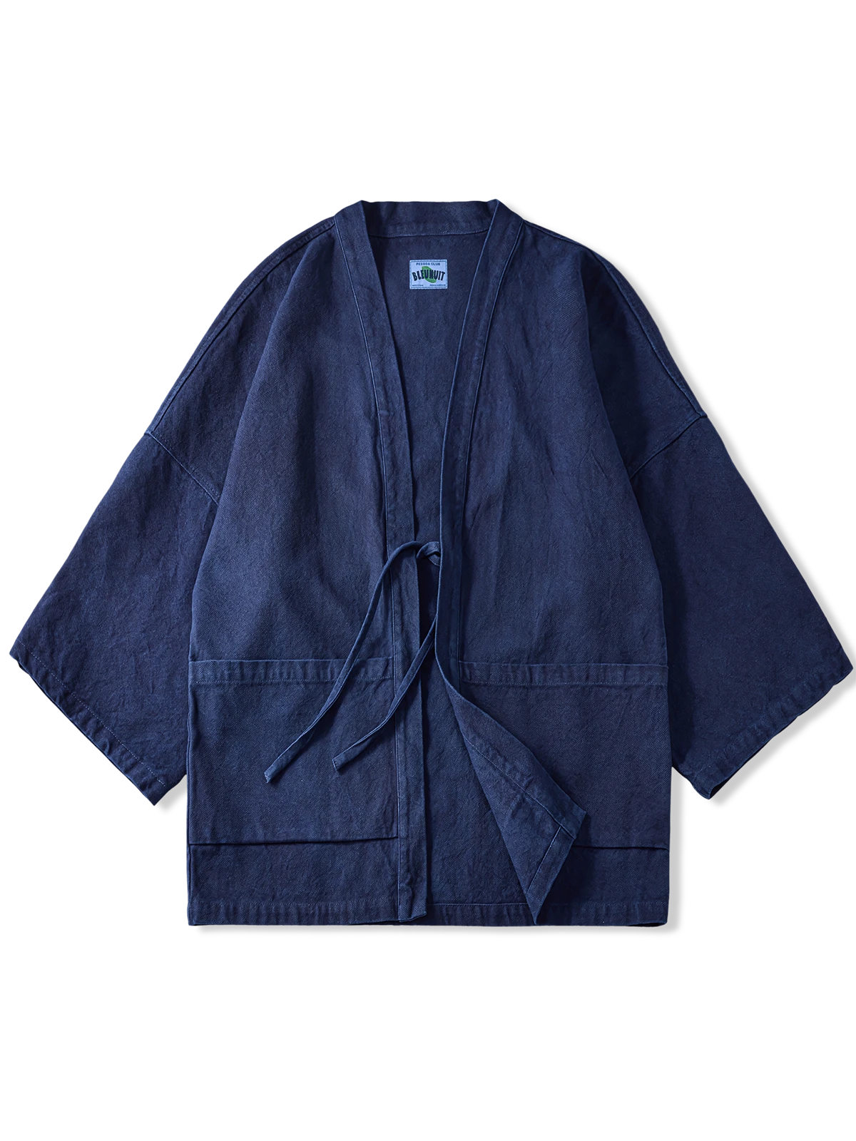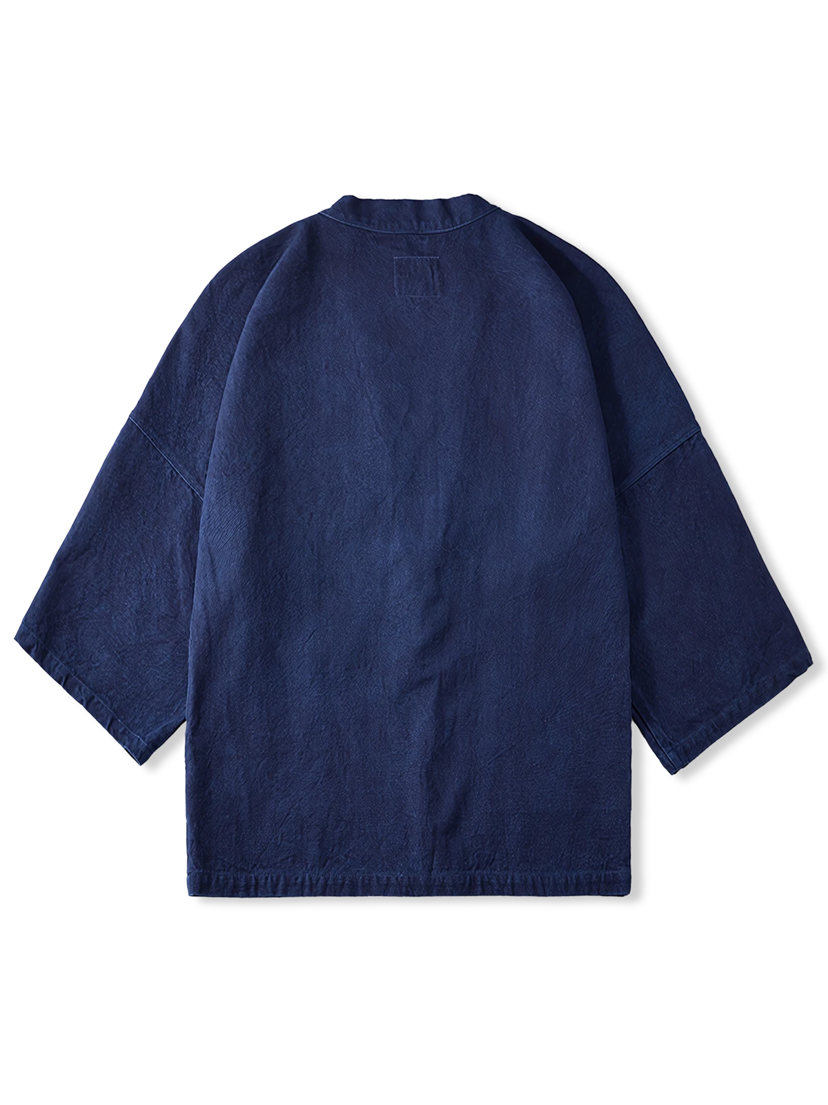この藍染はんてんは、両サイドにある立体的なポケットは、ワンポイントとして機能しています。また、身幅とドロップショルダーを落としたゆったりとしたシルエットが、様々なスタイルに合わせやすく、リラックス感のある開襟デザインも特徴的です。洗うほどに藍の渋さが深まる古典的なデザインも魅力の一つです。