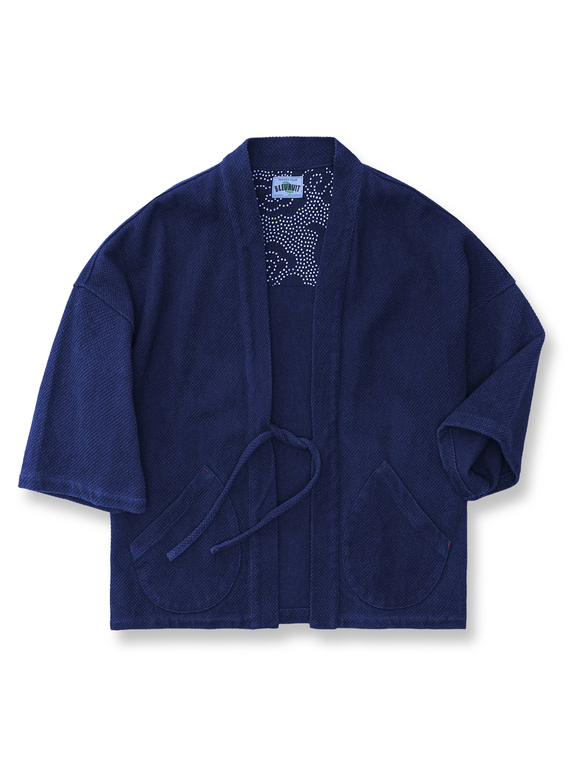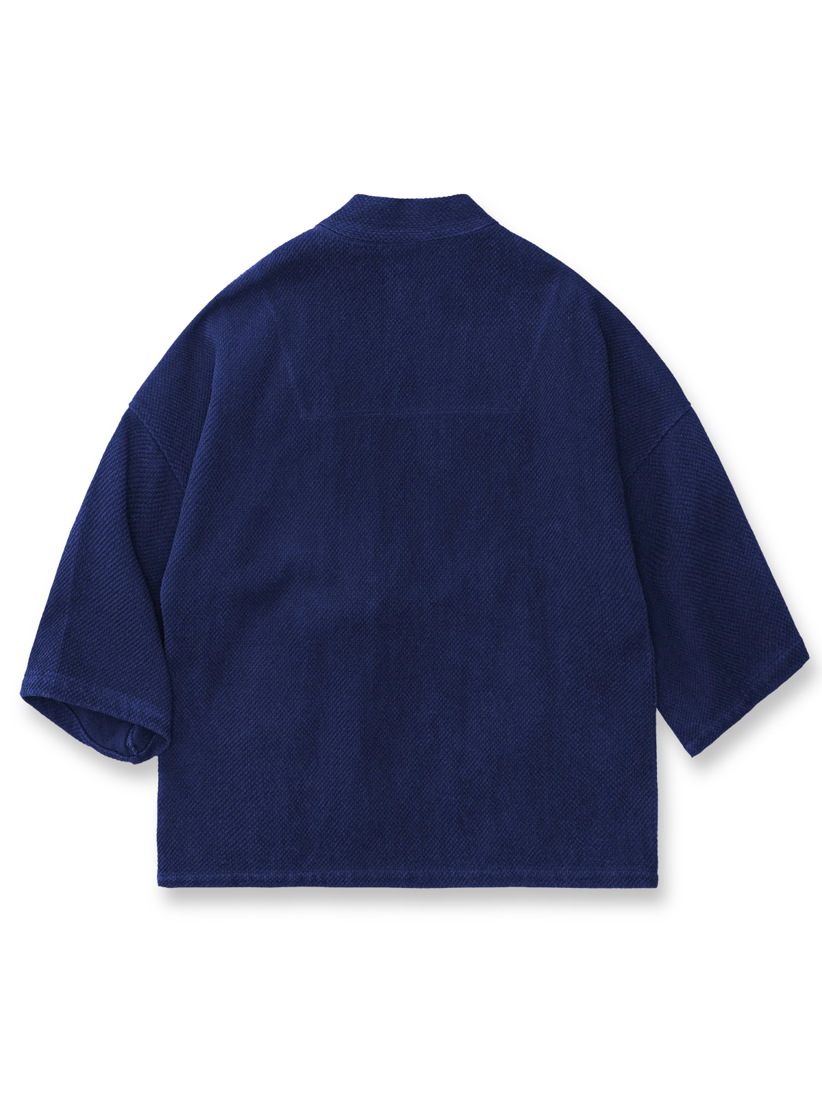 藍染は一から手作業で行われ、時間をかけて丁寧に織られた刺し子織り生地は、平織には無い高級感のある美しい陰影を作り出します。着るほどに肌になじみ、洗うほどに藍の渋さが深まる古典的な銘品です。