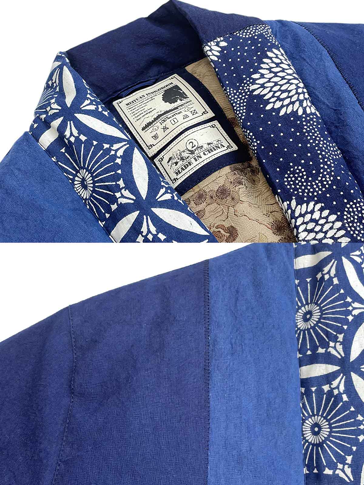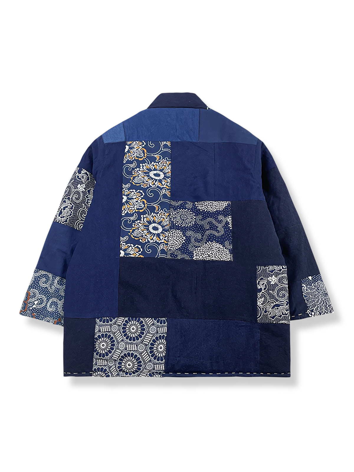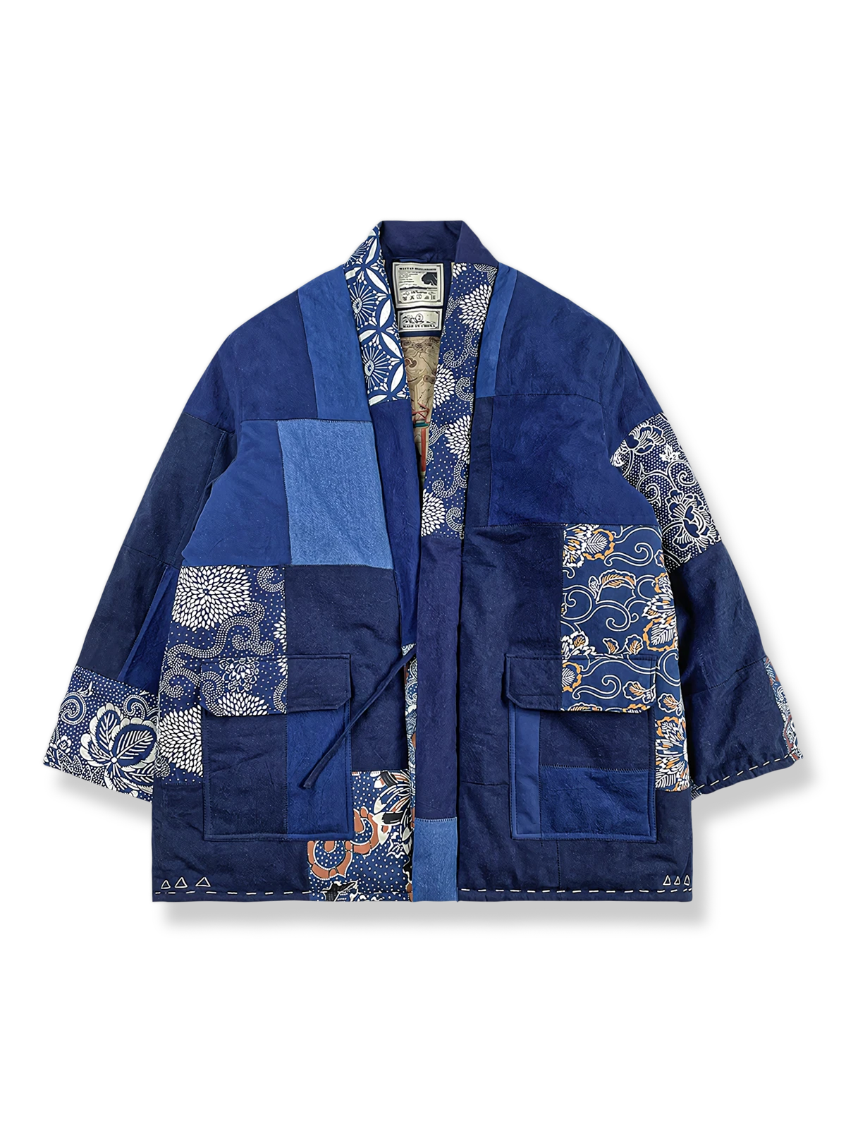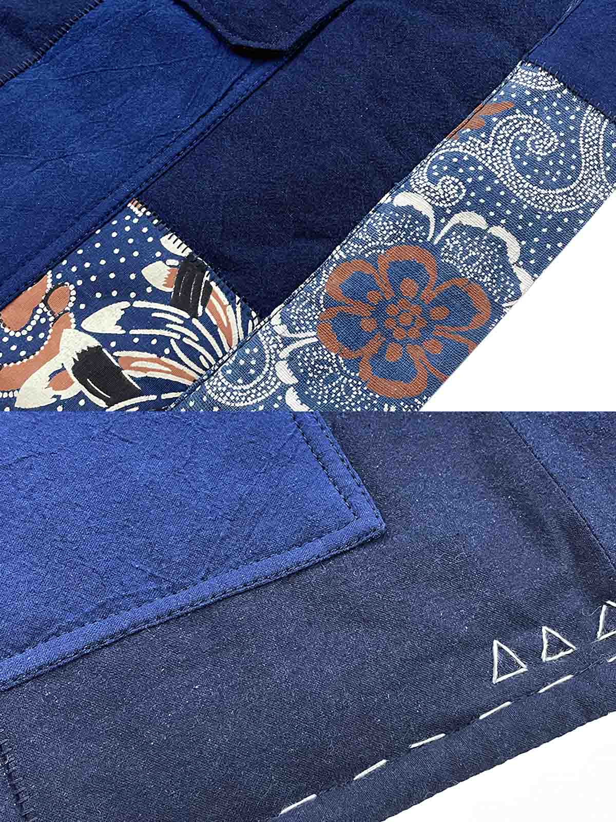 このコートの素材は詳細に富んでおり、藍染めと絞り染めの技術が衣服に独特の色の深みとパターンの変化をもたらしています。刺し子コットンの使用は、追加の暖かさを提供するだけでなく、荒々しい質感と手仕事の美しさも表現しています。