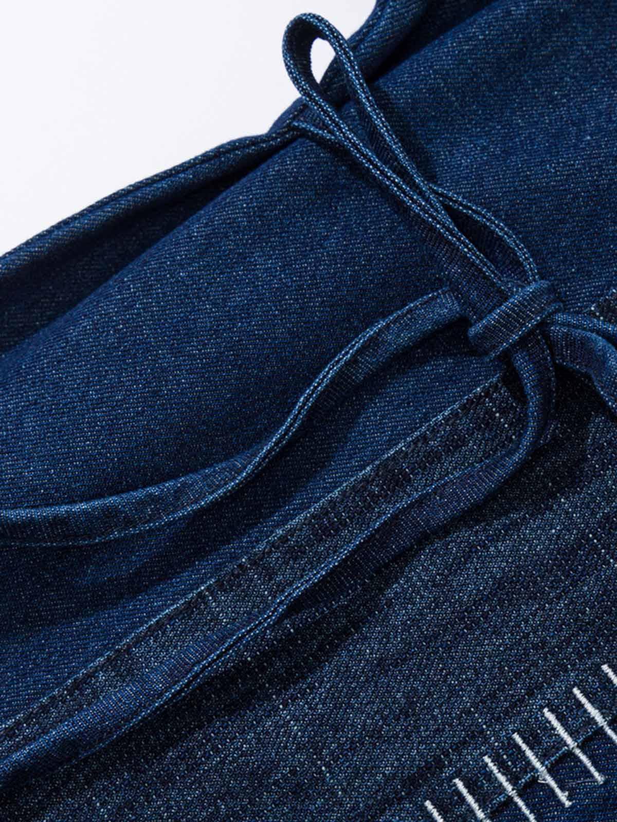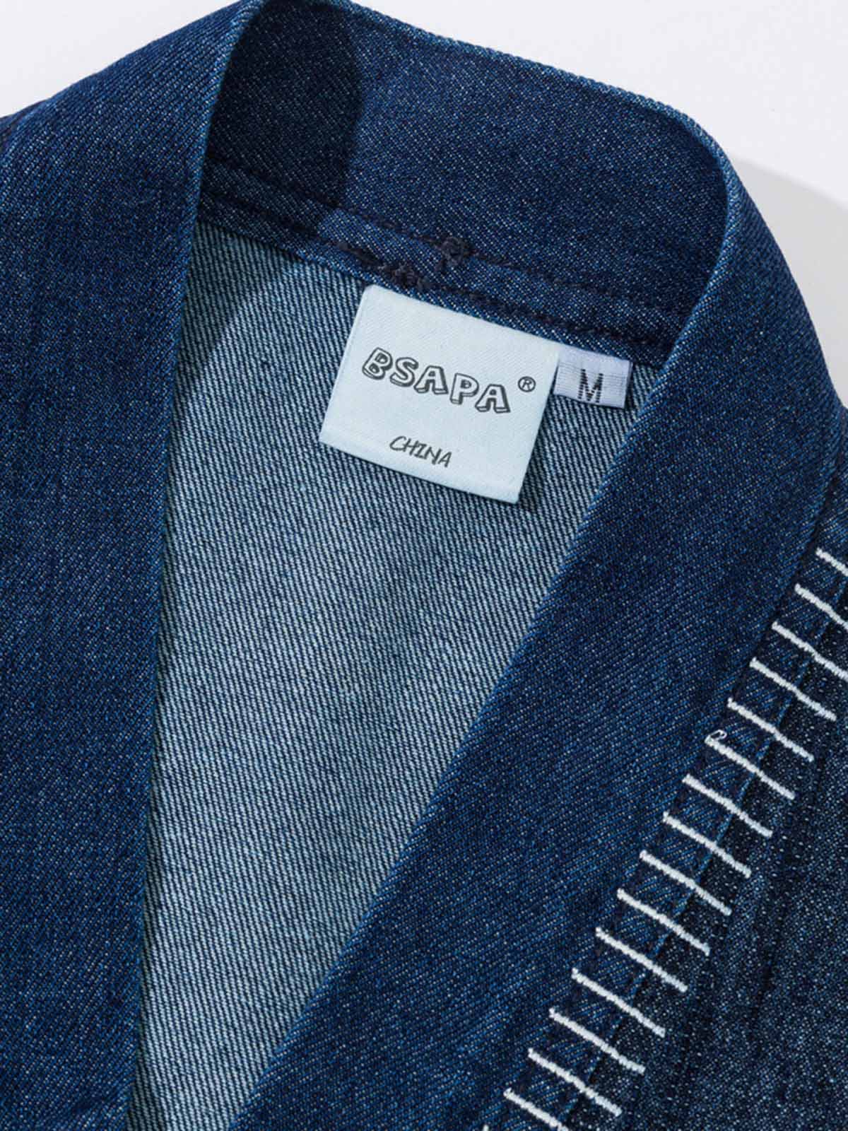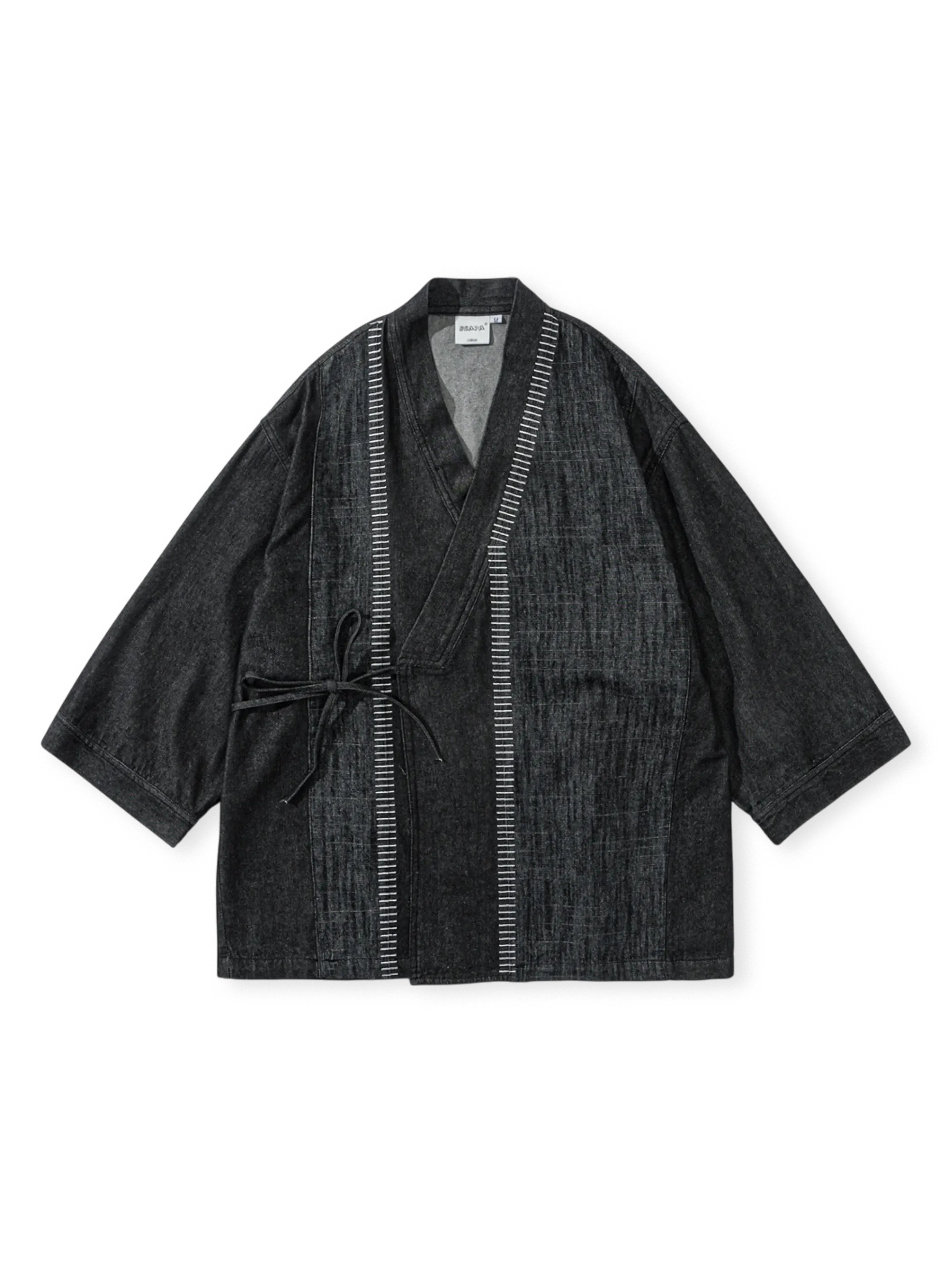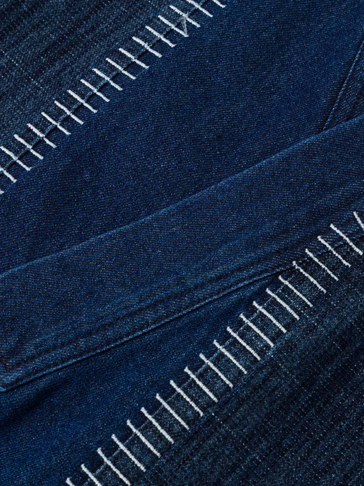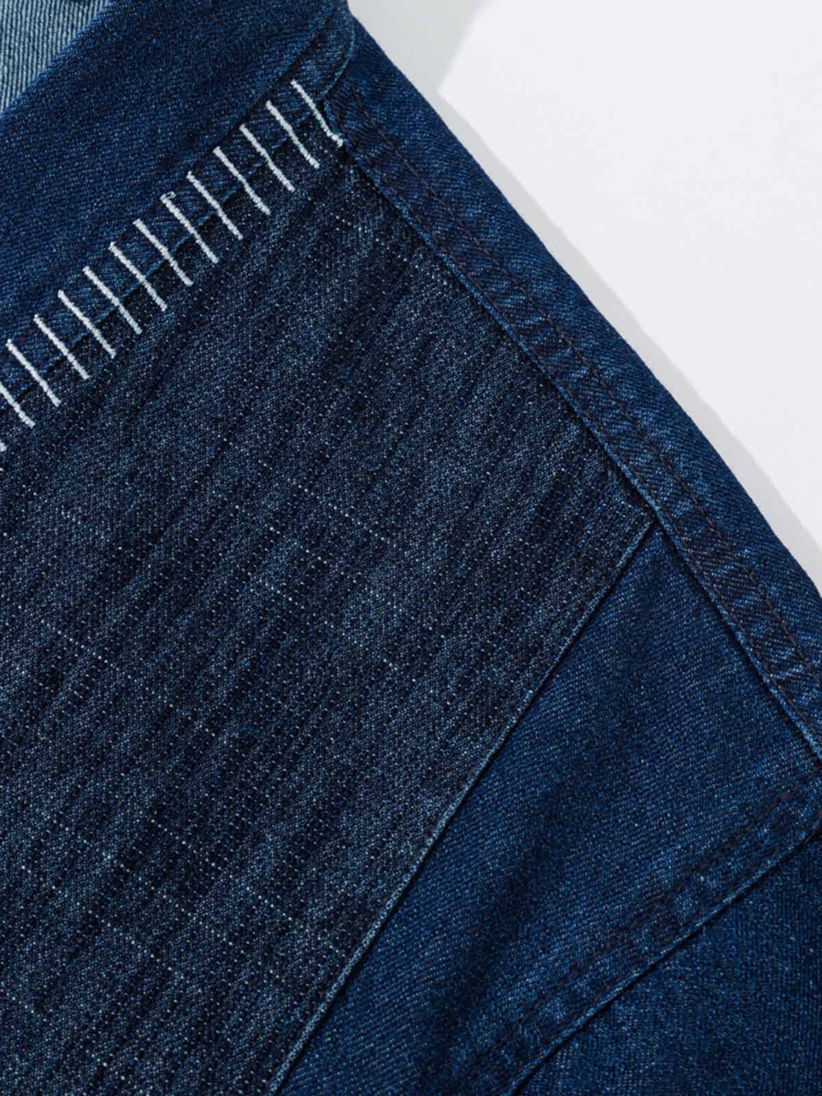 立体的なジャガードストライプとパッチワーク技法を組み合わせたウォッシュ加工デニムシャツ。レトロ感と現代的なファッションが融合。