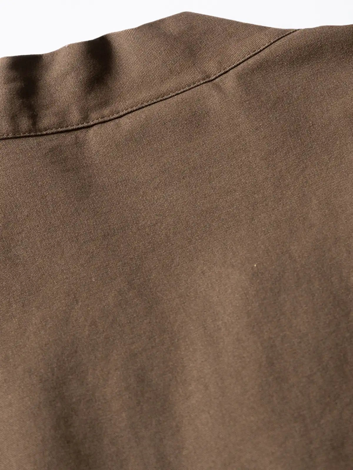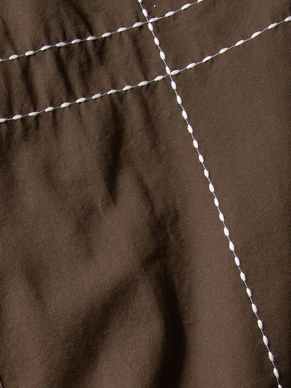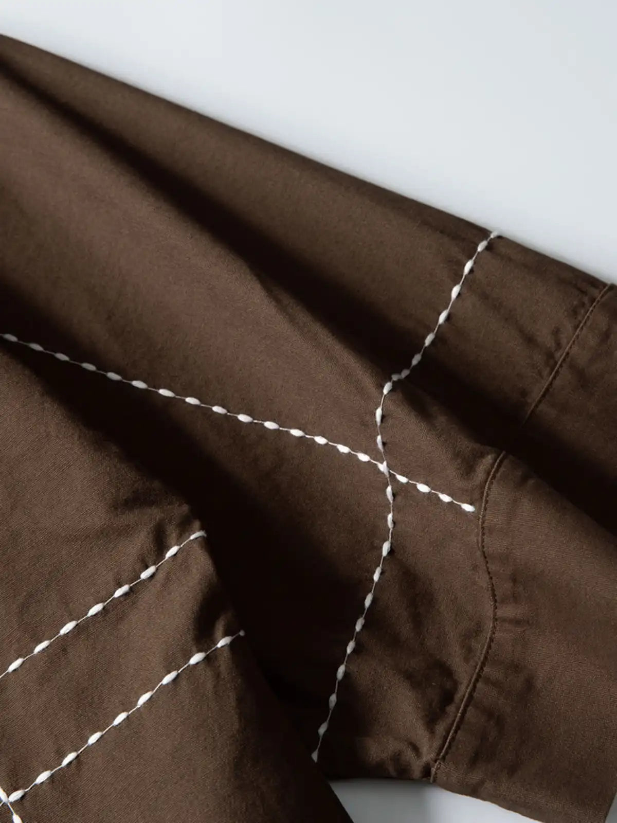 刺し子生地ならではの凹凸のある質感と、水洗い加工によるソフトな風合いが特徴。軽く通気性が良いため、季節の変わり目や夏場でも快適に着用可能です。