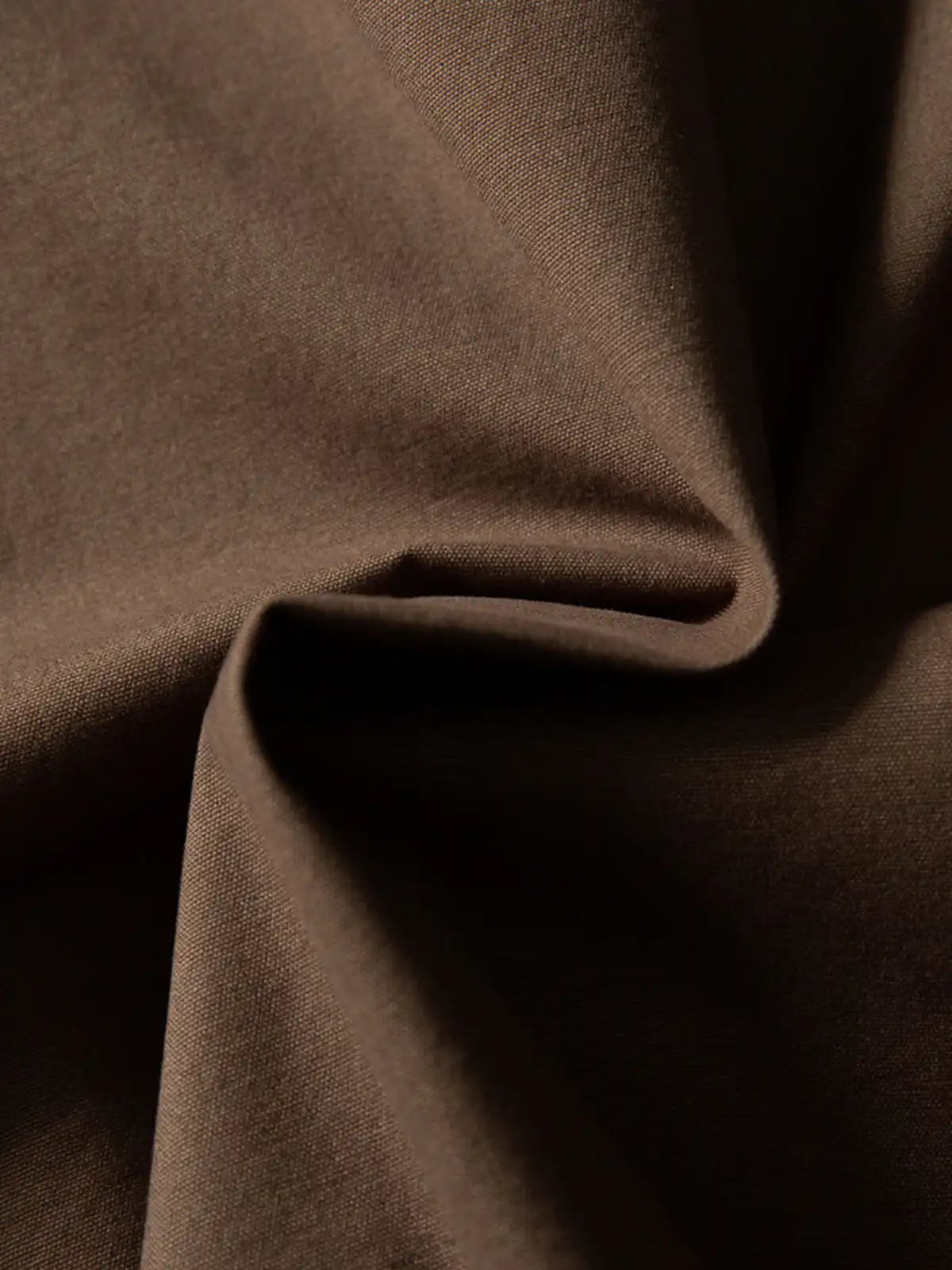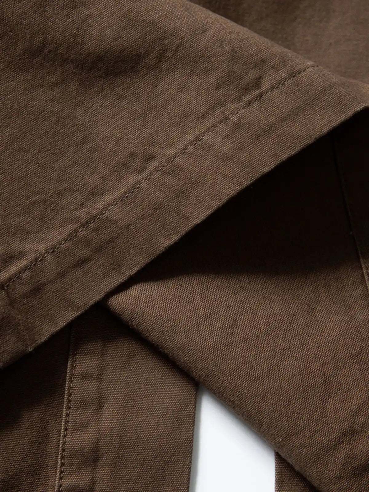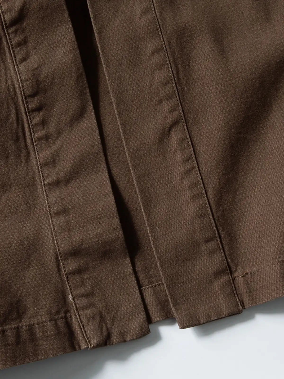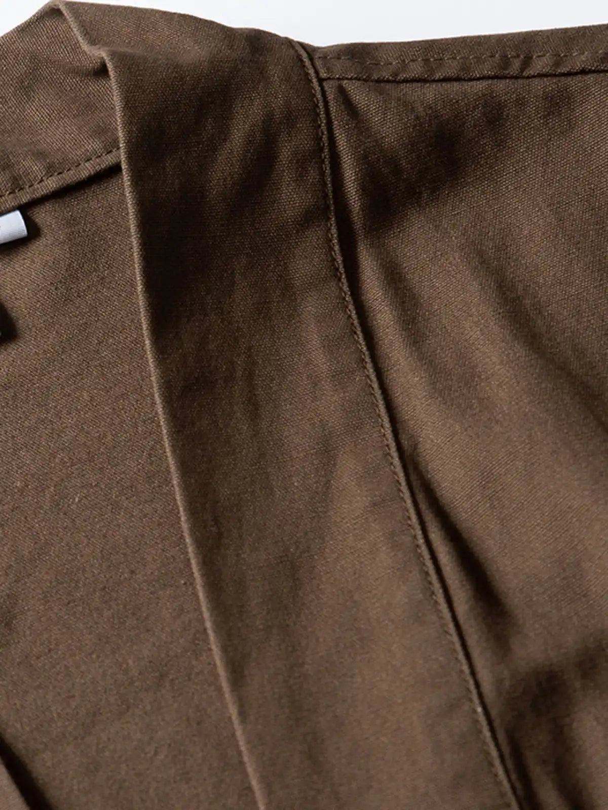 刺し子生地ならではの凹凸のある質感と、水洗い加工によるソフトな風合いが特徴。軽く通気性が良いため、季節の変わり目や夏場でも快適に着用可能です。